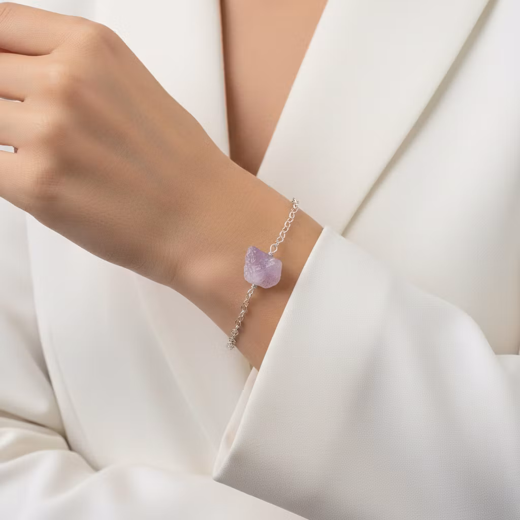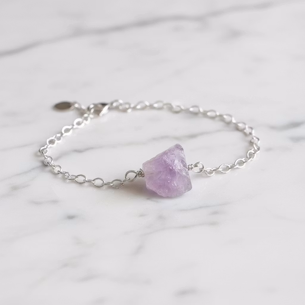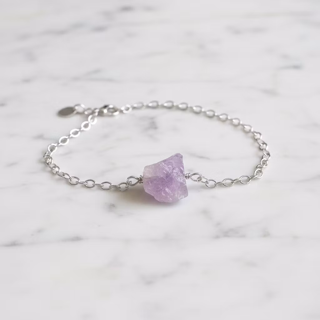 Rå ametist armband i äkta silver med kedja och liten oval 925 silver stämplad berlock vid låset. Ett smalt silverarmband med ca 12mm lång grov ljuslila ametist sten. Kedjan är oval och 2,7mm bred. Då ametisten är äkta naturlig är alla stenar olika. Form och mått på ametisterna skiljer sig lite åt. Hylla naturens skönhet med detta vackra råa ametist armband med natursten.