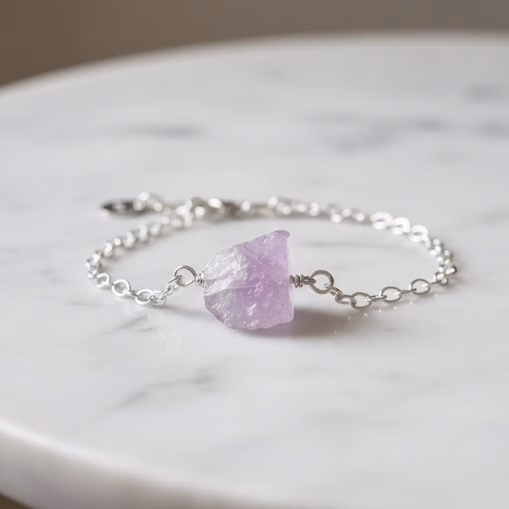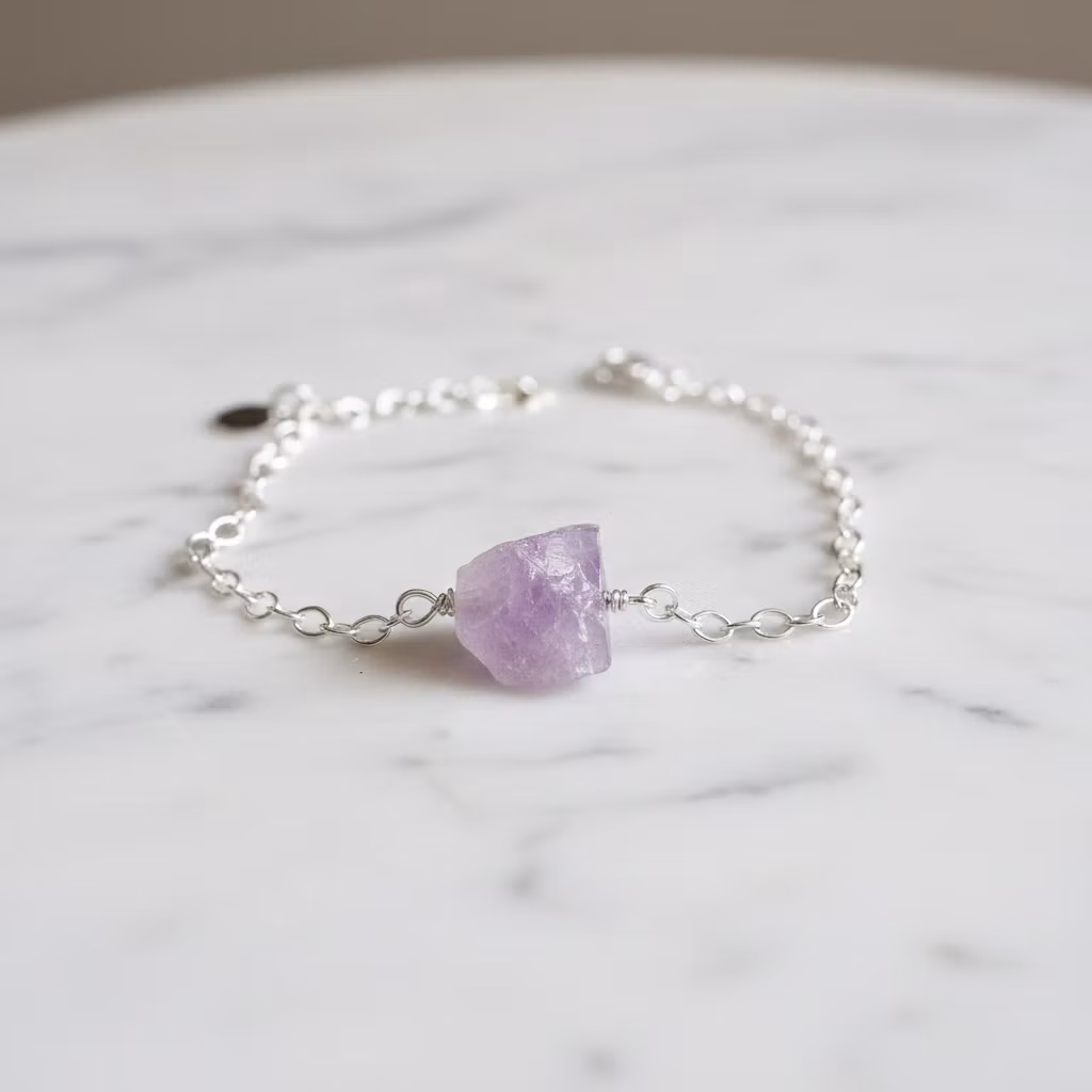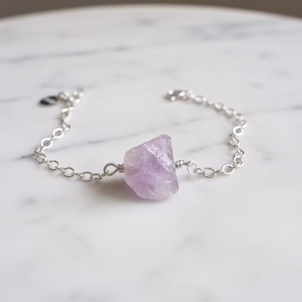 Rå ametist armband i äkta silver med kedja och liten oval 925 silver stämplad berlock vid låset. Ett smalt silverarmband med ca 12mm lång grov ljuslila ametist sten. Kedjan är oval och 2,7mm bred. Då ametisten är äkta naturlig är alla stenar olika. Form och mått på ametisterna skiljer sig lite åt. Hylla naturens skönhet med detta vackra råa ametist armband med natursten.