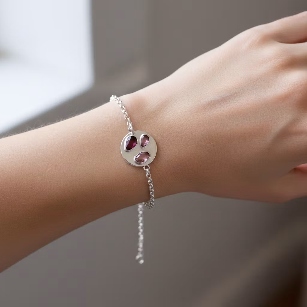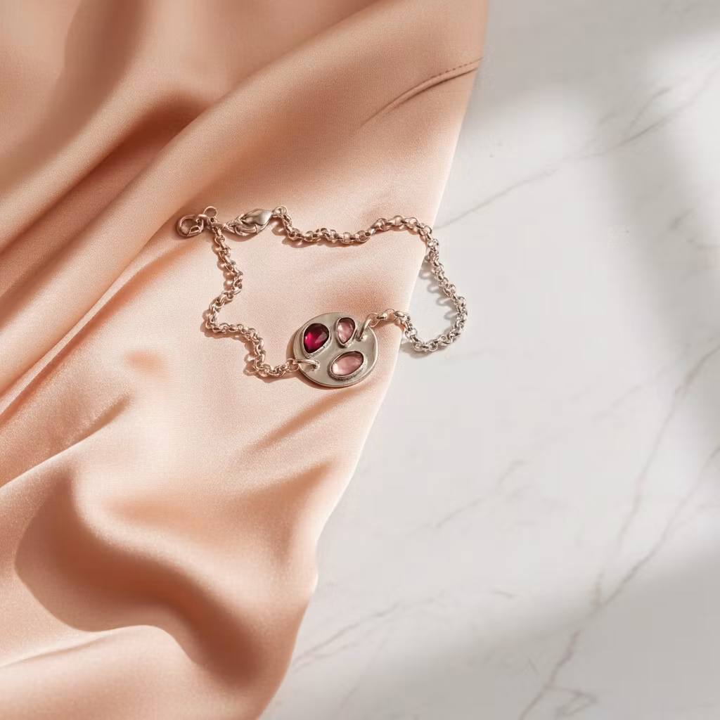 Rhodolit granat armband i äkta silver med 15mm rund hamrad bricka med tre små fasettslipade granater i olika röda och rosa nyanser. Vackert och elegant silverarmband med 2,5mm bred ärtlänkskedja och små granat ädelstenar i olika former, mått och nyanser. Månadsstensarmband januari. Polerduk medföljer.