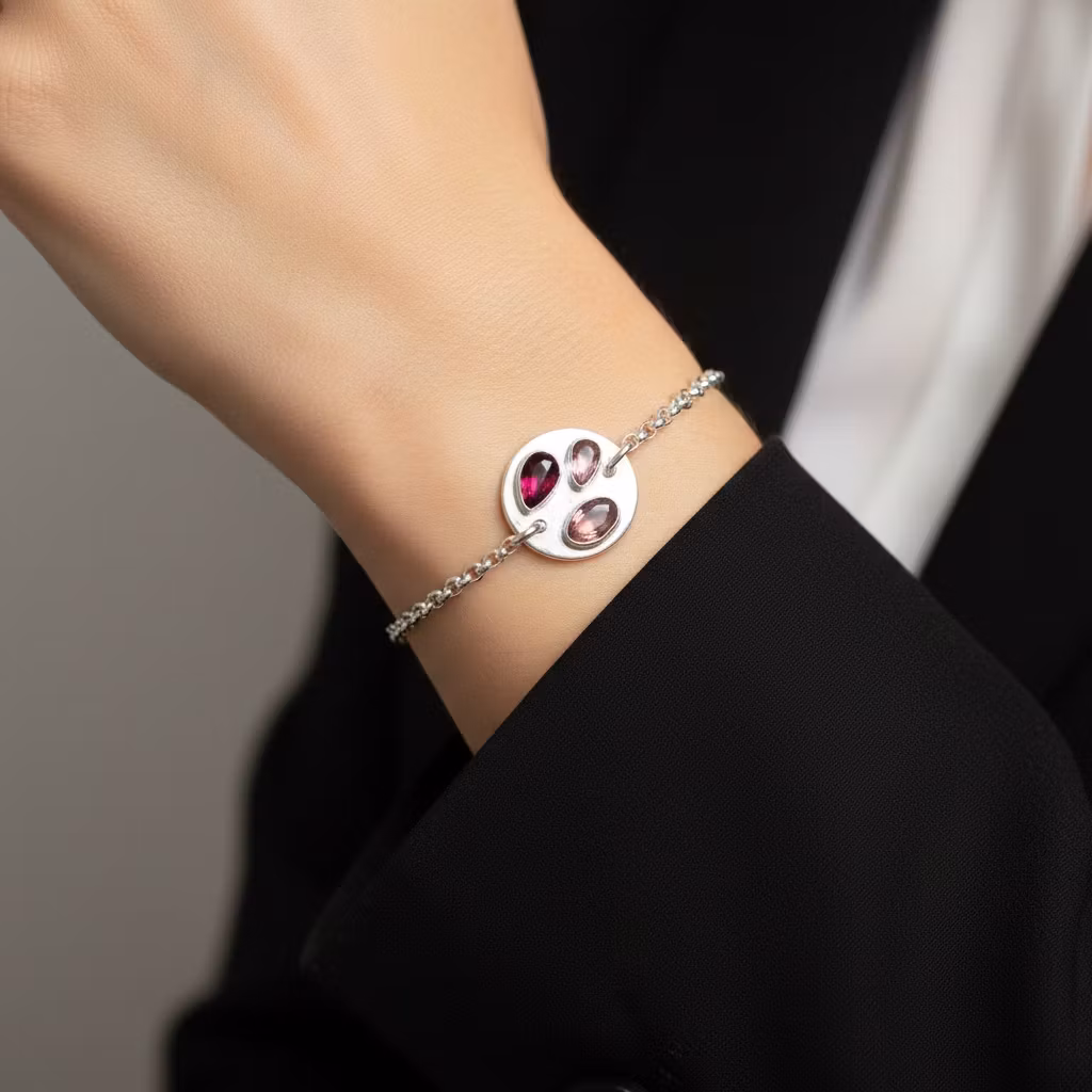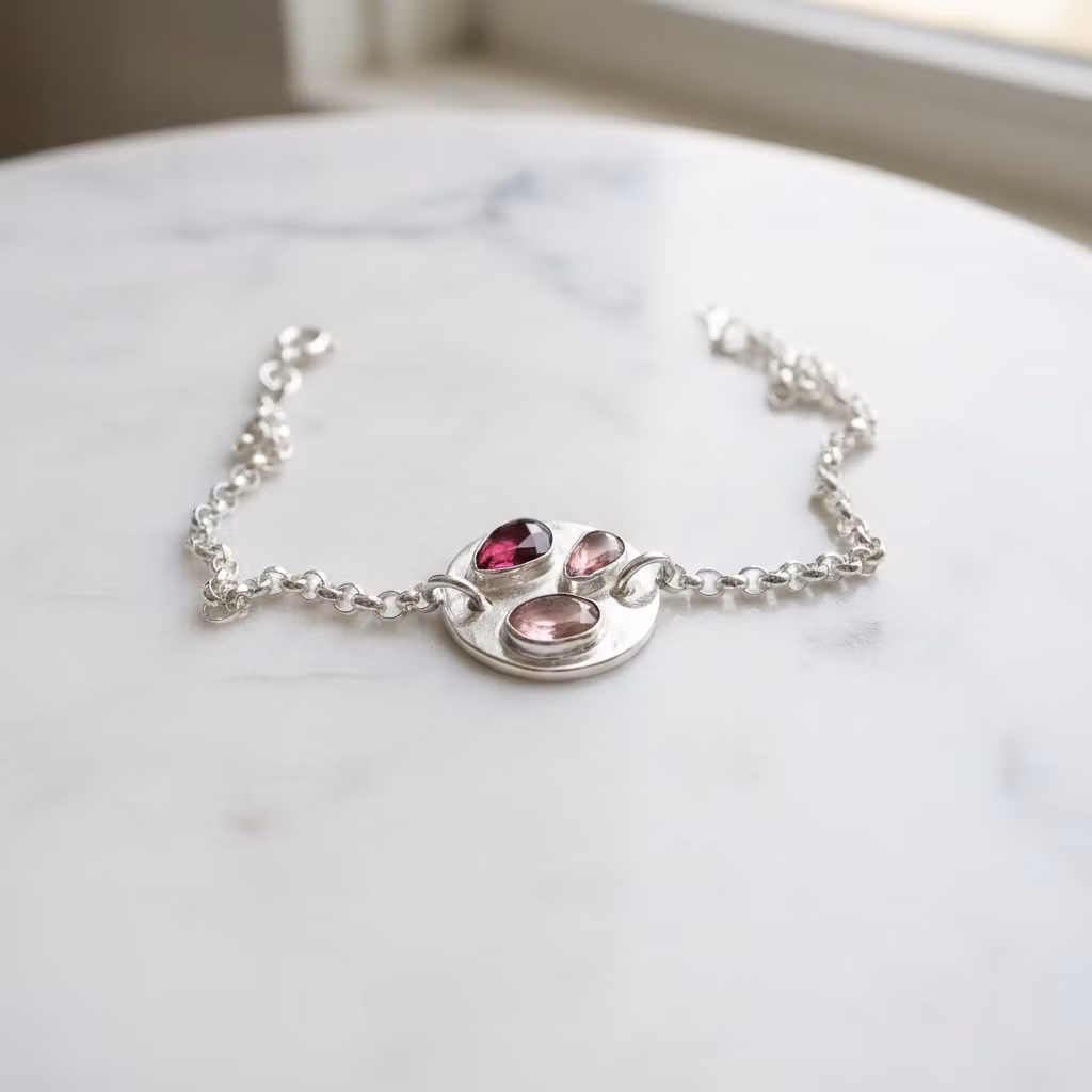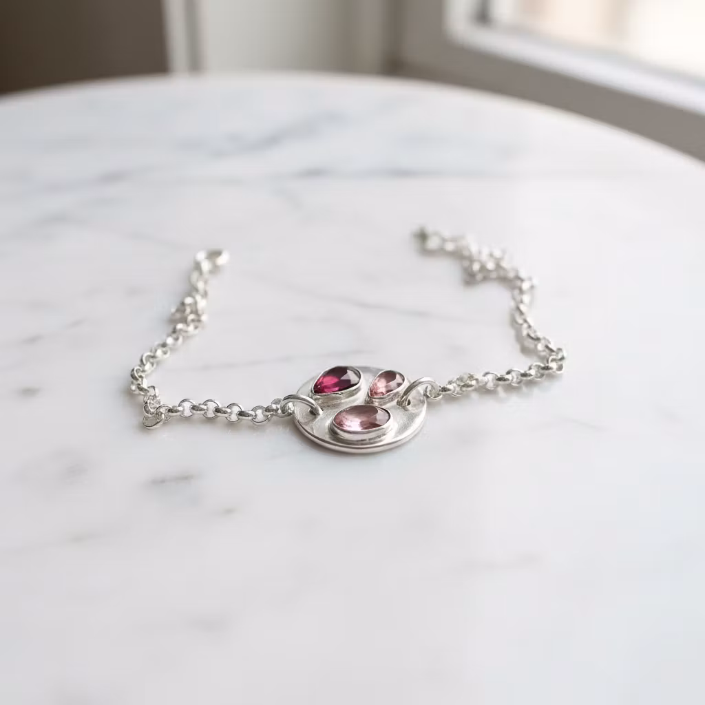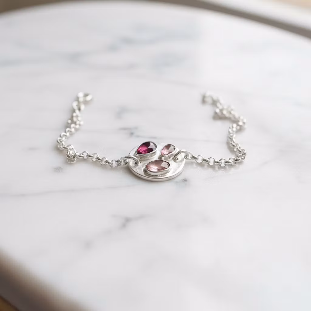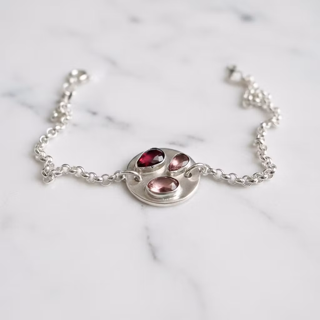 Rhodolit granat armband i äkta silver med 15mm rund hamrad bricka med tre små fasettslipade granater i olika röda och rosa nyanser. Vackert och elegant silverarmband med 2,5mm bred ärtlänkskedja och små granat stenar i olika former, mått och nyanser. Månadsstensarmband januari. Polerduk medföljer.