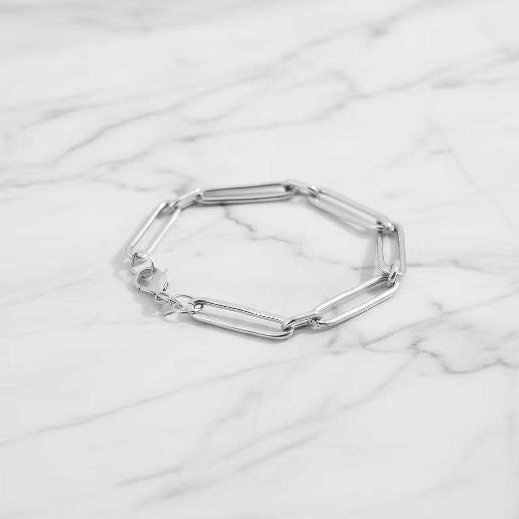 Handgjort kedjearmband av äkta silver med 2mm tjocka avlånga länkar. Silverarmbandet är skapat från återvunnet sterling silver med ca 25mm långa länkar. Armbandets bredd är 6mm-7mm brett och stängs med 14mm stort klolås. Det här eleganta silverarmbandet passar för klassiska och tidlösa stilar och är perfekt för dig som söker efter tjockare och större kedja armband. Polerduk medföljer.