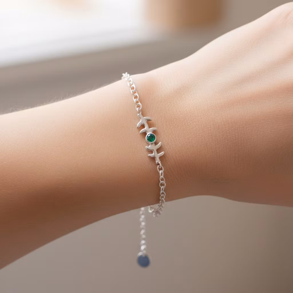 Smalt silverarmband med kedja, gren och grön slipad onyx sten. Stenen är 3mm och grenen är ca 20mm lång. Armbandet är tillverkat i äkta silver. Naturinspirerat grenarmband med liten grön ädelsten. Det här fina armbandet finns endast i ett exklusivt exemplar, vilket innebär att du blir ensam om att äga det. Polerduk medföljer.