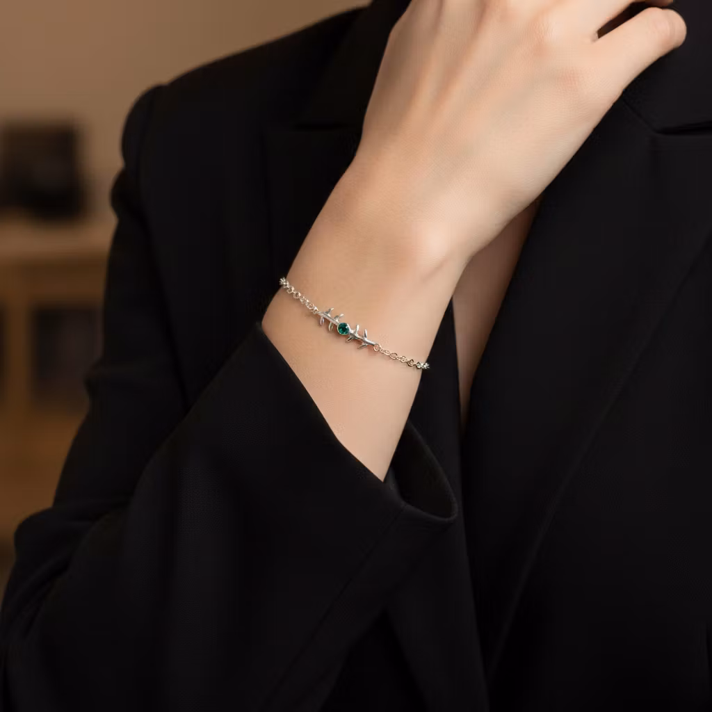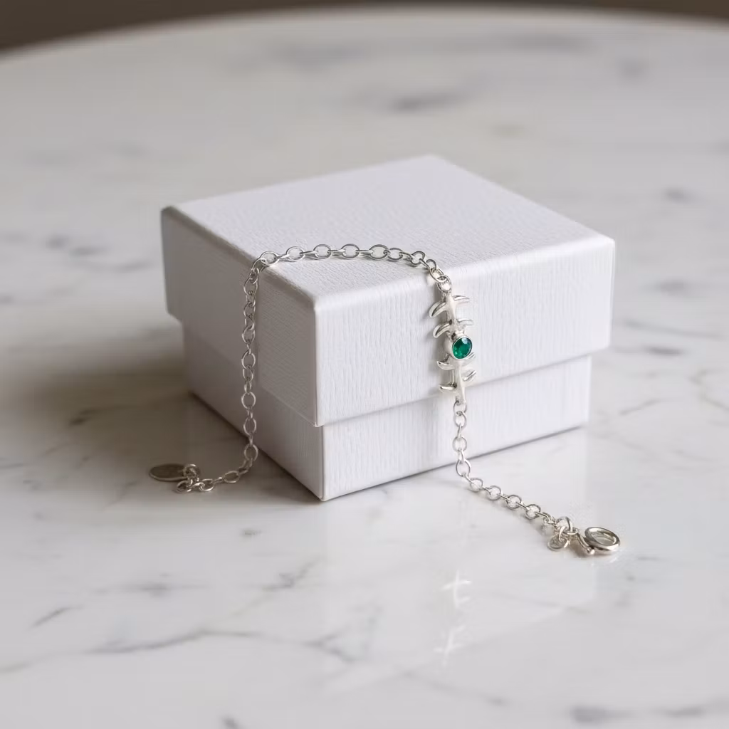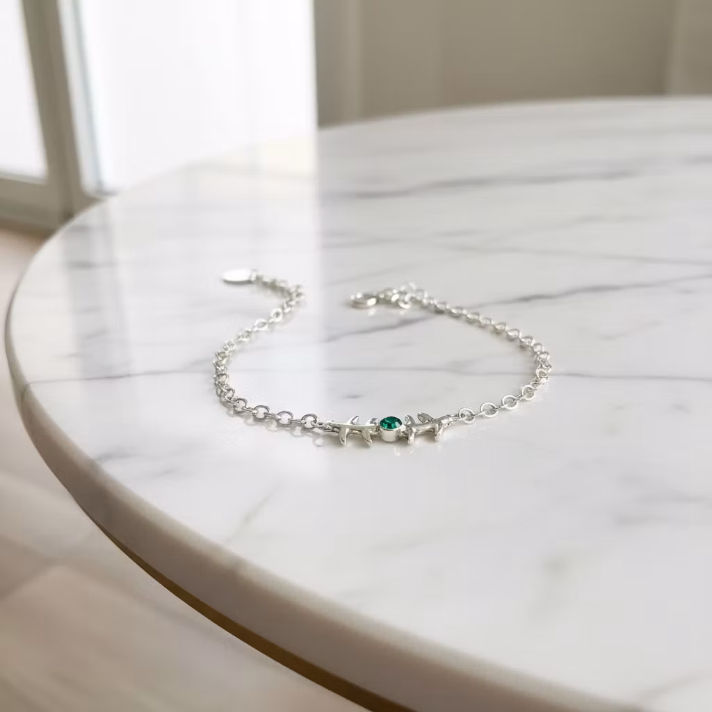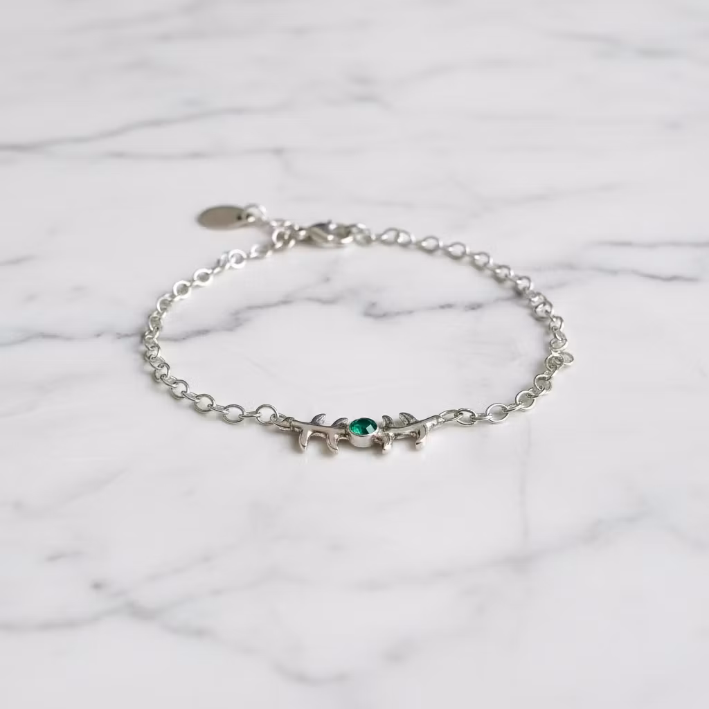 Smalt silverarmband med kedja, gren och grön slipad onyx sten. Stenen är 3mm och grenen är ca 20mm lång. Armbandet är tillverkat i äkta silver. Naturinspirerat gren armband med liten grön glänsande ädelsten. Det här fina armbandet finns endast i ett exklusivt exemplar, vilket innebär att du blir ensam om att äga det. Polerduk medföljer.
