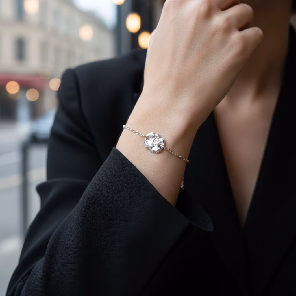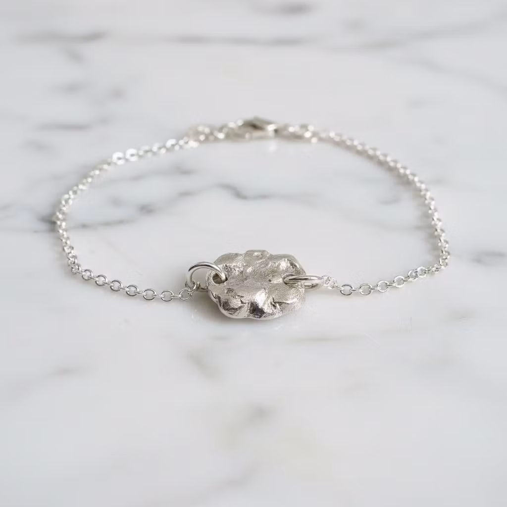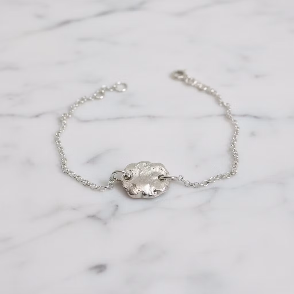 Äkta silverarmband med ärtlänkskedja och rustik organisk bricka, nugget. Armbandet är tillverkat från smält återvunnet sterling silver och brickan är grovfilad för en rustik look. Brickan är ca 17mm lång och ca 2-3mm tjock. Alla armband är unika då armbandet har en organisk form. Stilfullt armband med silverkedja och tjock bricka. Polerduk medföljer.