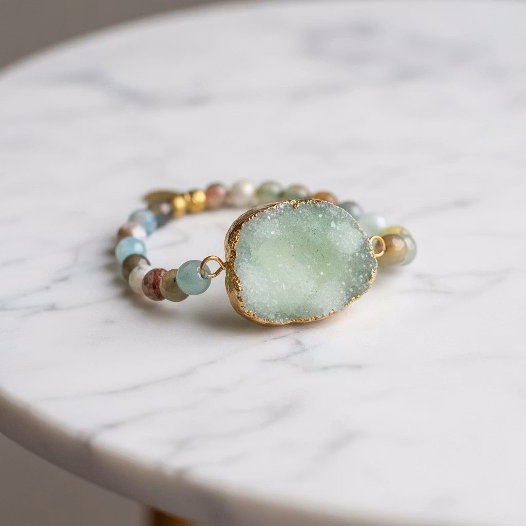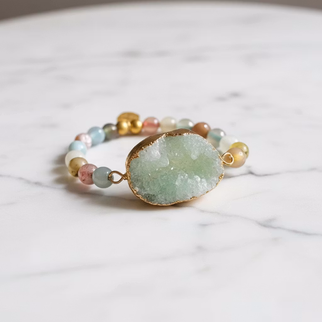 Elastiskt agat armband i härlig pastellmix med olika pastellfärgade fasettslipade agatstenar och ljusgrön Druzy agat sten i fokus. Stenarna är 8mm stora. Armbandet har olika ljusa jordnära nyanser av grönt, brunt, beige, blå, rosa och vit.