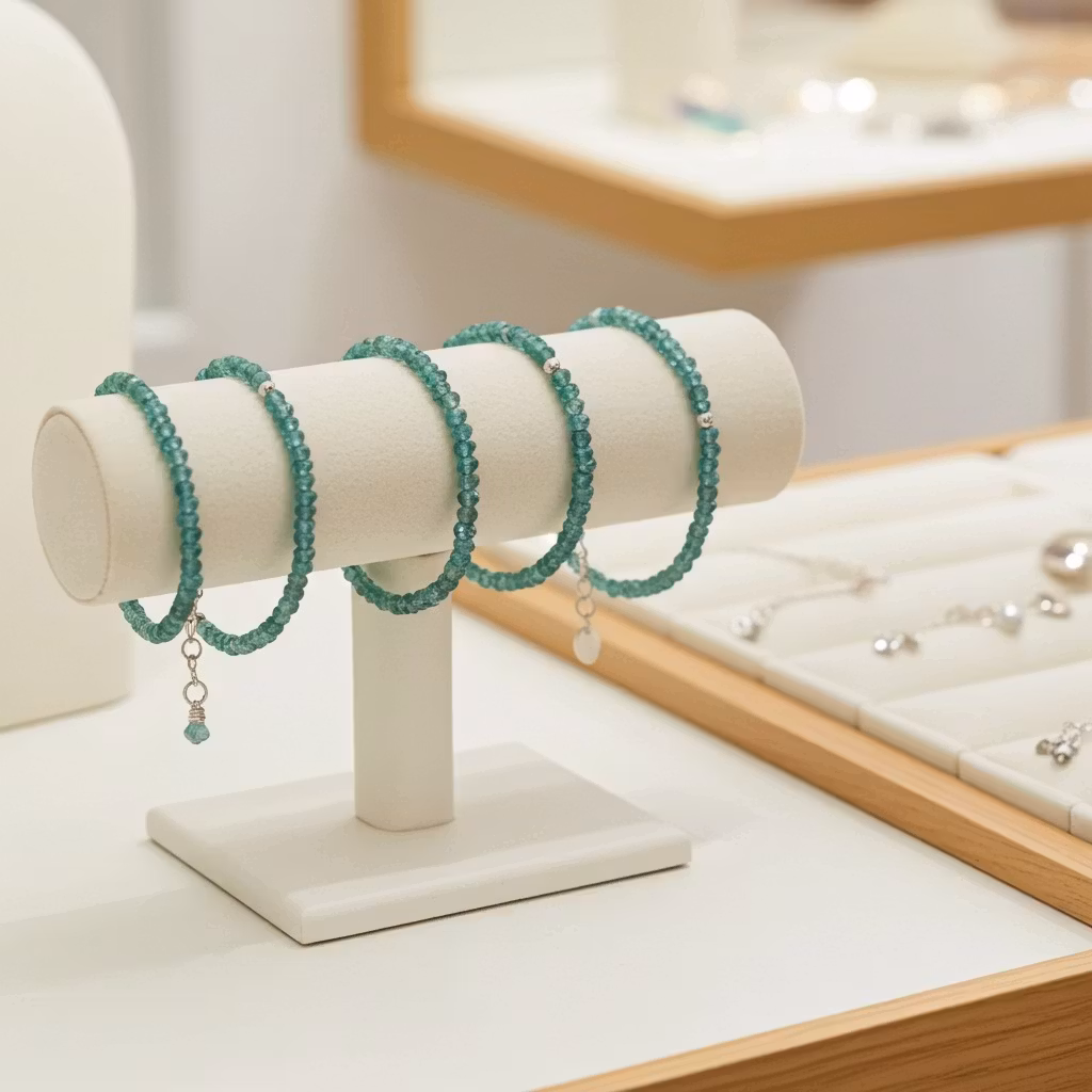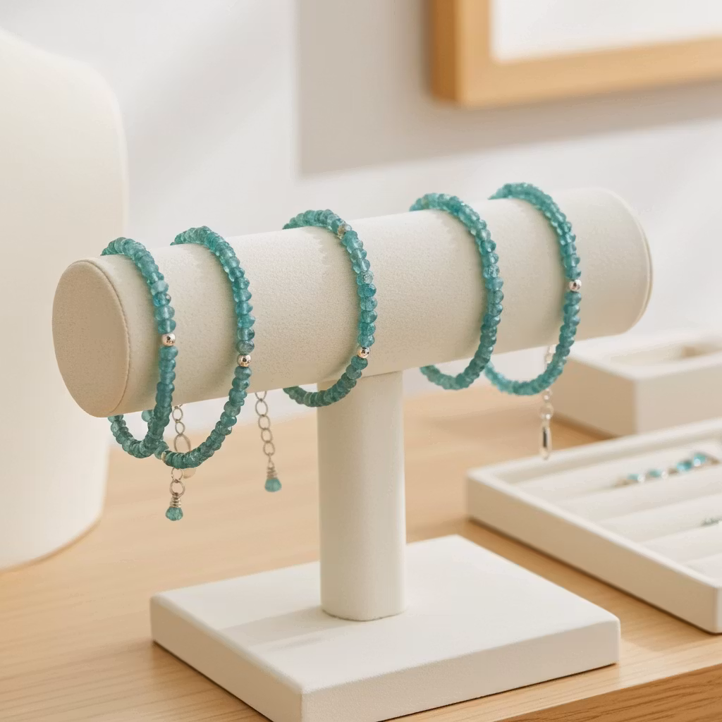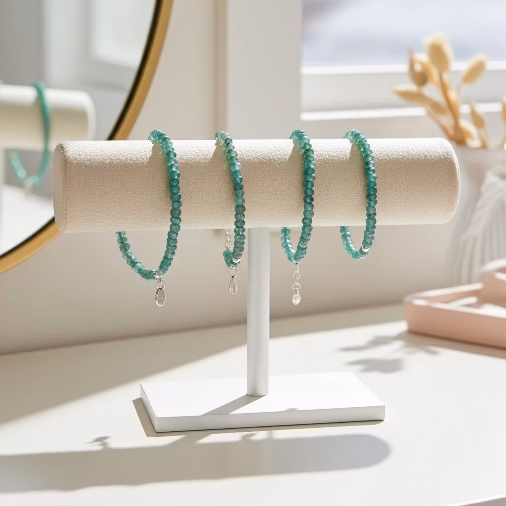 Neon blå apatit armband i äkta silver med små blå kristaller. Smalt silverarmband med neonblå facettslipade apatitstenar med berlock och stilrena detaljer. Blå kristallarmband i sterling silver med 3mm genuina apatiter. Armbandet är reglerbart i storleken med förlängningskedja. Elegant armband med blå kristallädelstenar.
