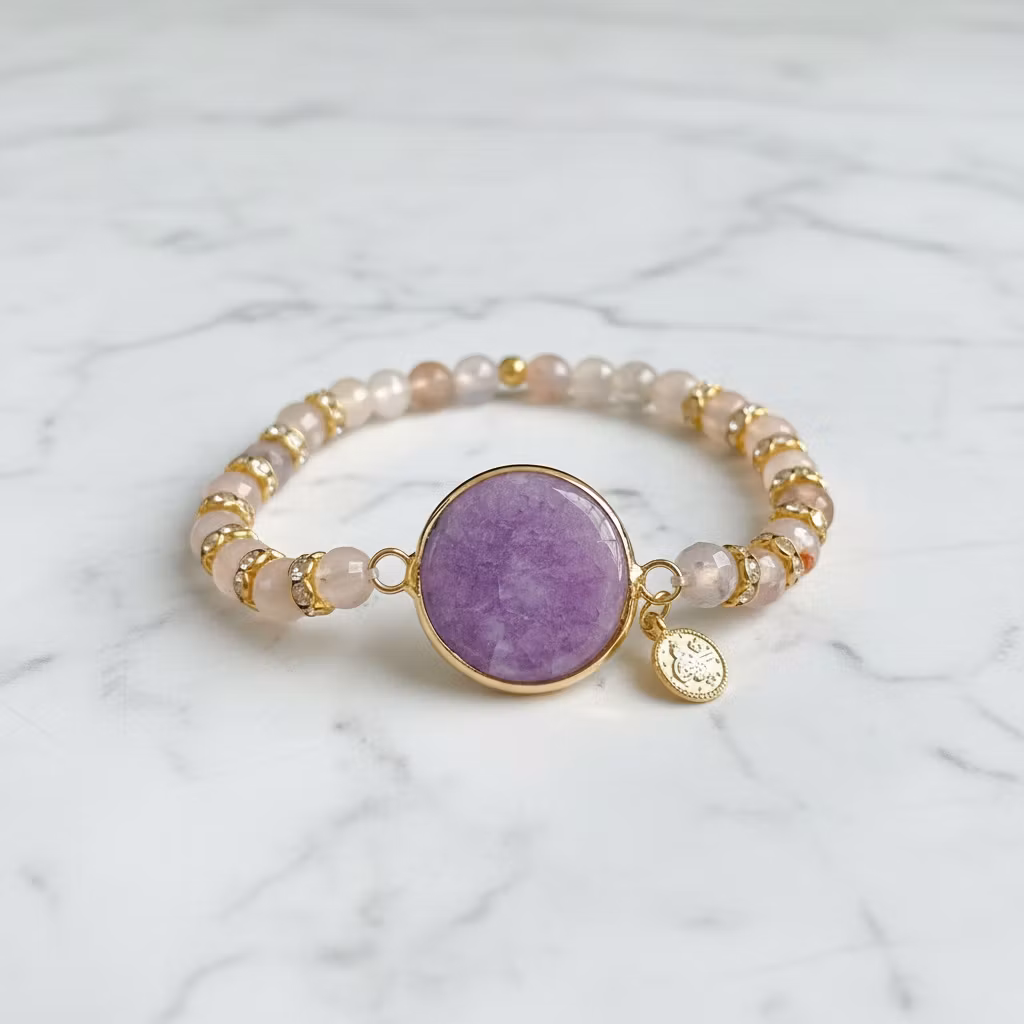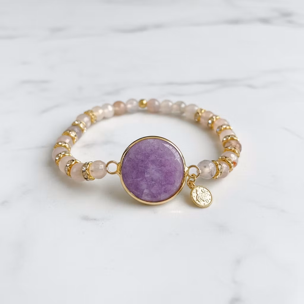 Elastiskt armband med mixade grå agatstenar. Grått ädelstensarmband med lila rund fasettslipad agatsten med en mix av 6mm slipade gråa agater i olika nyanser. Vackert agat armband med berlock och gnistrande fina strassdetaljer. Unikt armband i ett exklusivt exemplar.