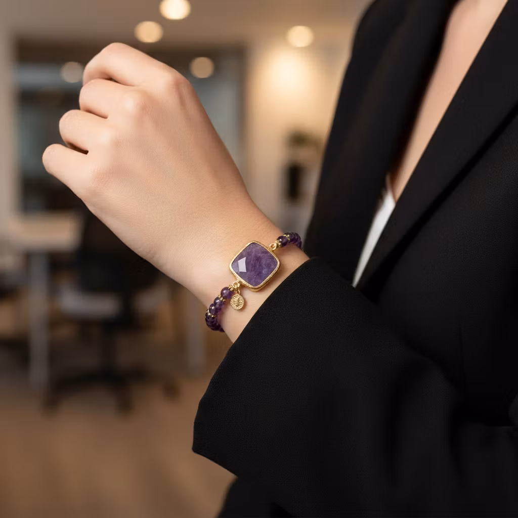 Armband med lila ametiststenar, jade och liten berlock med guldpläterade vackra detaljer. Ädelstensarmband med fasettslipad fyrkantig lila jadesten och 6mm runda släta ametister. Armbandet är elastiskt. Lila vackert kristall armband i ett exklusivt exemplar.