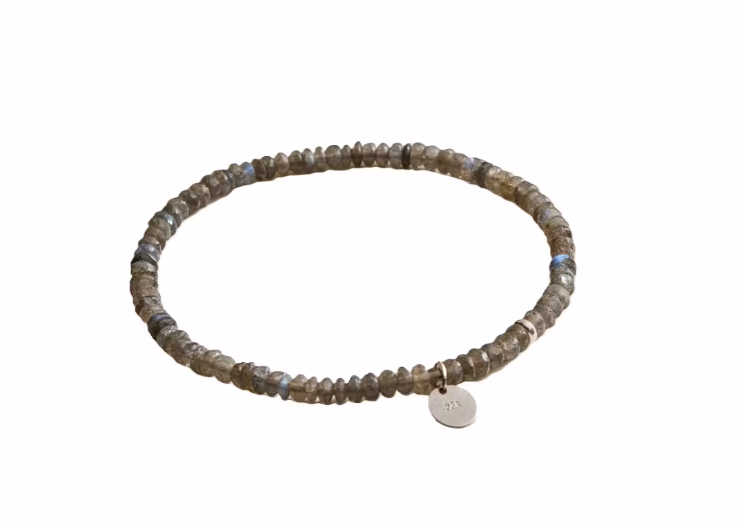 Smalt labradorit armband i äkta 925 sterling silver med 4mm slipade labradoriter. Ett smalt ädelstensarmband med stilrena detaljer och liten oval berlock med 925 stämpel. Silverarmband med glittrande vackra labradoritkristaller.