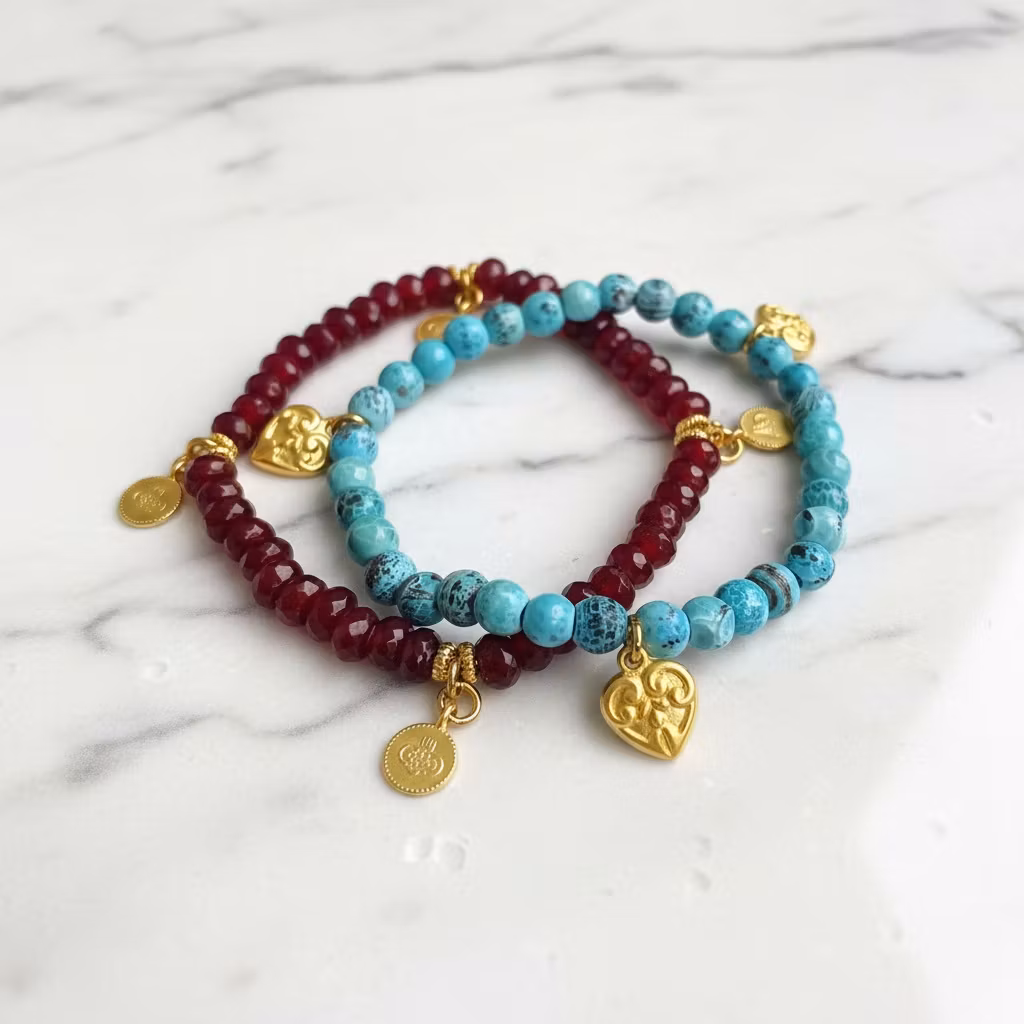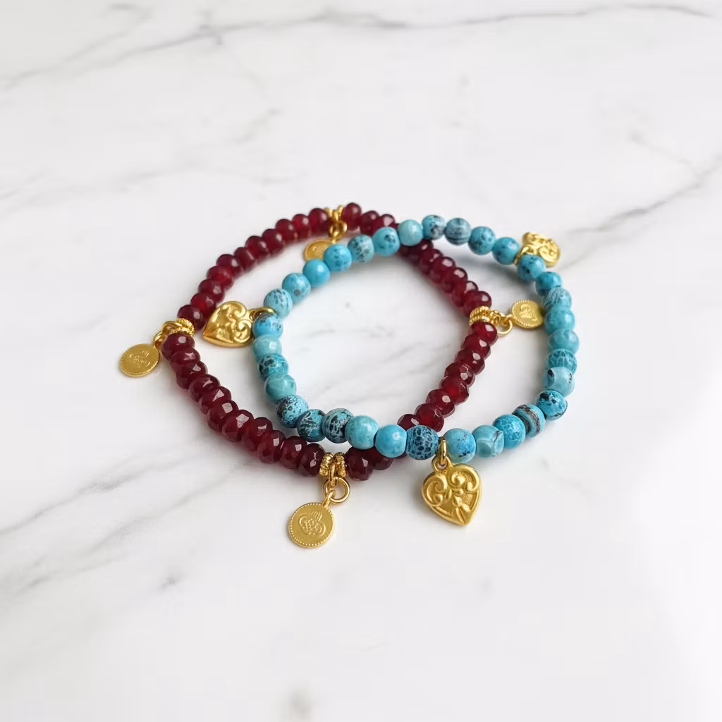 Pärlarmband set med ädelstenar och guldförgyllda berlocker. Armbandsetet innehåller två matchande elastiska armband i färgerna turkosa och rött. Det röda armbandet är av slipade jaspis rondeller och det turkosa av turkoser. Stenarna är 4mm och 6mm små. Vackert armband set med ädelstenar och hjärtan som passar utmärkt som kärleksgåva eller för en vacker glamourös stil.