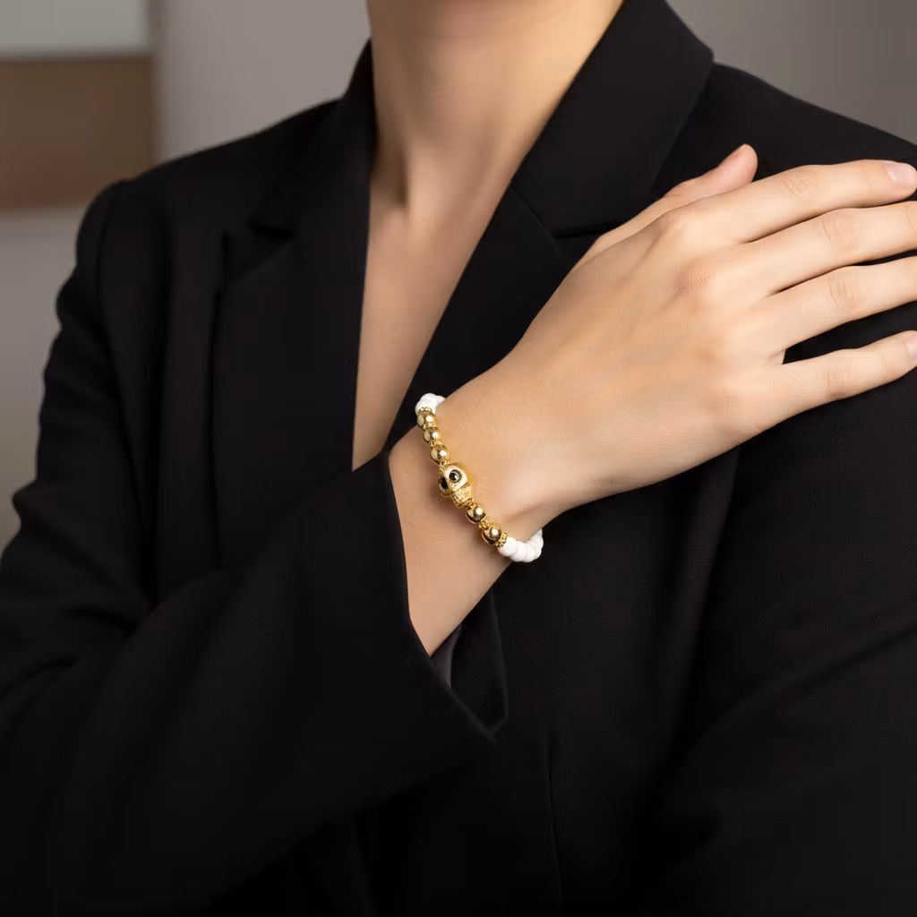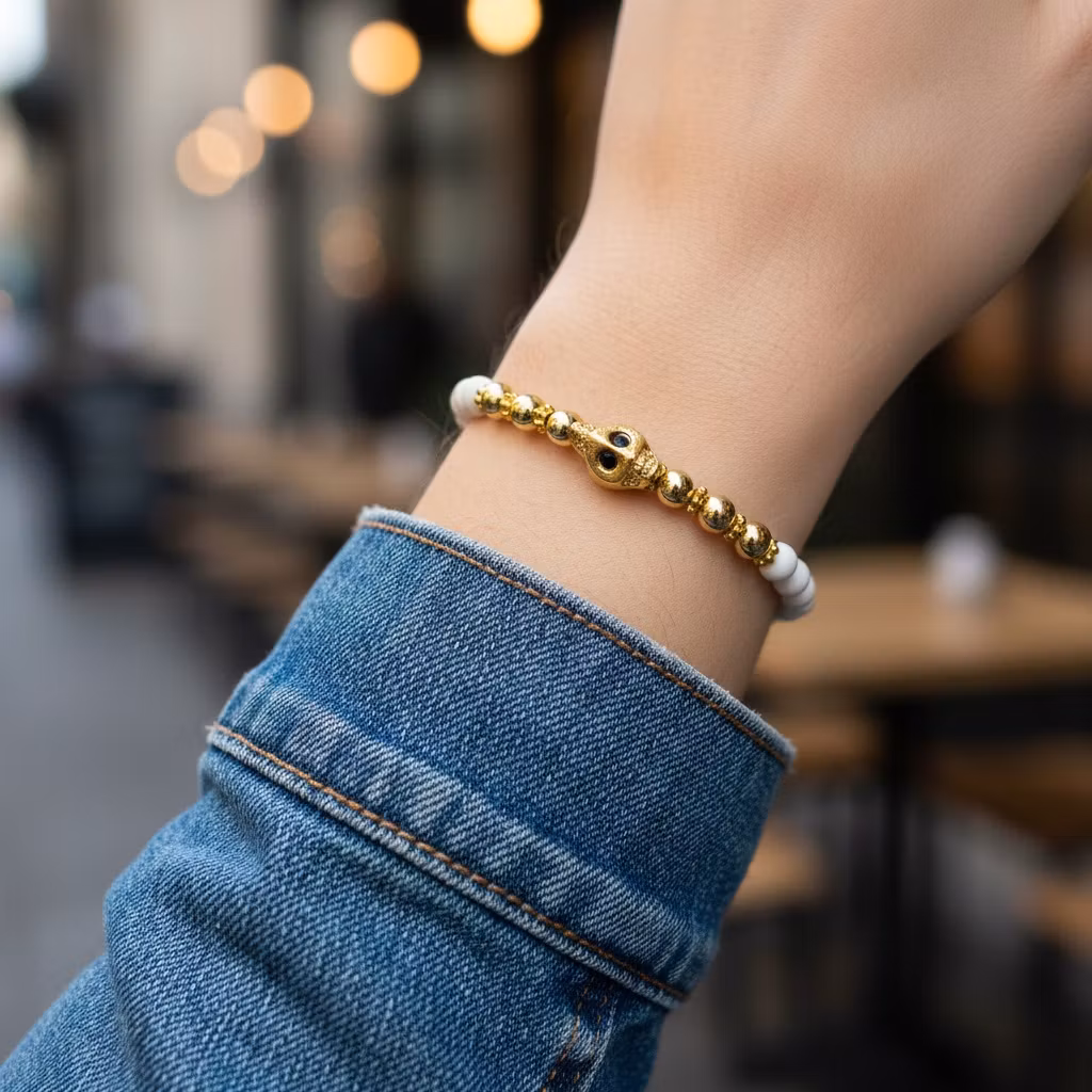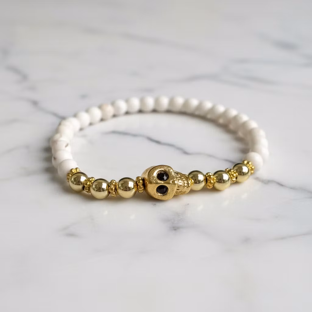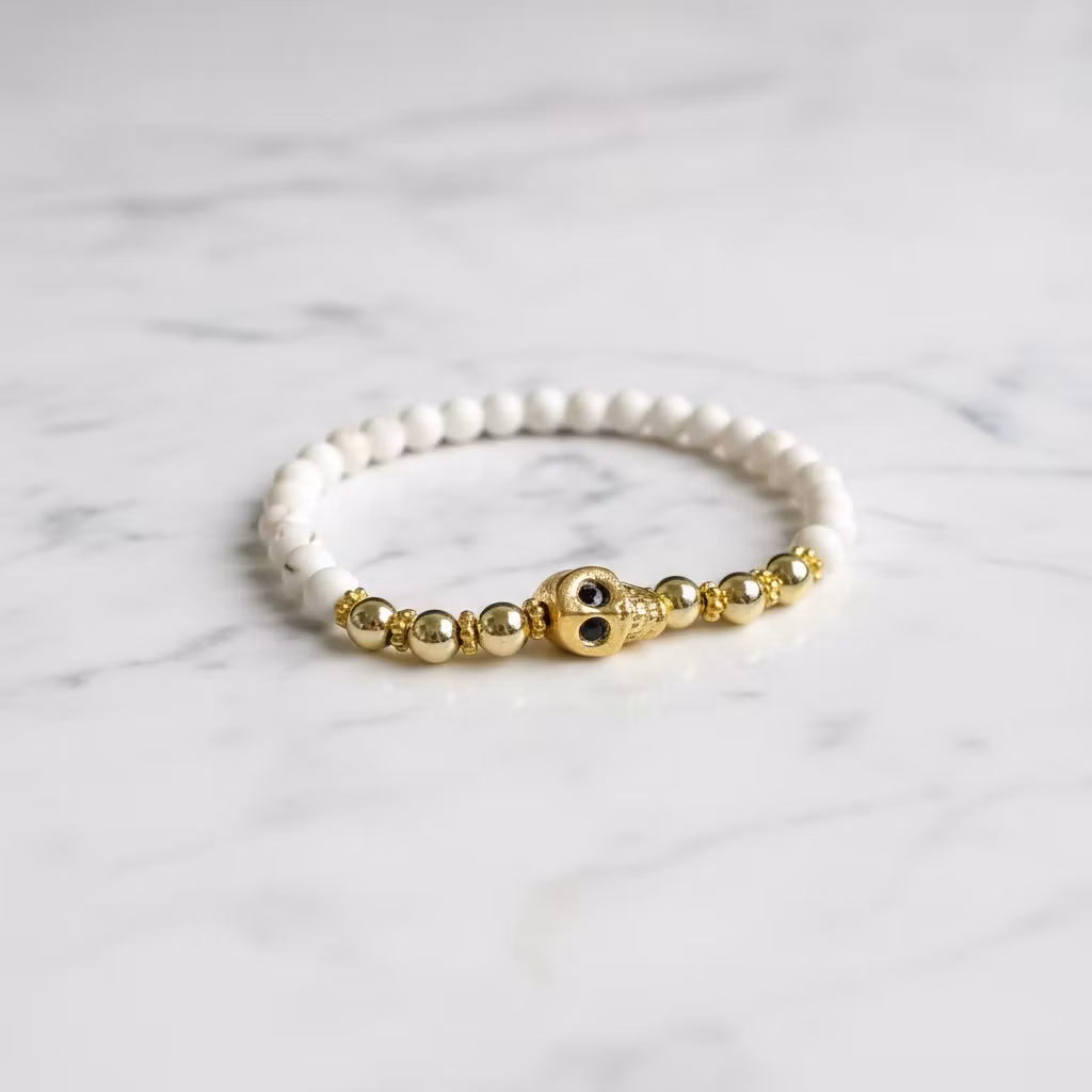 Vitt elastiskt pärlarmband med guldpläterade kulor och döskalle. Armbandet har 6mm vita släta stenpärlor och guldfärgad döskalle med svarta ögon som glittrar av strass. Trendigt armband med vita stenar och döskalle.