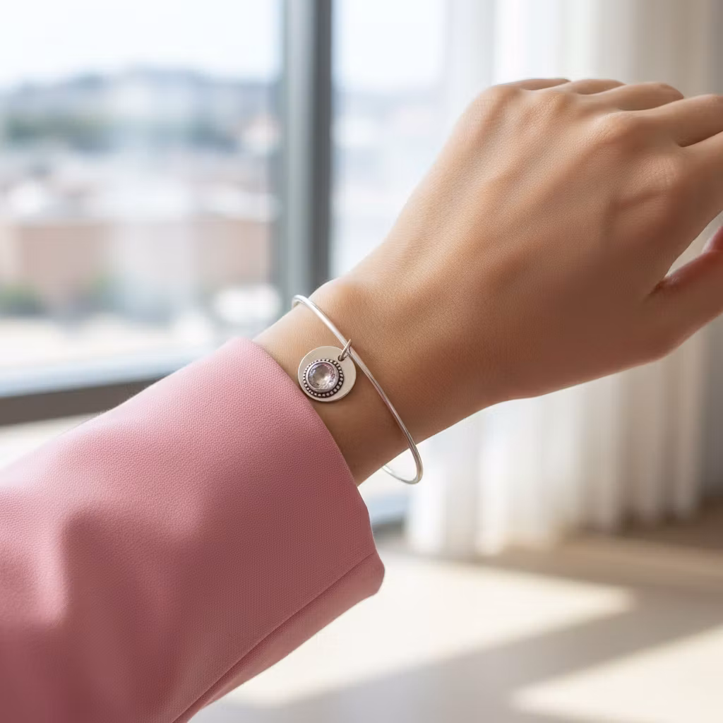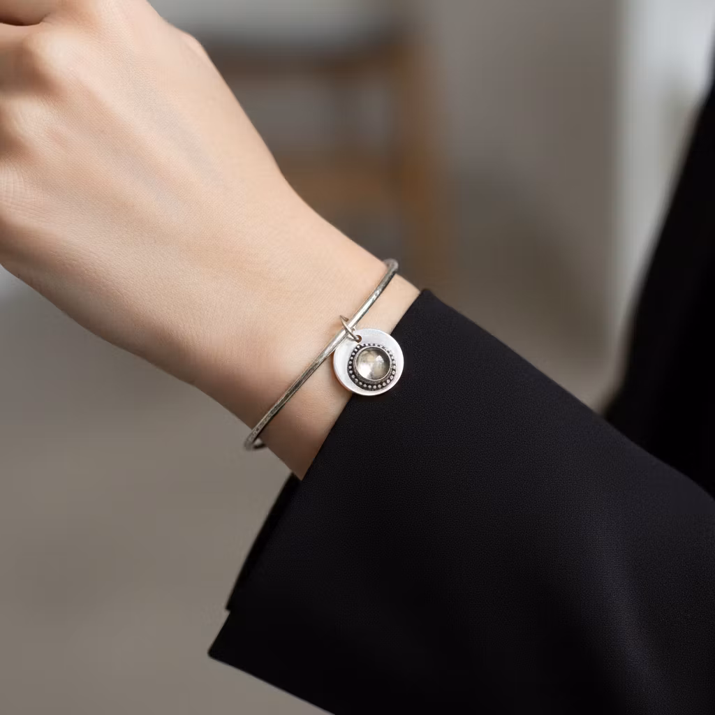 Armring i äkta silver med stor rund berlock och 8mm champagnefärgad rund Zirkon sten. Armringen har en hamrad lätt oxiderad yta och är 2mm tjock. Berlock armband av återvunnet sterling silver. Putsduk medföljer.