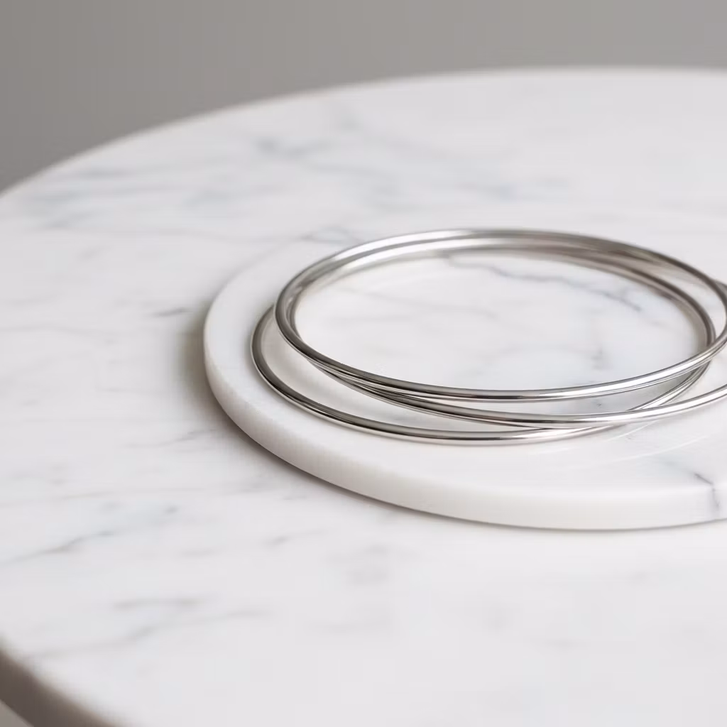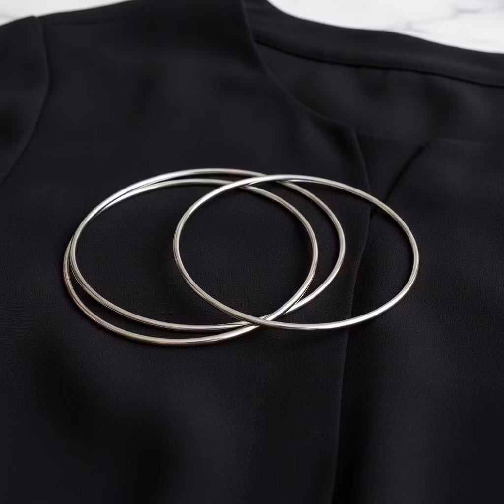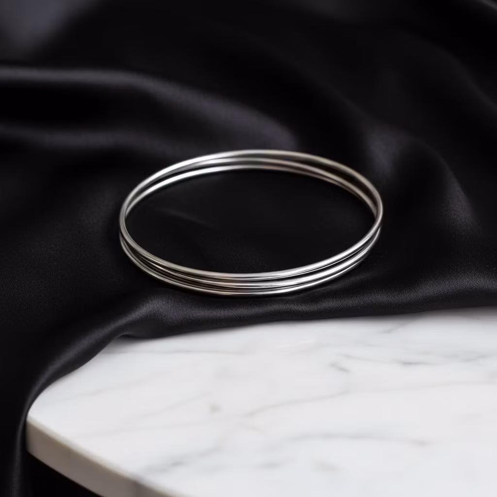 Flerpack med klassiska bangle armband i äkta silver. Stilrent set med stela silverarmband skapade av återvunnet sterling silver. Armringarna är 2mm tjocka och breda och har en glänsande blank finish. Välj mellan släta armringar, hamrade eller mixade (hamrade + släta armringar). Det här tidlösa 3-packet passar för alla tillfällen. Putsduk medföljer.