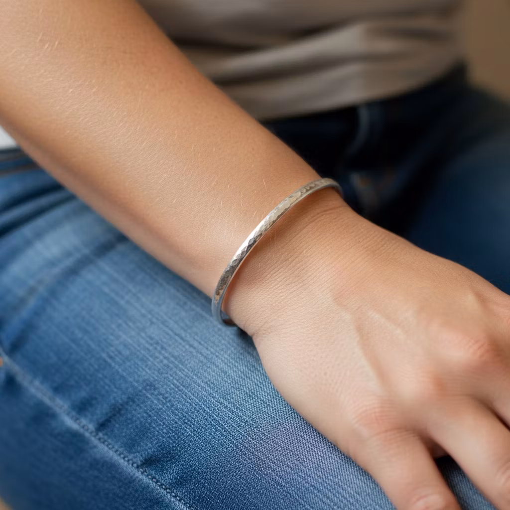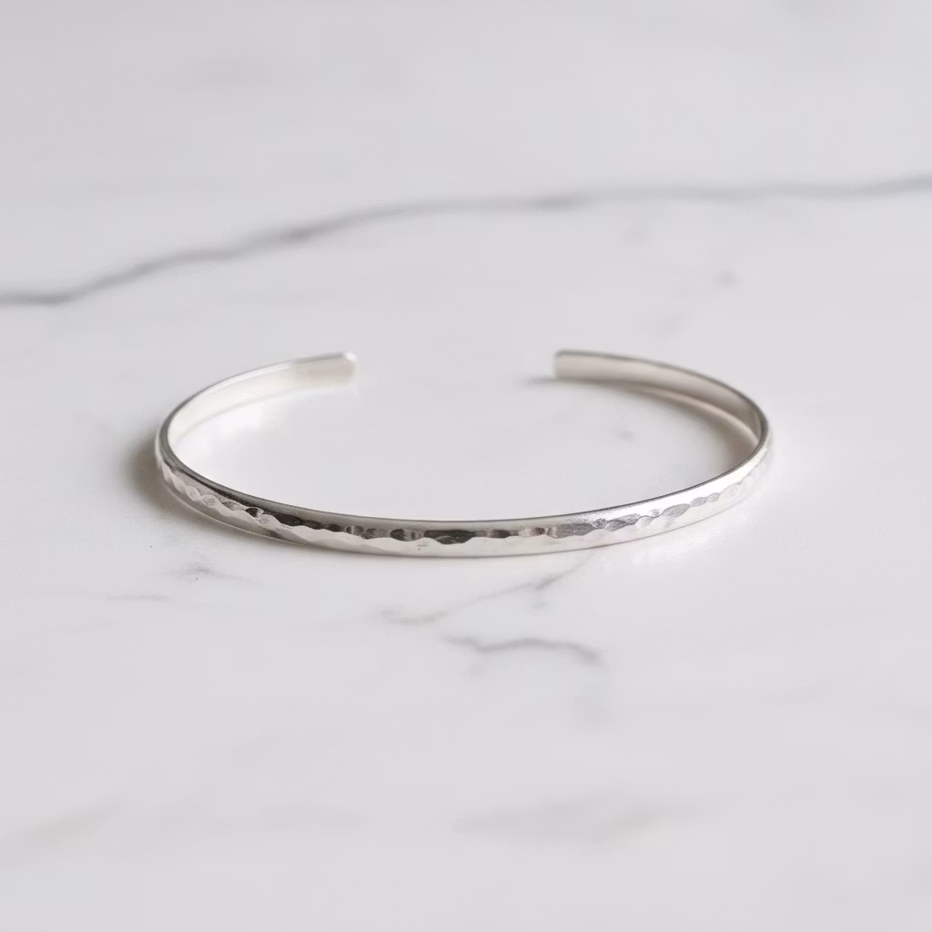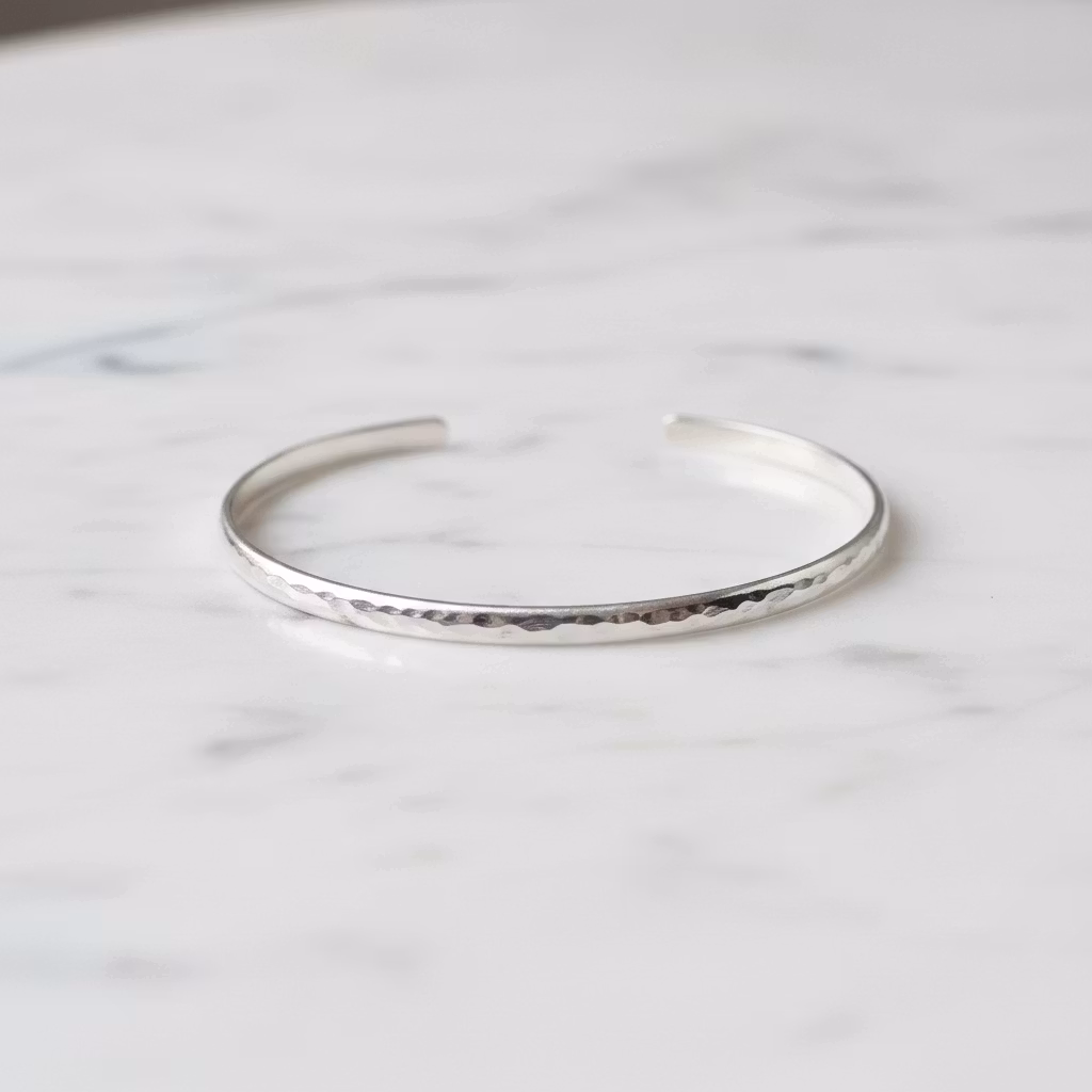 Stelt silverarmband med öppning i justerbar storlek. Cuff armbandet har en blankpolerad yta och du kan välja mellan hamrad eller slät yta. Armbandet är 3mm bred och är halvrund i formen. Armbandet är skapat i 935 sterling silver och är ställbar. Klassiskt silverarmband i tidlös och elegant design. Polerduk medföljer.