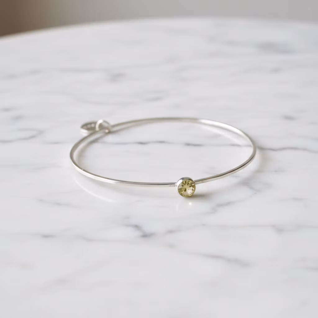 Stelt lemon kvarts kristall armband i äkta silver med hamrad smal armring och fasettslipad gul lemon kvarts kristall. Stilrent bangle armband med 6mm ljusgul rund citronkvarts och berlock. Polerduk medföljer.