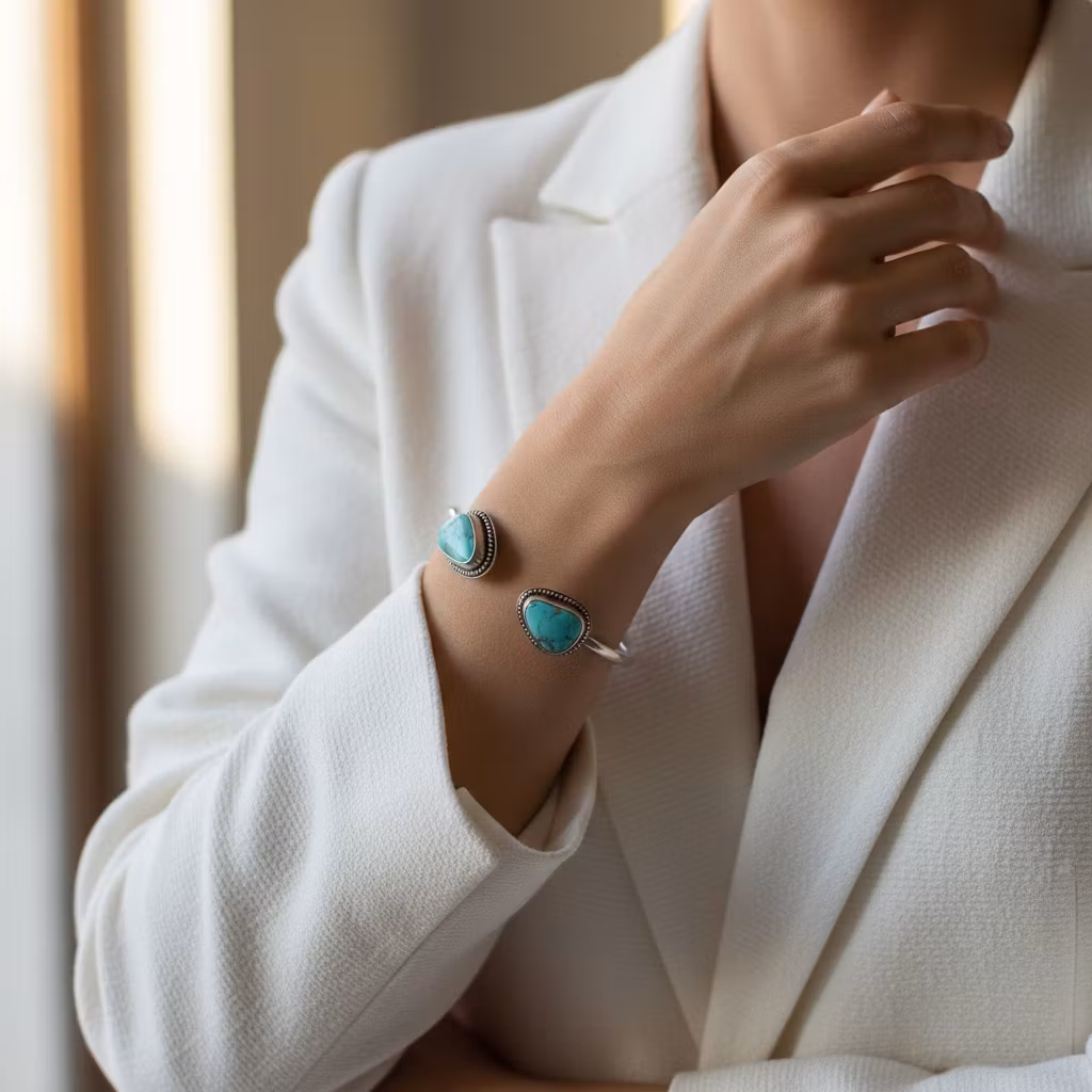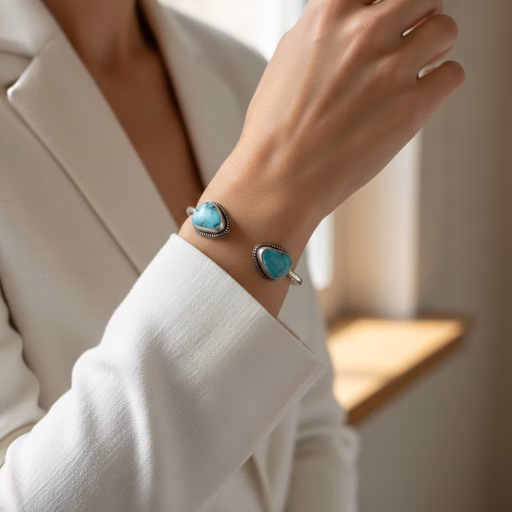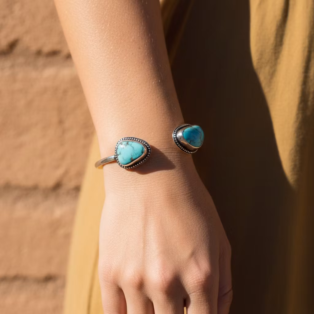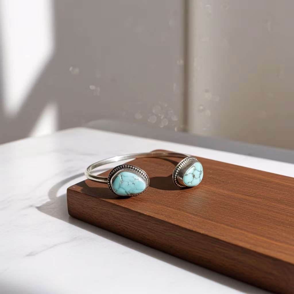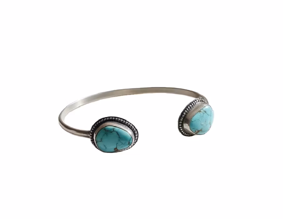 Öppet turkos armband i äkta sterling silver med två stycken genuina turkoser. Det stela armbandet har en hamrad yta och är 3mm bred och är halvrund i formen. Armbandet har två turkos stenar i olika nyanser med ådringar. Turkoserna har en lite ojämn och grov yta. Armbandet finns i ett exklusivt exemplar. Månadsstensarmband december. Polerduk medföljer.