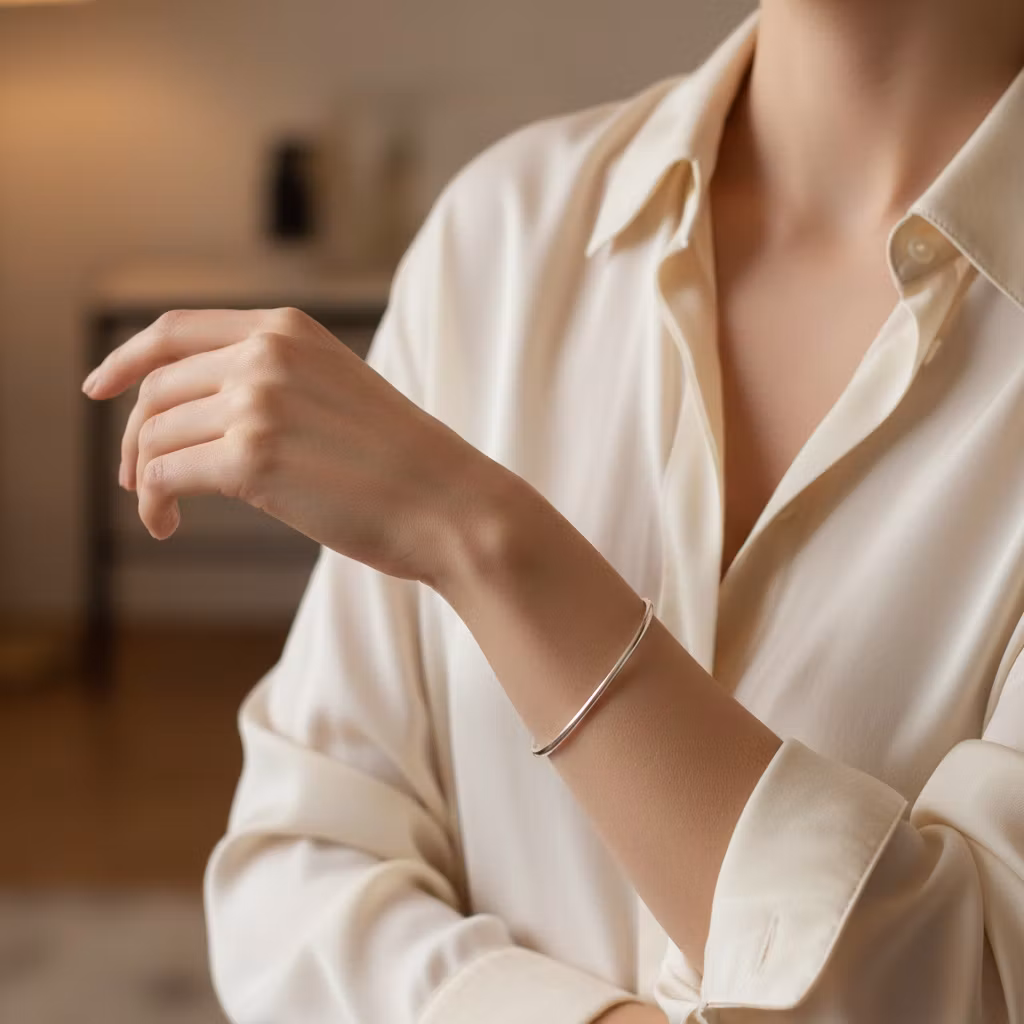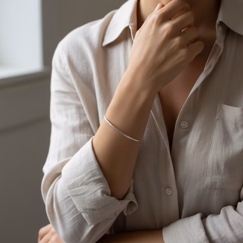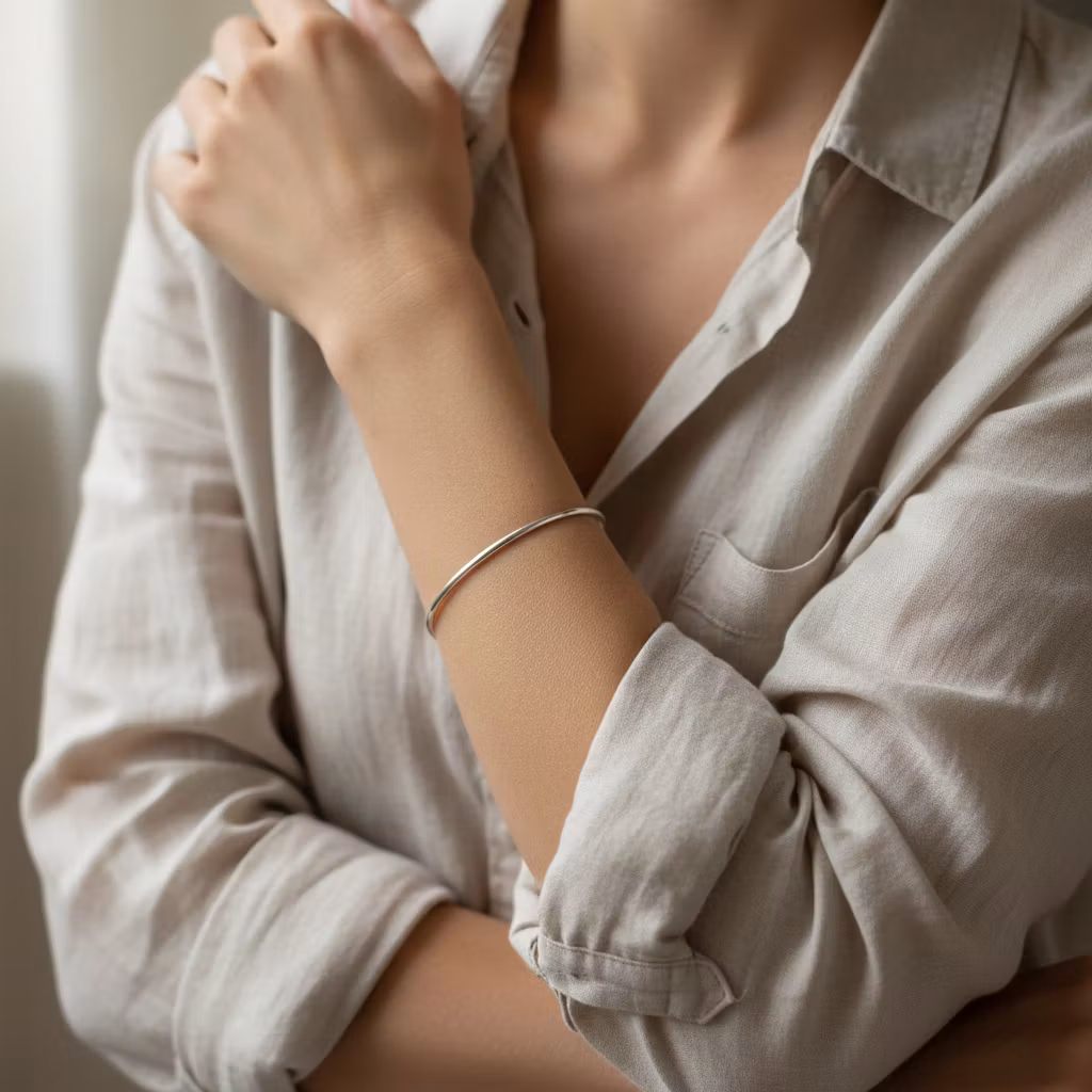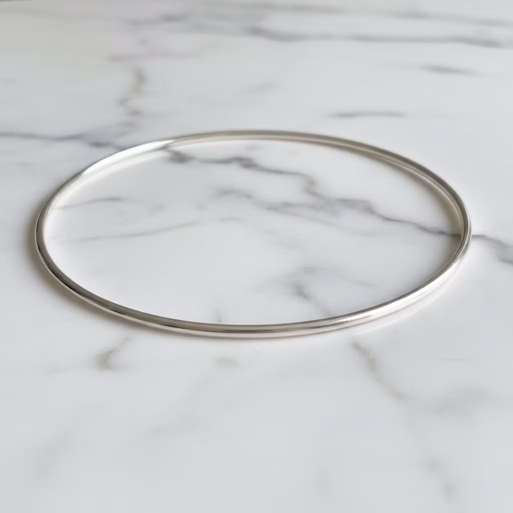 Smal armring i äkta silver med blankpolerad slät yta. Armringen är 2mm bred och 1,3mm tjock och är halvrund i formen. Minimalistisk armring som är snygg solo, eller tillsammans med andra stela silverarmband för en lager-på-lager stil. Stilren och klassisk armring. Polerduk medföljer.