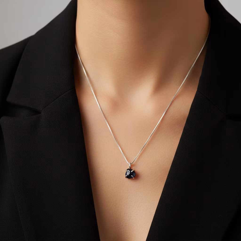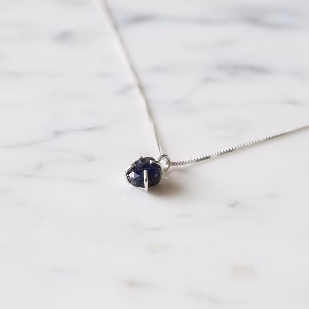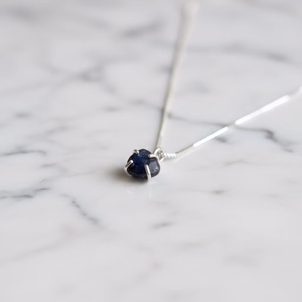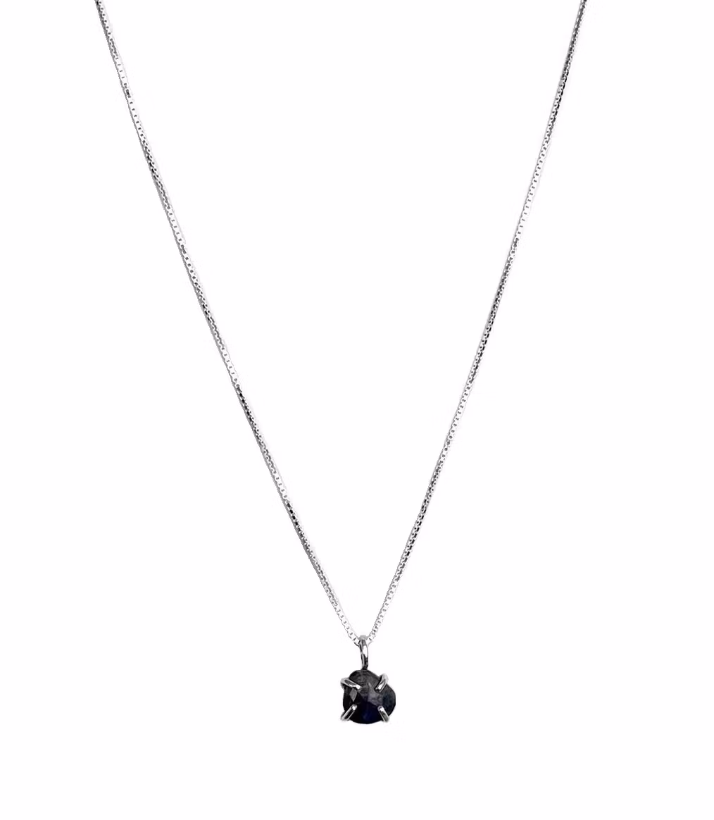 Blå safir halsband i äkta silver med fasettslipad blå safir droppe i klofattning. Hänget är totalt ca 13mm långt. Stilfullt halsband med liten blå safir sten. Halsband med månadssten september. Perfekt för eleganta tillfällen.