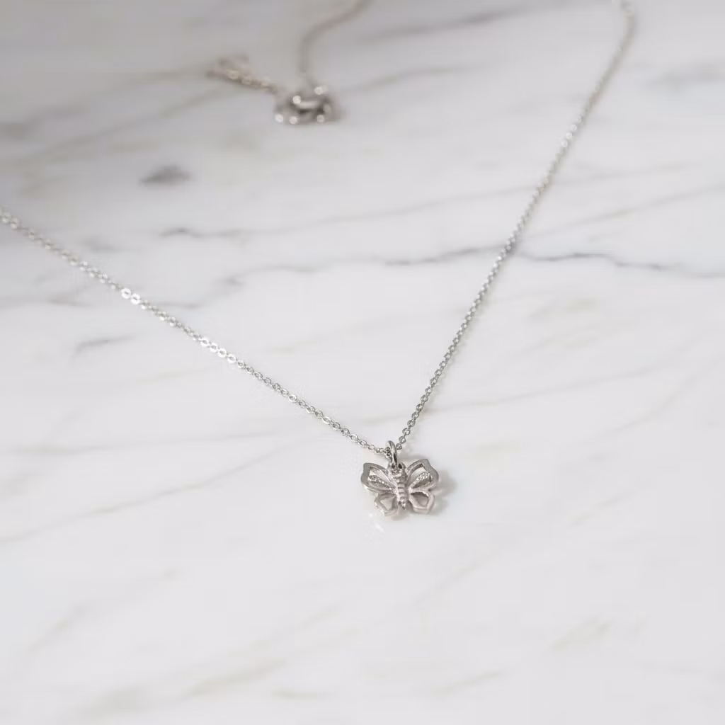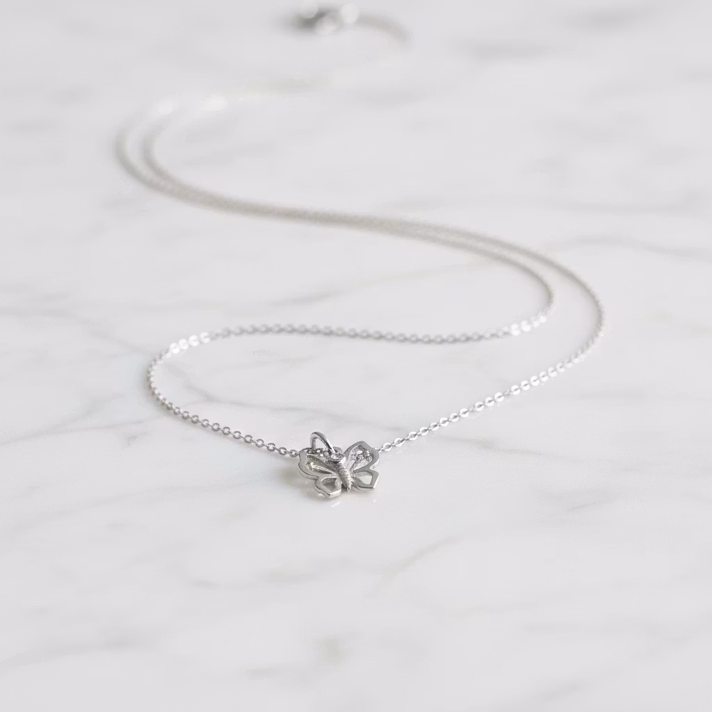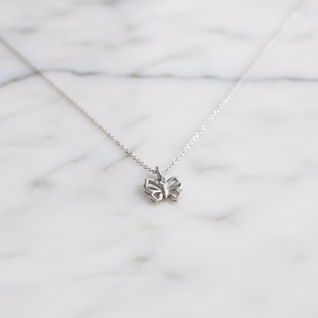 Silverhalsband med liten fjäril på smal halskedja. Fjärilen är ca 10mm och hängets totala längd är 15mm. Halskedjan är av ankarkedja. Fjärilshalsband i äkta silver som passar för alla tillfällen. Polerduk medföljer.