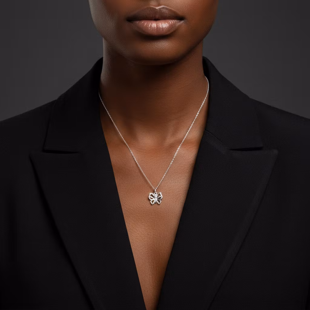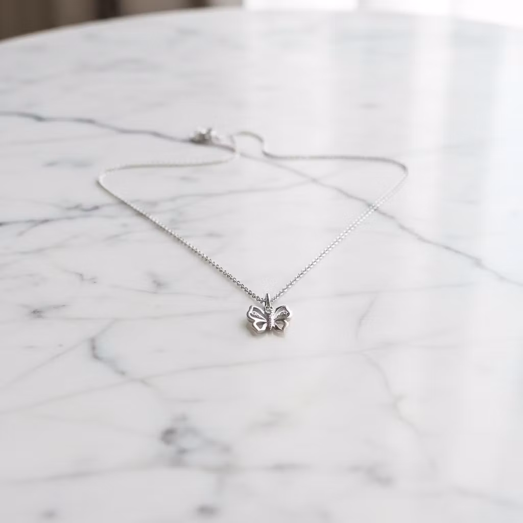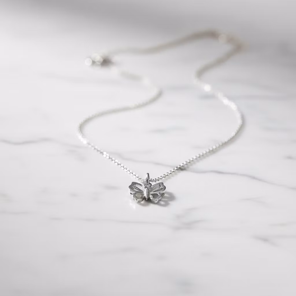 Silverhalsband med liten fjäril på smal halskedja. Fjärilen är ca 10mm och hängets totala längd är 15mm. Halskedjan är av ankarkedja. Fjärilshalsband i äkta silver som passar för alla tillfällen. Polerduk medföljer.