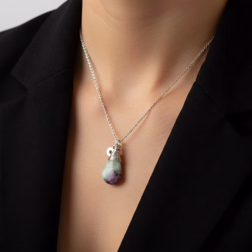 Halsband fuchsit med rubin i äkta silver med smal ankarkedja och liten fasettslipad fuchsit droppe lindad i silvertråd. Hänget är totalt 25mm långt och har en liten berlock i form av en utskuren stjärna. Halsbandet finns endast i ett exklusivt originalexemplar då stenen har ett unikt mönster. Stenen är lika fin på båda sidorna. Halsband med natursten.