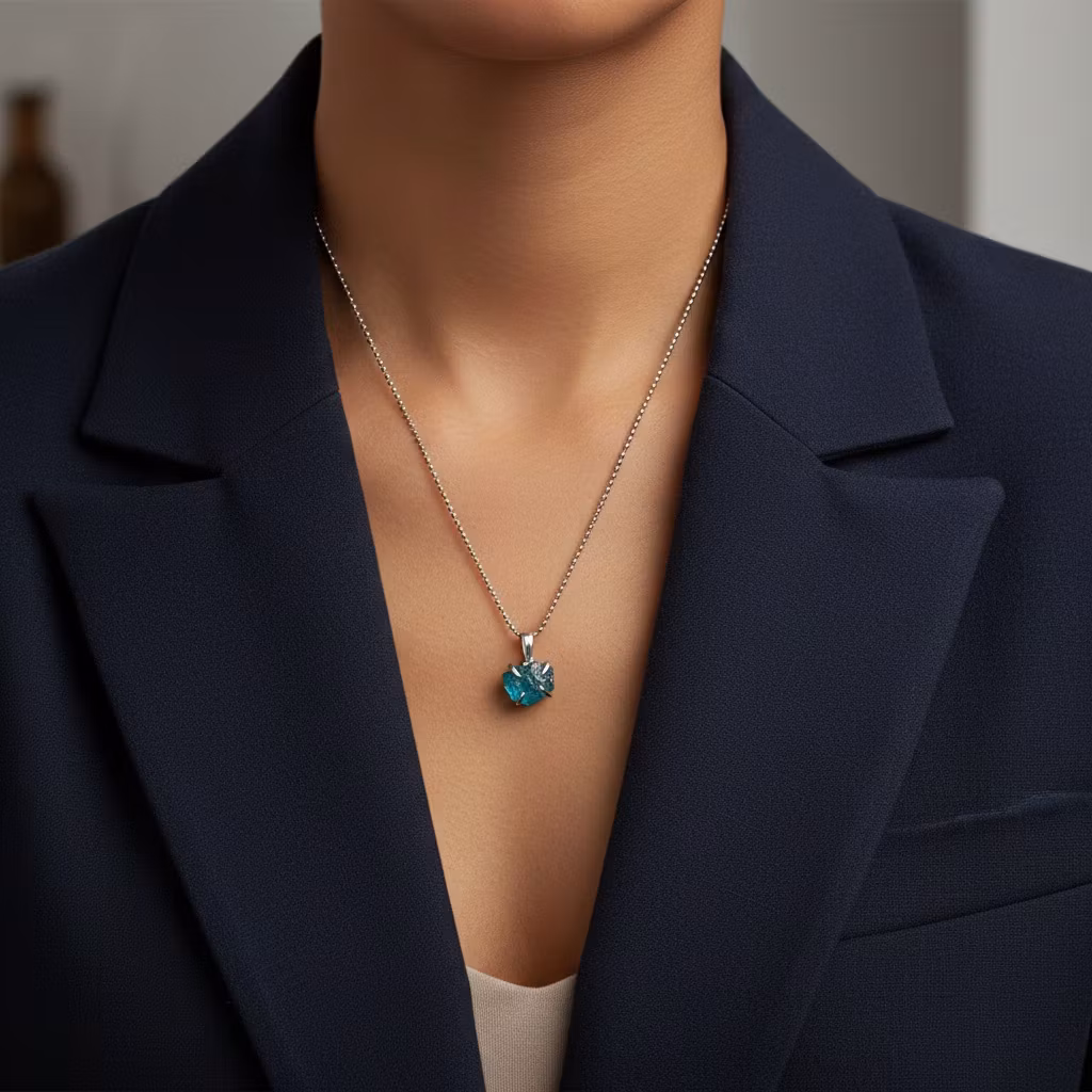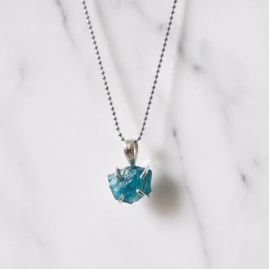Halsband i äkta silver med blå rå apatit sten i klofattning. Halsbandet är skapat av sterling silver med smal fasettslipad kulkedja och liten blå genuin apatit kristall. Hänget är ca 14mm långt totalt. Varje apatit är unik och skiljer sig lite åt i form och mått eftersom dom är äkta naturliga. Alla kristaller är från 6mm-10mm stora och är lika fina. Blå kristall halsband.
