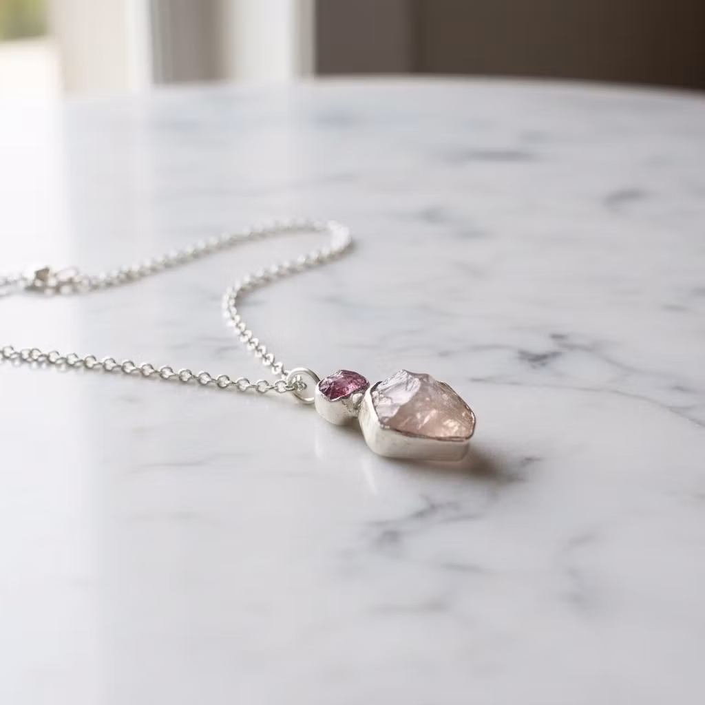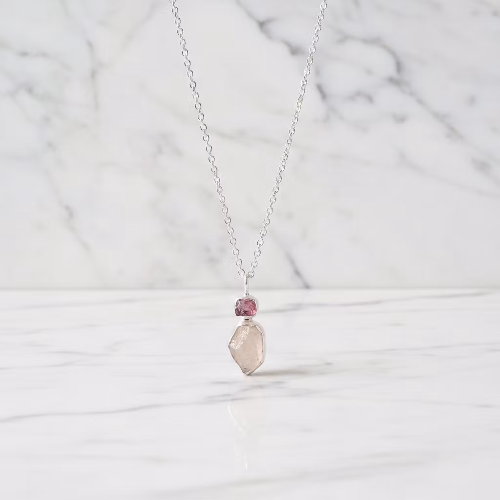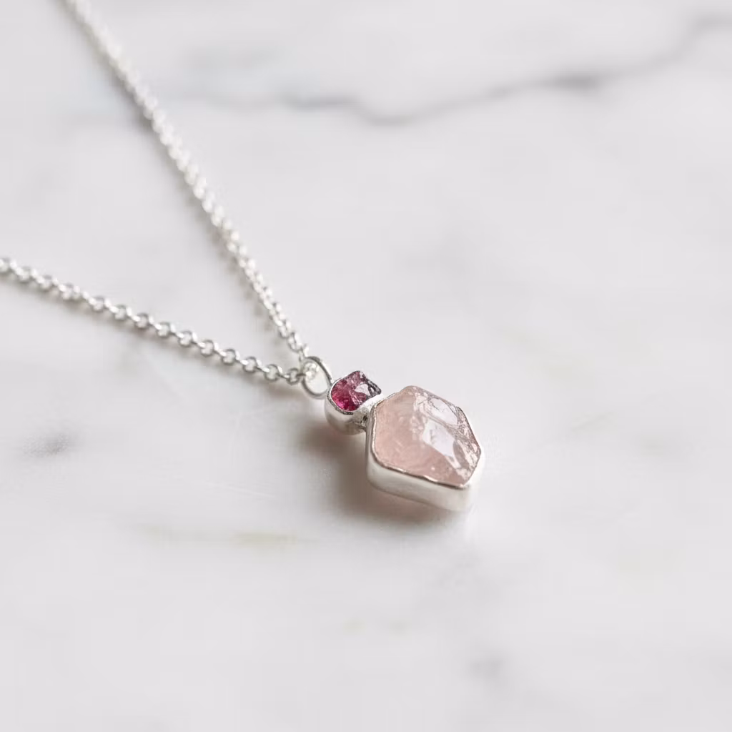 Halsband i äkta silver med rå rosenkvarts sten och liten rå turmalin sten i matchande nyans. Halsbandet är skapat av sterling silver med rosa kristallstenar i olika nyanser. Hänget är ca 20mm långt. Alla hängen är unika och skiljer sig en aning i form. Rosa rå kristall halsband för vackra tillfällen. Polerduk medföljer.