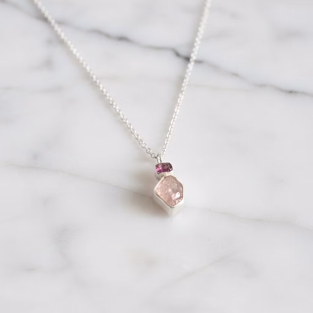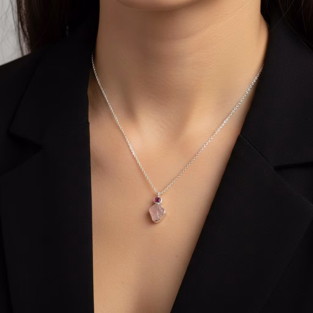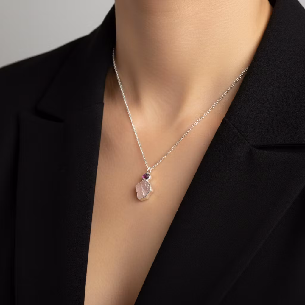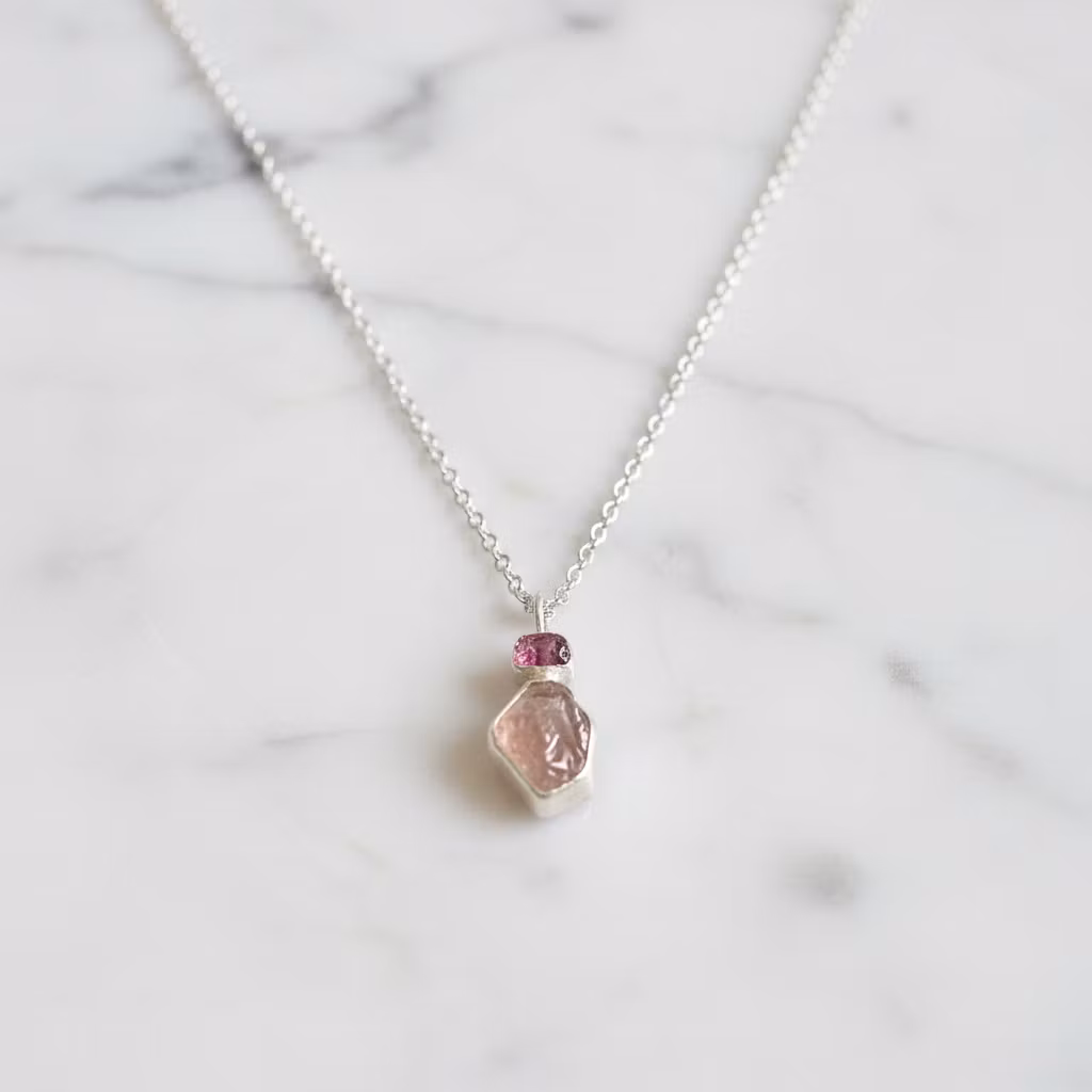 Halsband i äkta silver med rå rosenkvarts sten och liten rå turmalin sten i matchande nyans. Halsbandet är skapat av sterling silver med rosa kristallstenar i olika nyanser. Hänget är ca 20mm långt. Alla hängen är unika och skiljer sig en aning i form. Rosa rå kristall halsband för vackra tillfällen. Polerduk medföljer.