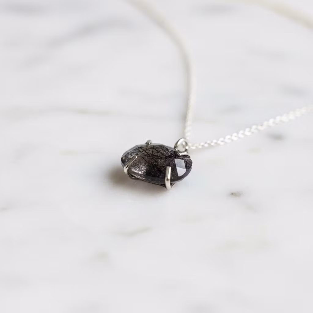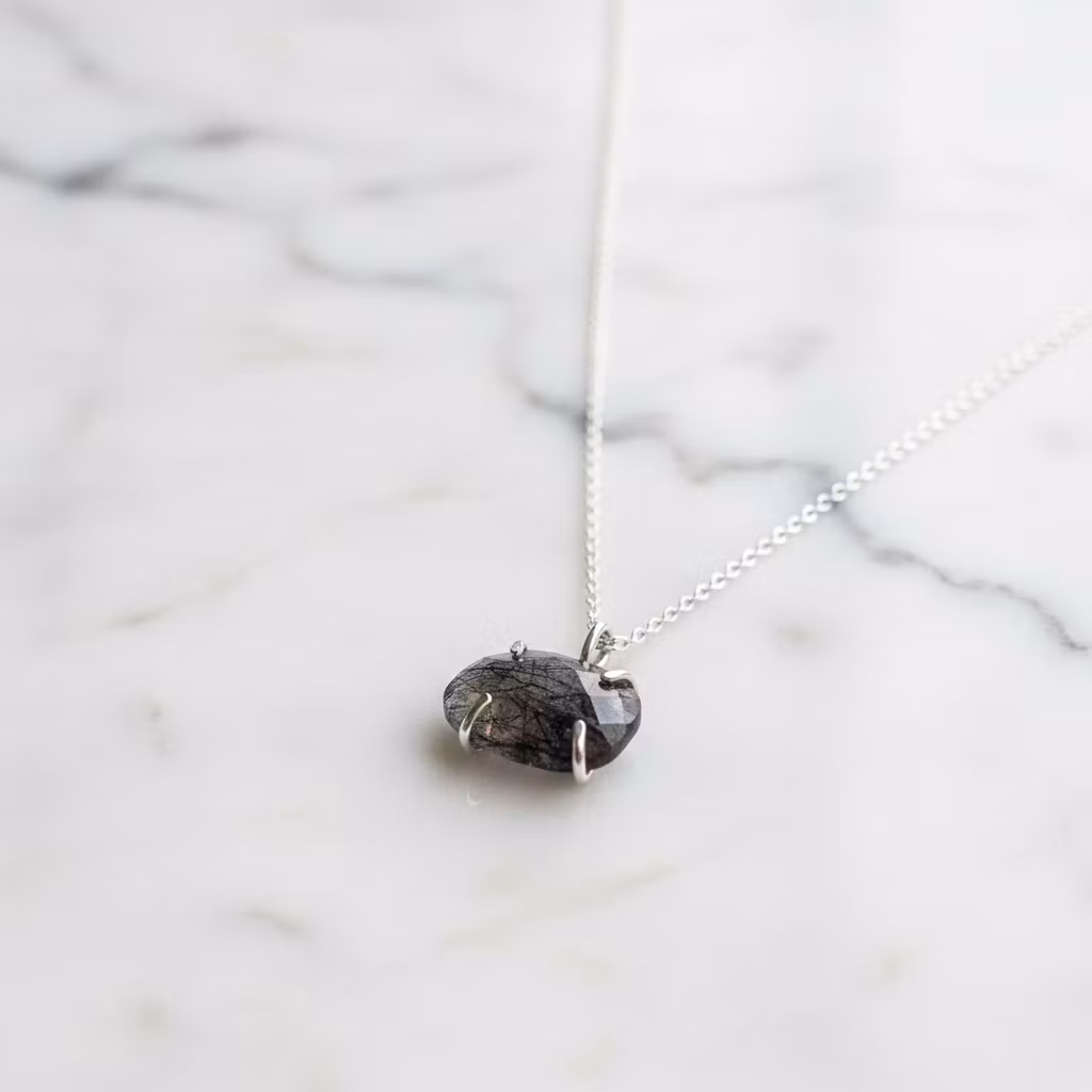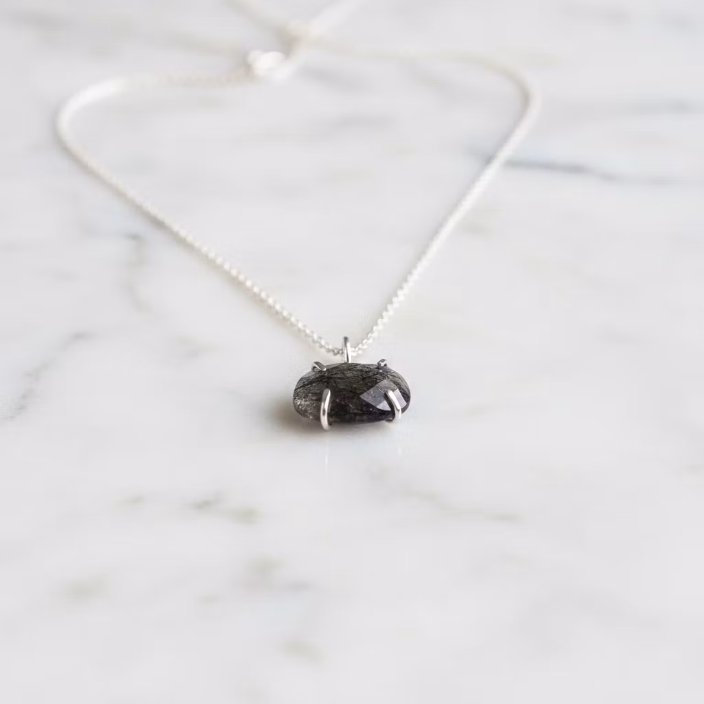 Halsband i äkta silver med svart rutilerad kvarts kristall i klofattning. Halsbandet har en smal ankarkedja med en oval genuin rutilkvarts med slipad yta. Stenen är 15mm. Svart elegant rutilkvarts halsband silver.