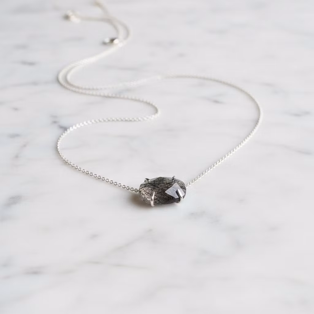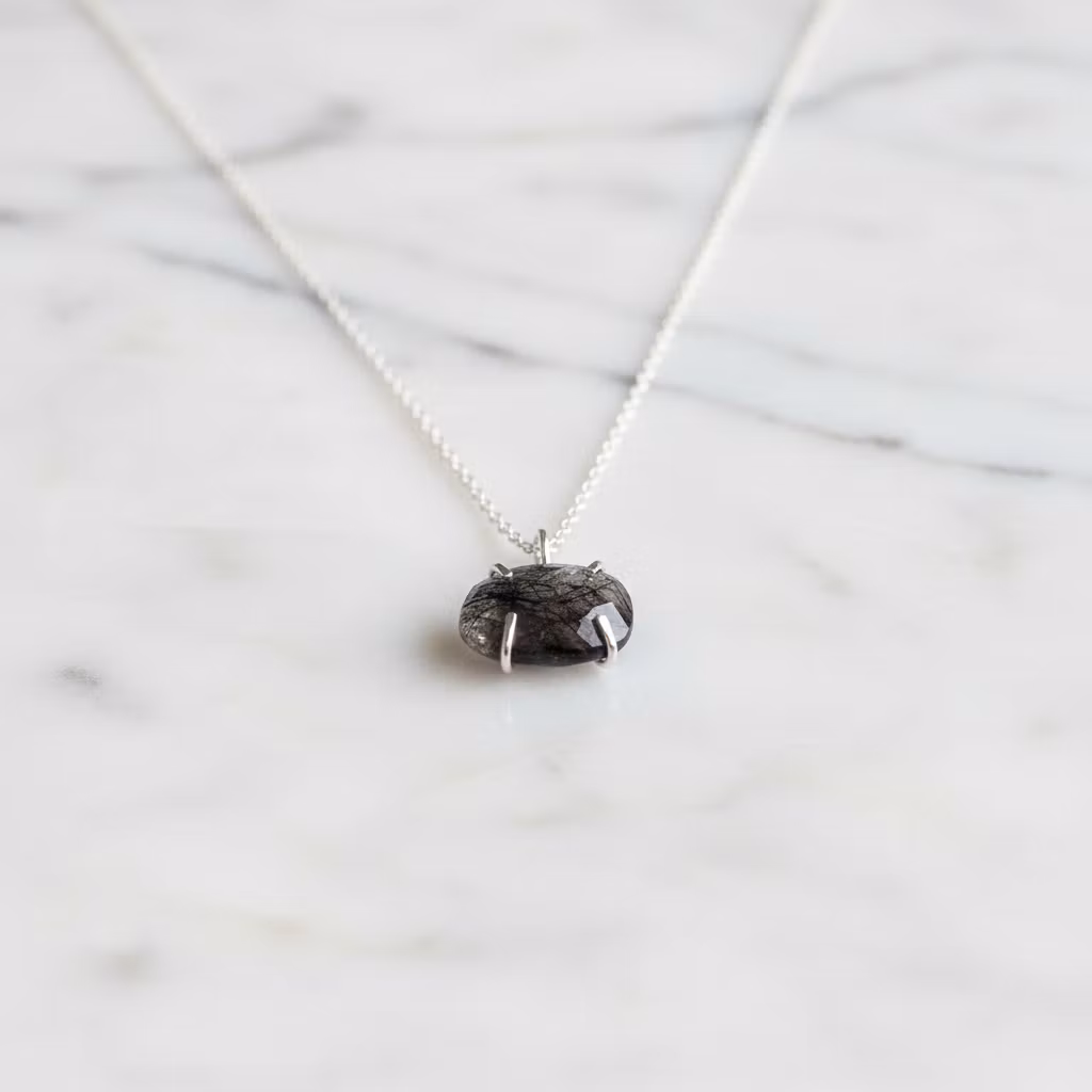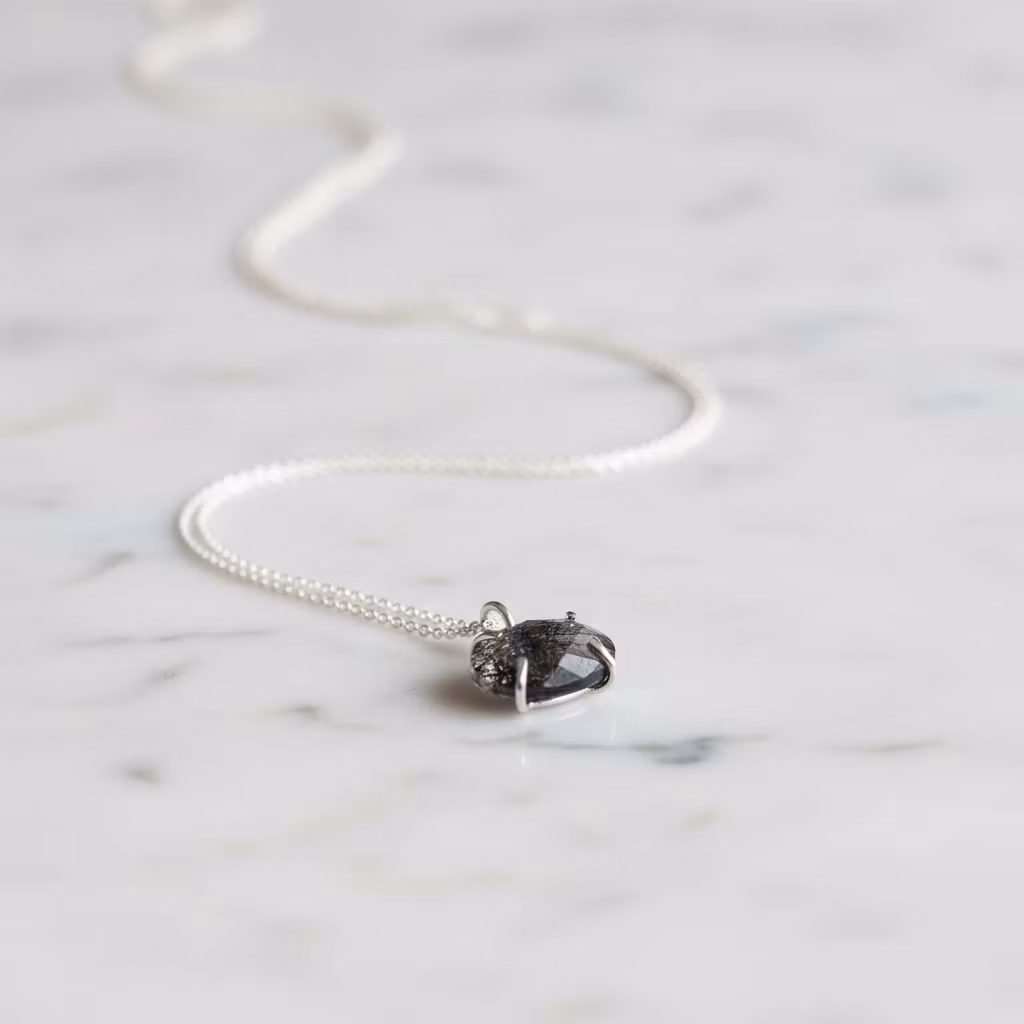 Halsband i äkta silver med svart rutilerad kvarts kristall i klofattning. Halsbandet har en smal ankarkedja med en oval genuin rutilkvarts med slipad yta. Stenen är 15mm. Svart elegant rutilkvarts halsband silver.