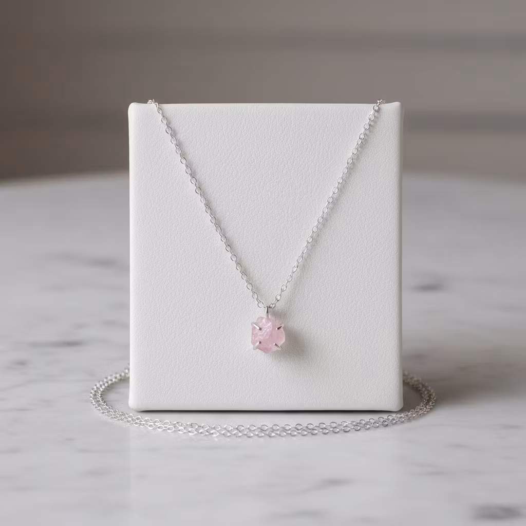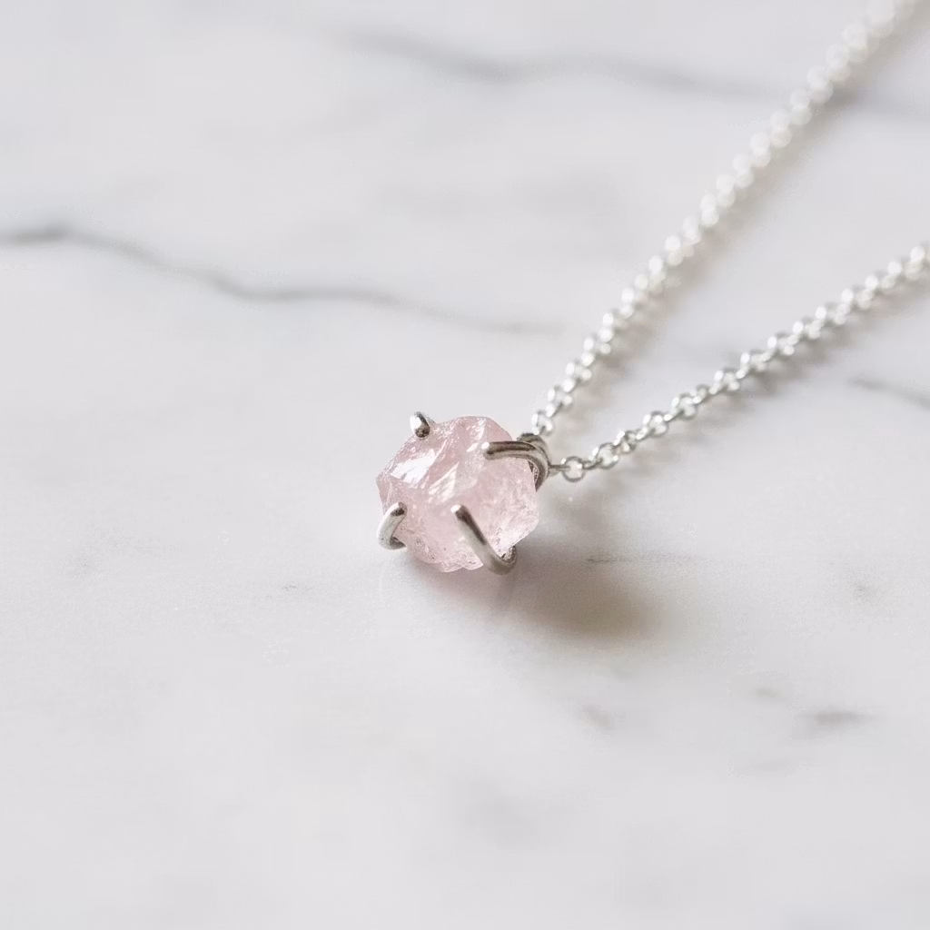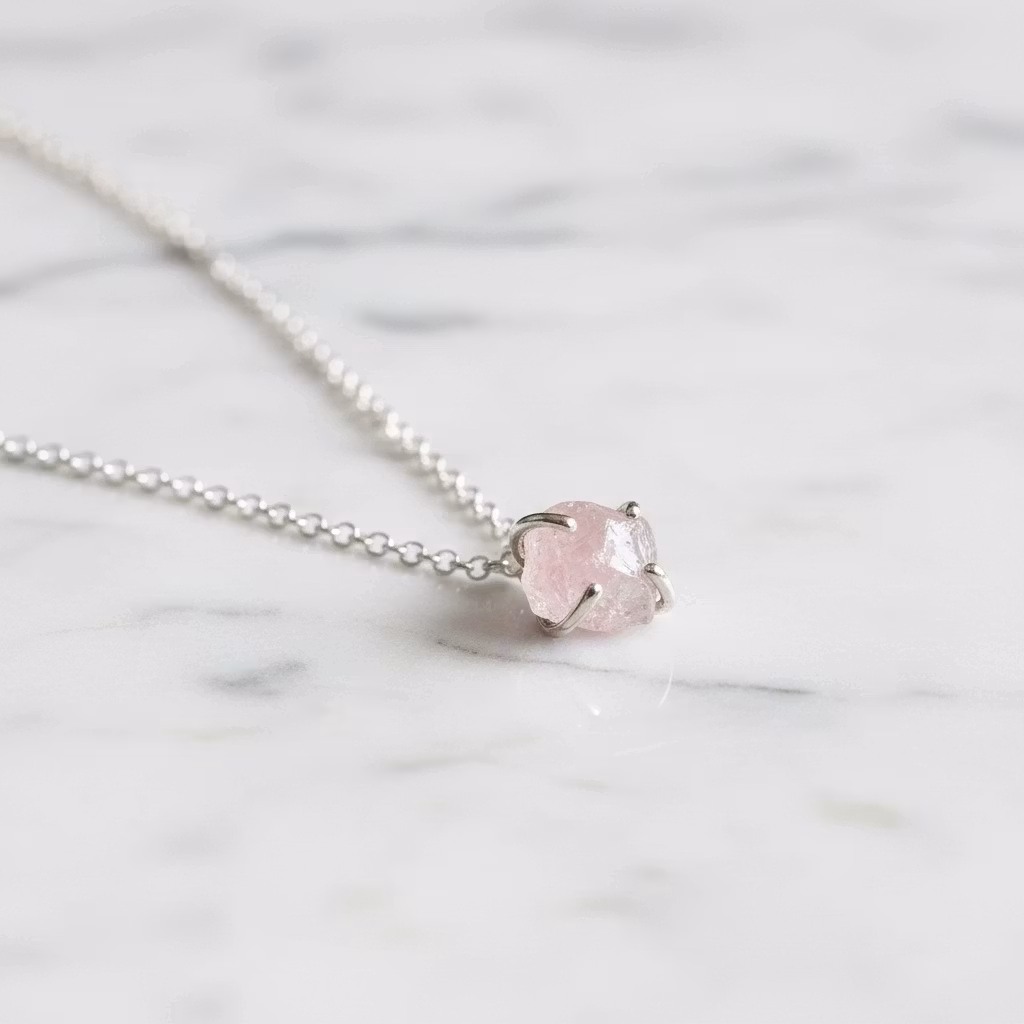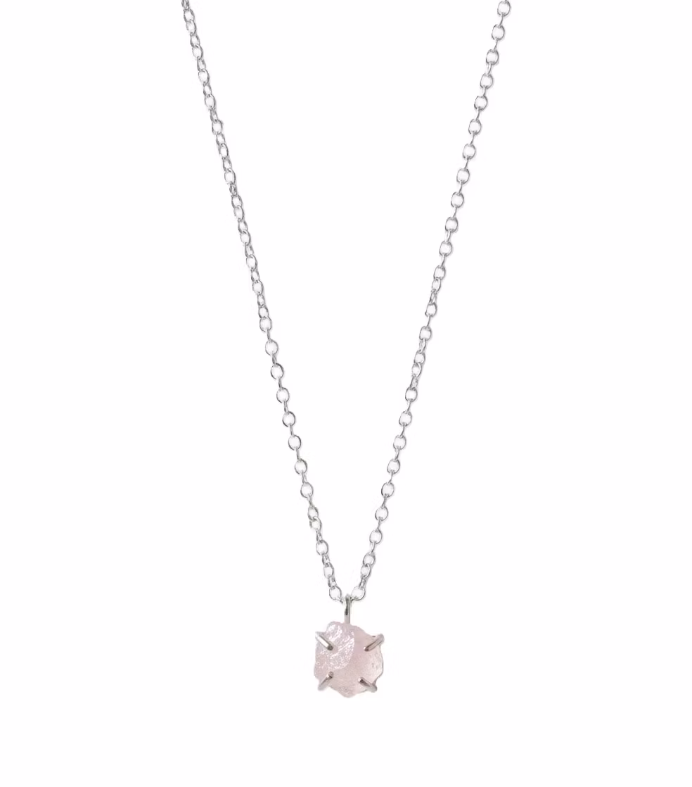 Rå rosenkvarts halsband i äkta silver med rosa glänsande rosenkvartskristall i klofattning. Kristallen är ca 8mm och hängets totala längd ca 12mm. Då kristallerna är äkta naturliga skiljer sig varje kristall åt. Alla kristaller är lika skimrande fina. Halsband med rosa oslipad kristall. Rosenkvarts är kärlekens sten och passar utmärkt som gåva till den du håller kär. Polerduk medföljer.