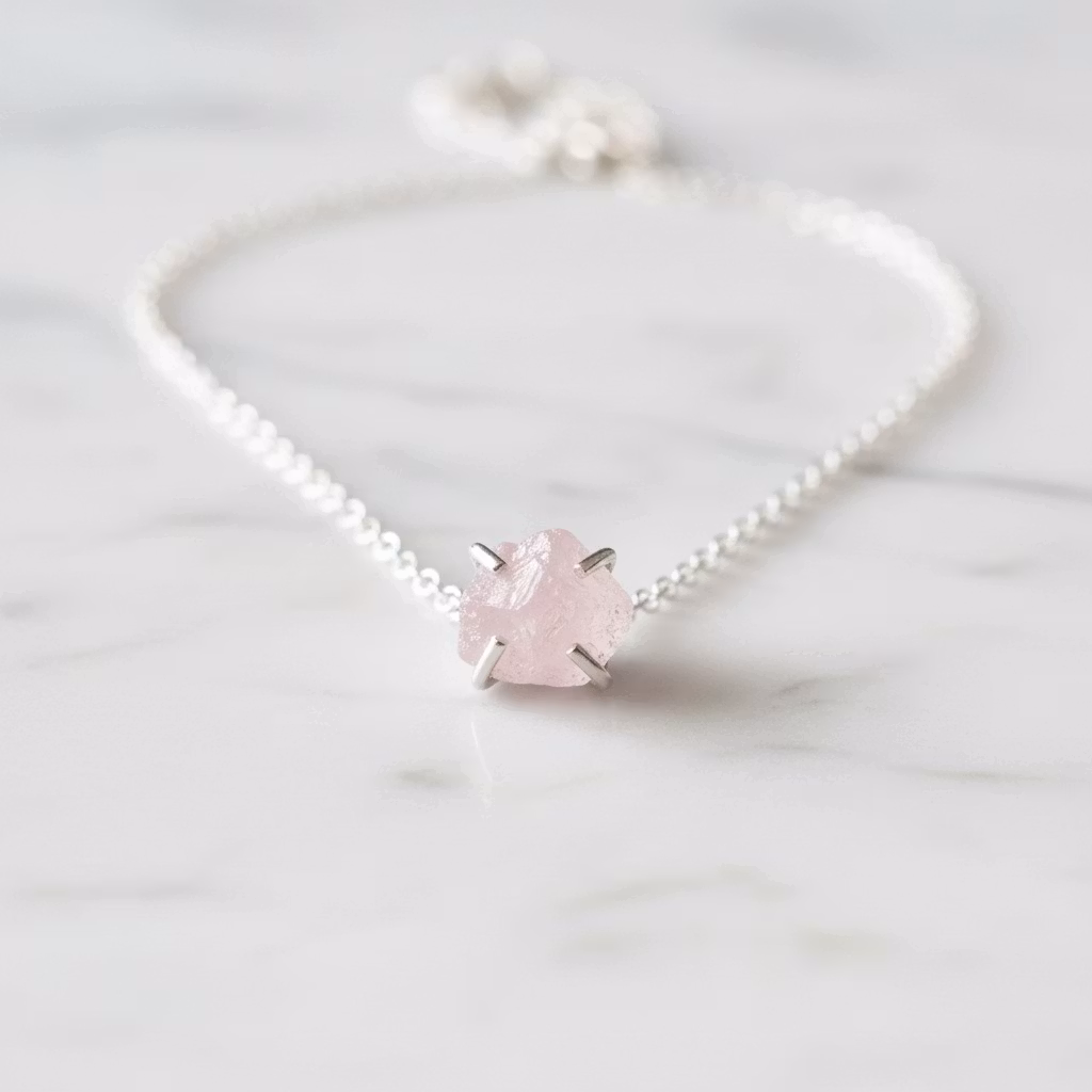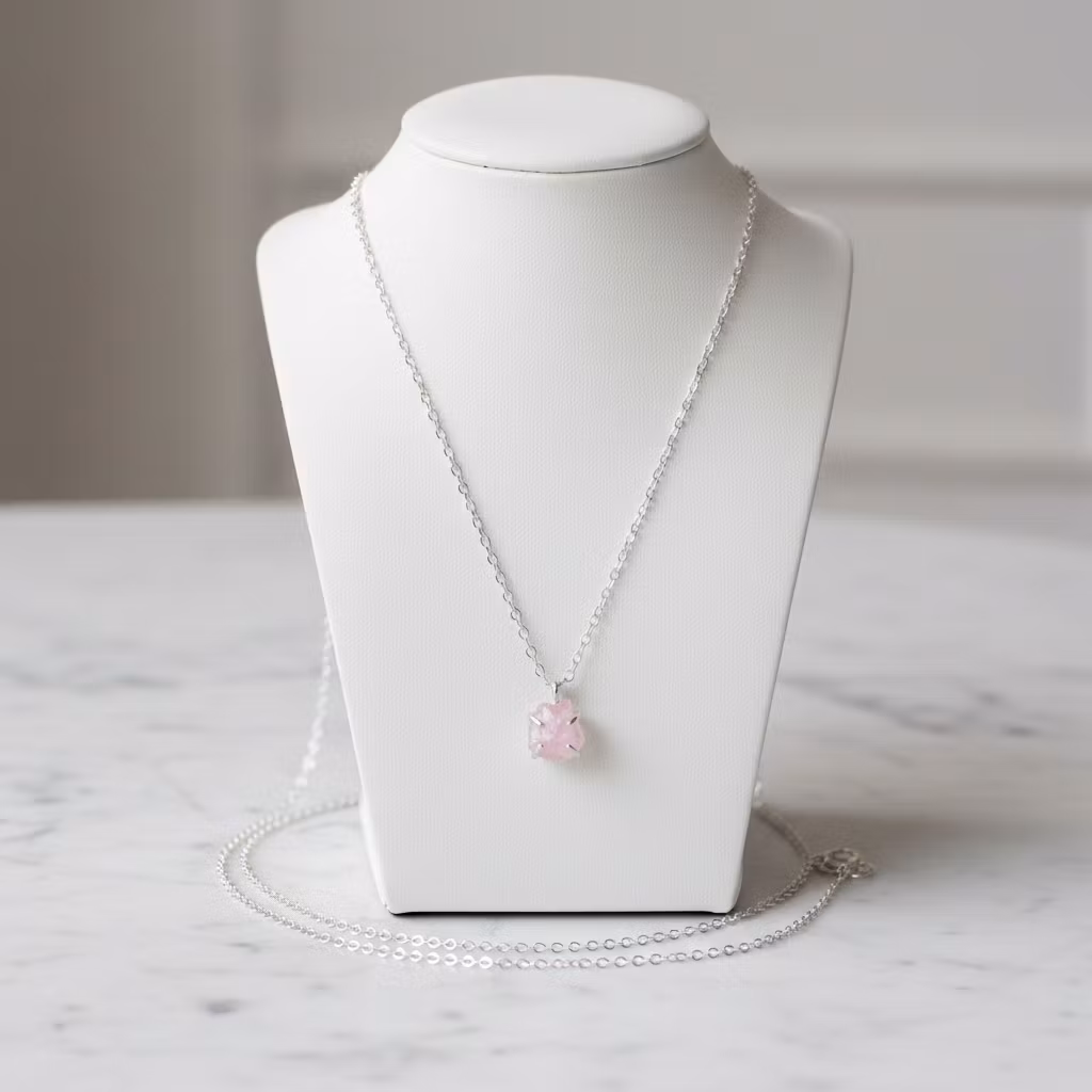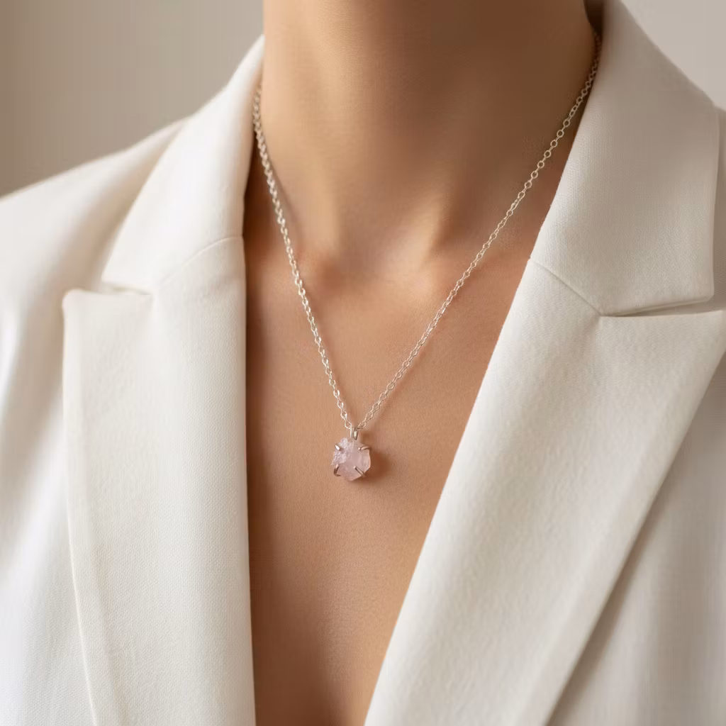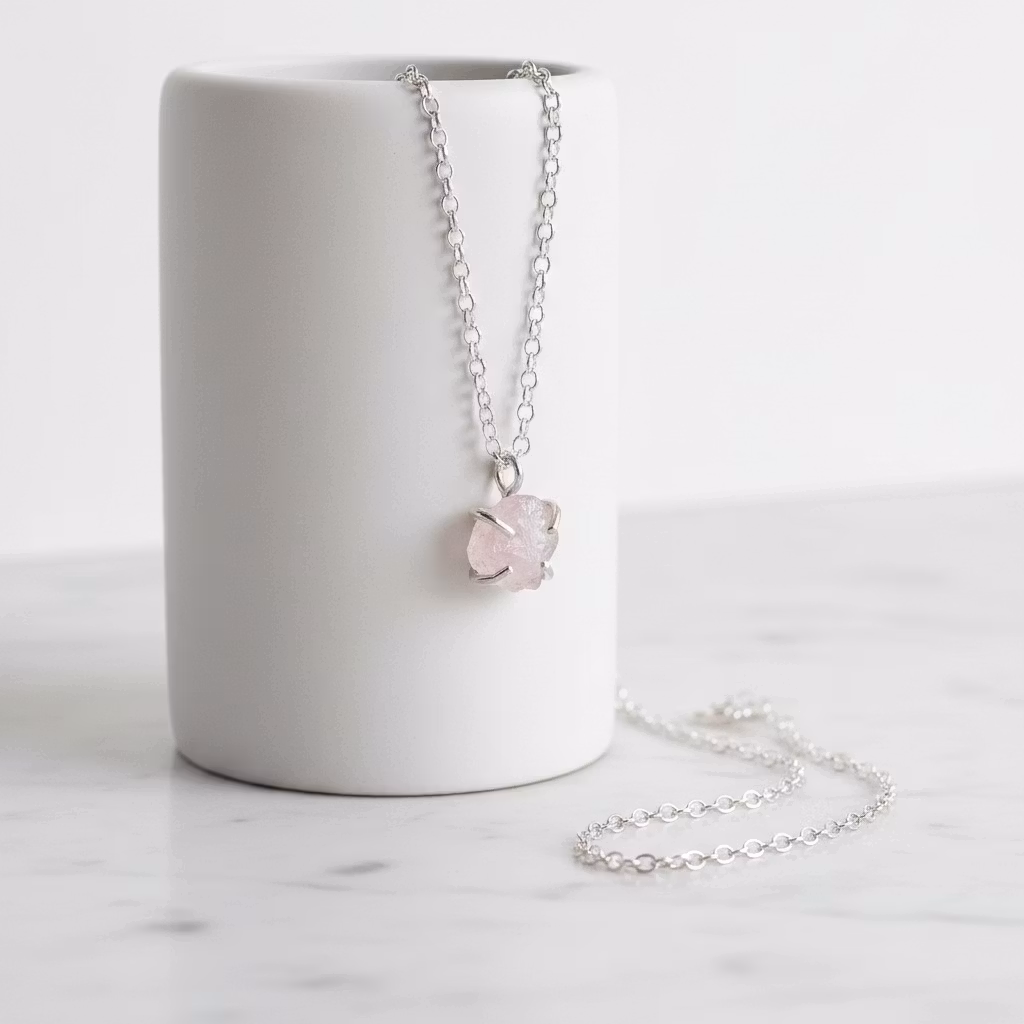 Rå rosenkvarts halsband i äkta silver med rosa glänsande rosenkvartskristall i klofattning. Kristallen är ca 8mm och hängets totala längd ca 12mm. Då kristallerna är äkta naturliga skiljer sig varje kristall åt. Alla kristaller är lika skimrande fina. Halsband med rosa oslipad kristall. Rosenkvarts är kärlekens sten och passar utmärkt som gåva till den du håller kär. Polerduk medföljer.