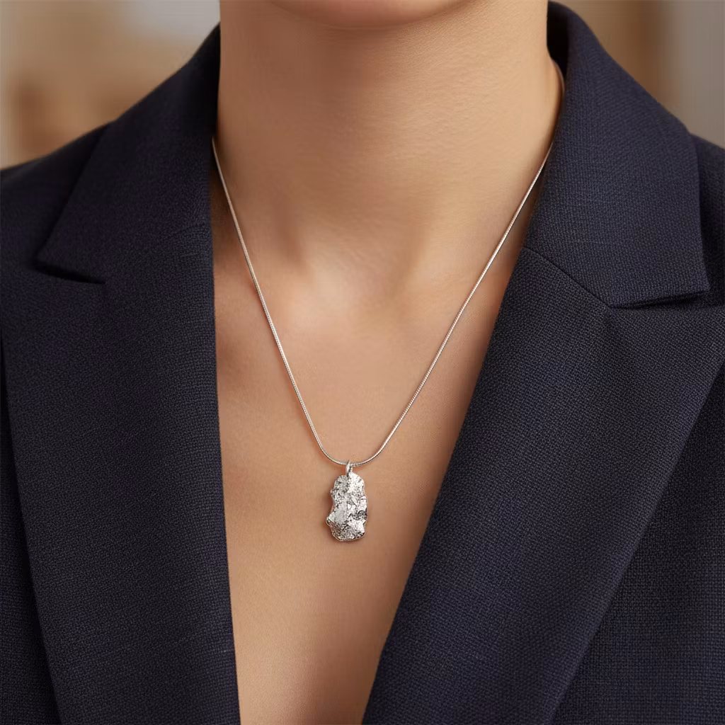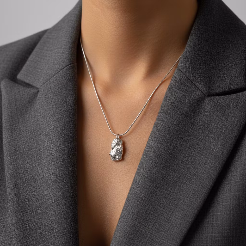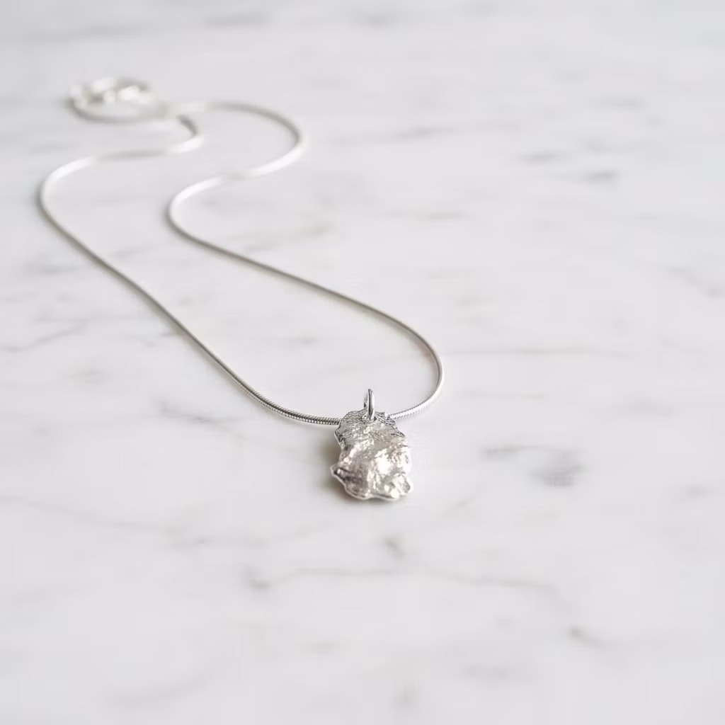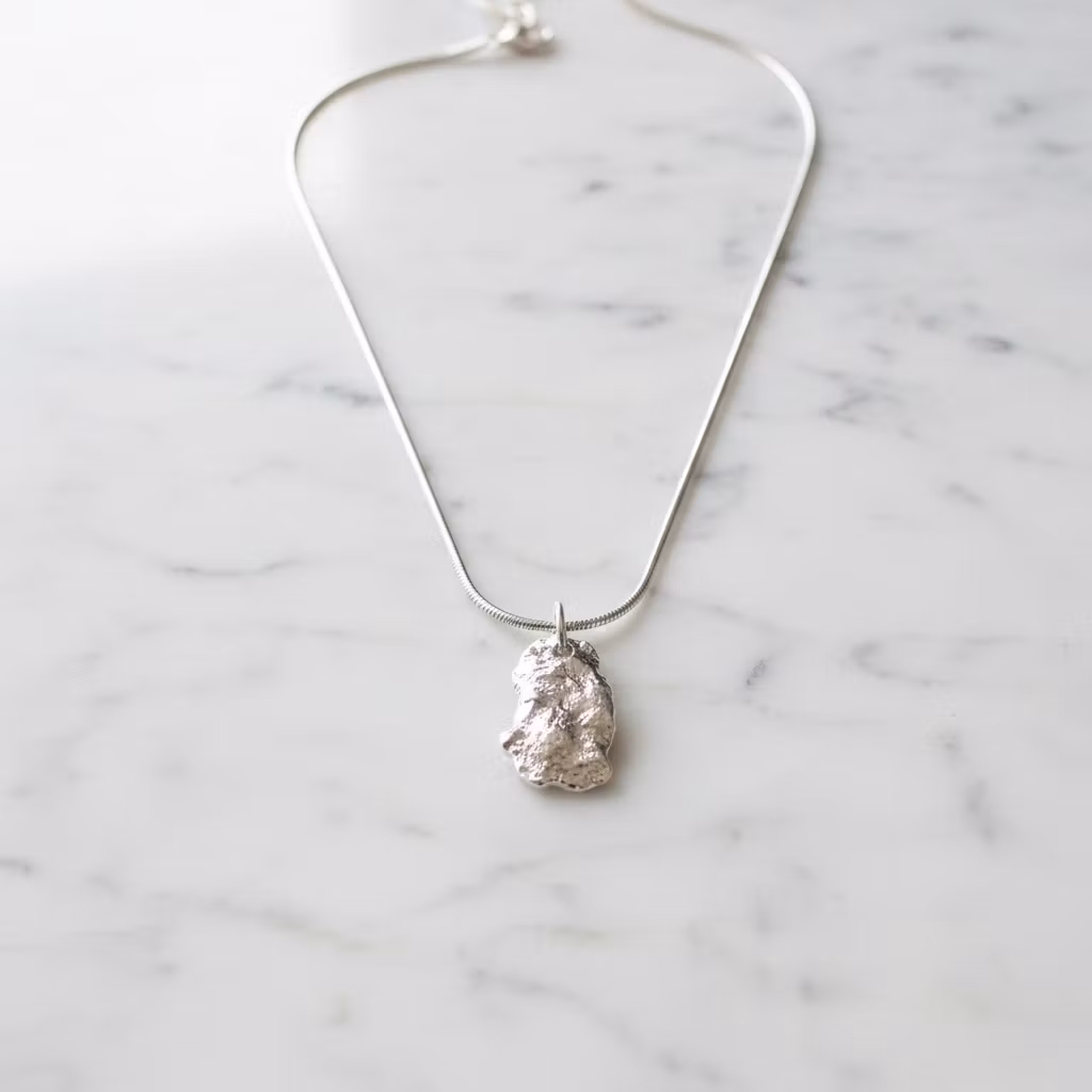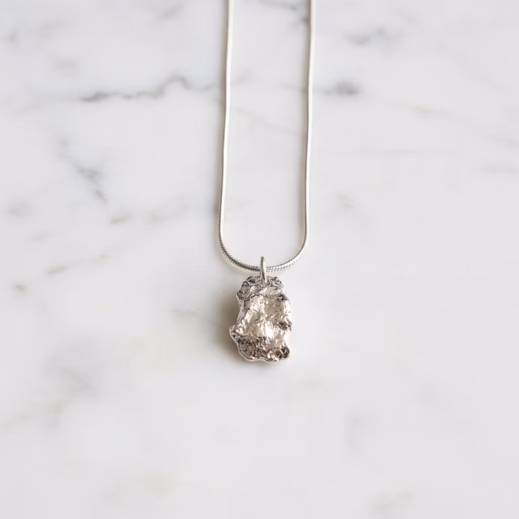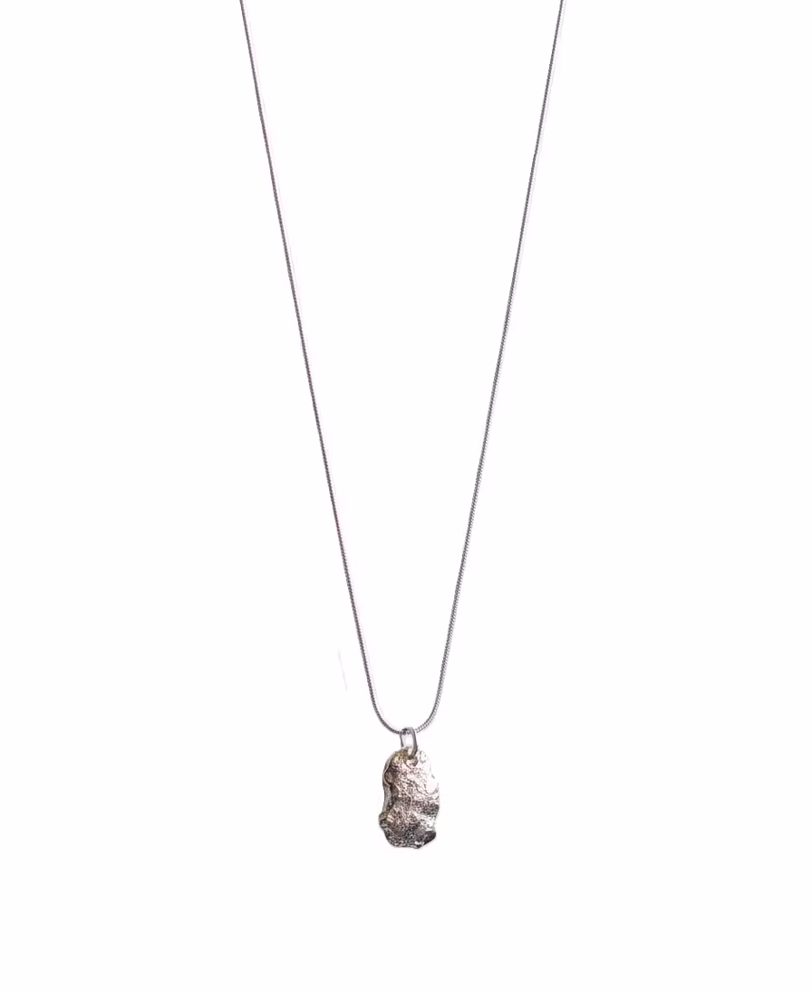 Silverhalsband med ormkedja och rustik organisk bricka skapad från smält återvunnet sterling silver. Halsbandet är i ljust skinande blankt silver med ca 20mm - 25mm lång avlång tjock bricka. Halsbandet är handgjort, alla hängen skiljer sig lite åt i form, tjocklek och yta. Halsbandet på produktbilden är 50cm långt. Organiskt halsband, perfekt för stilfulla och eleganta tillfällen. Polerduk medföljer.