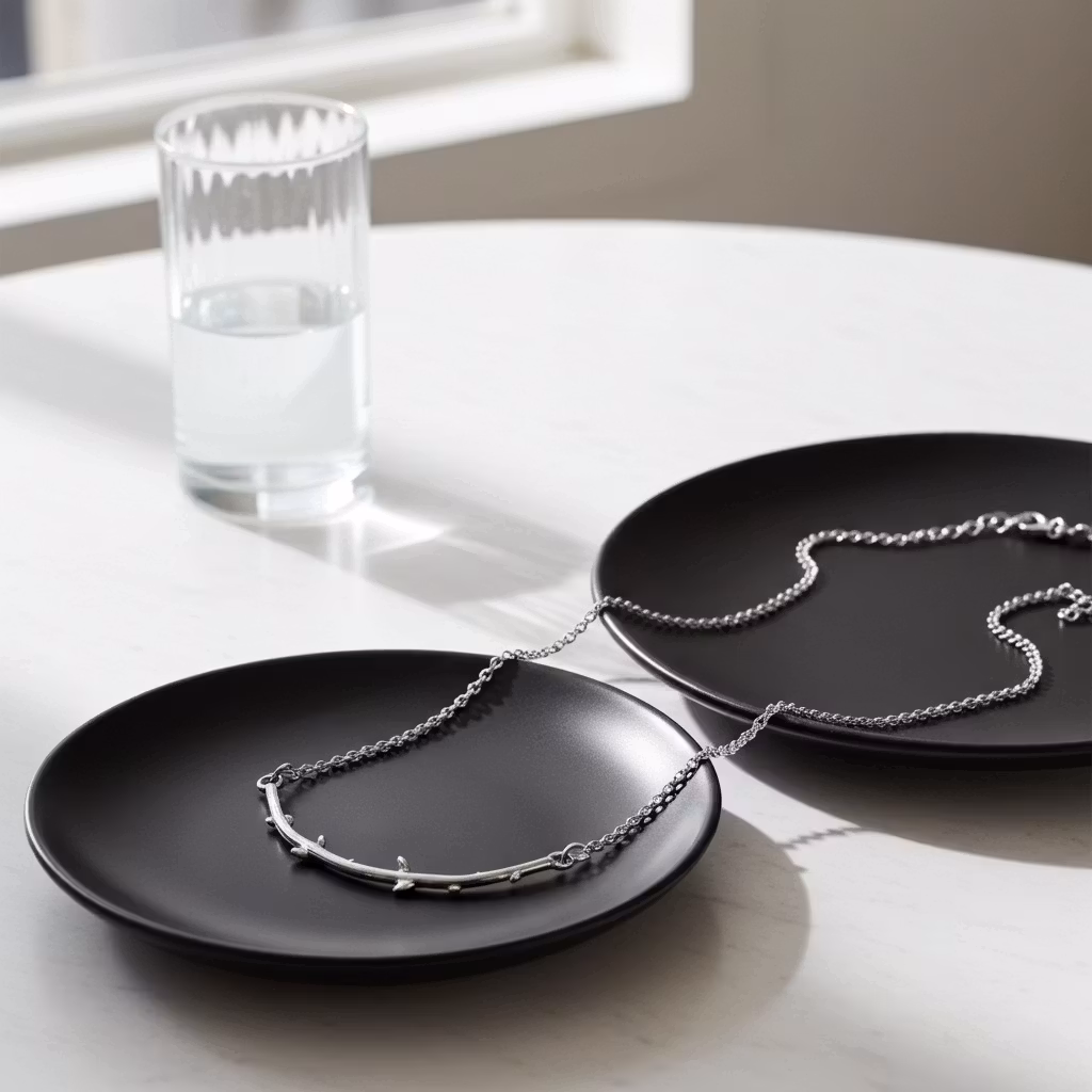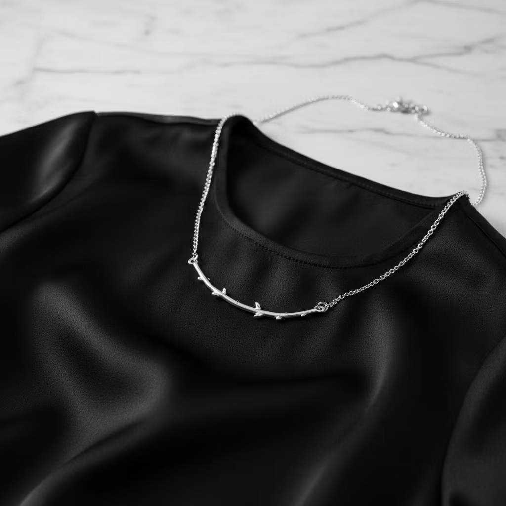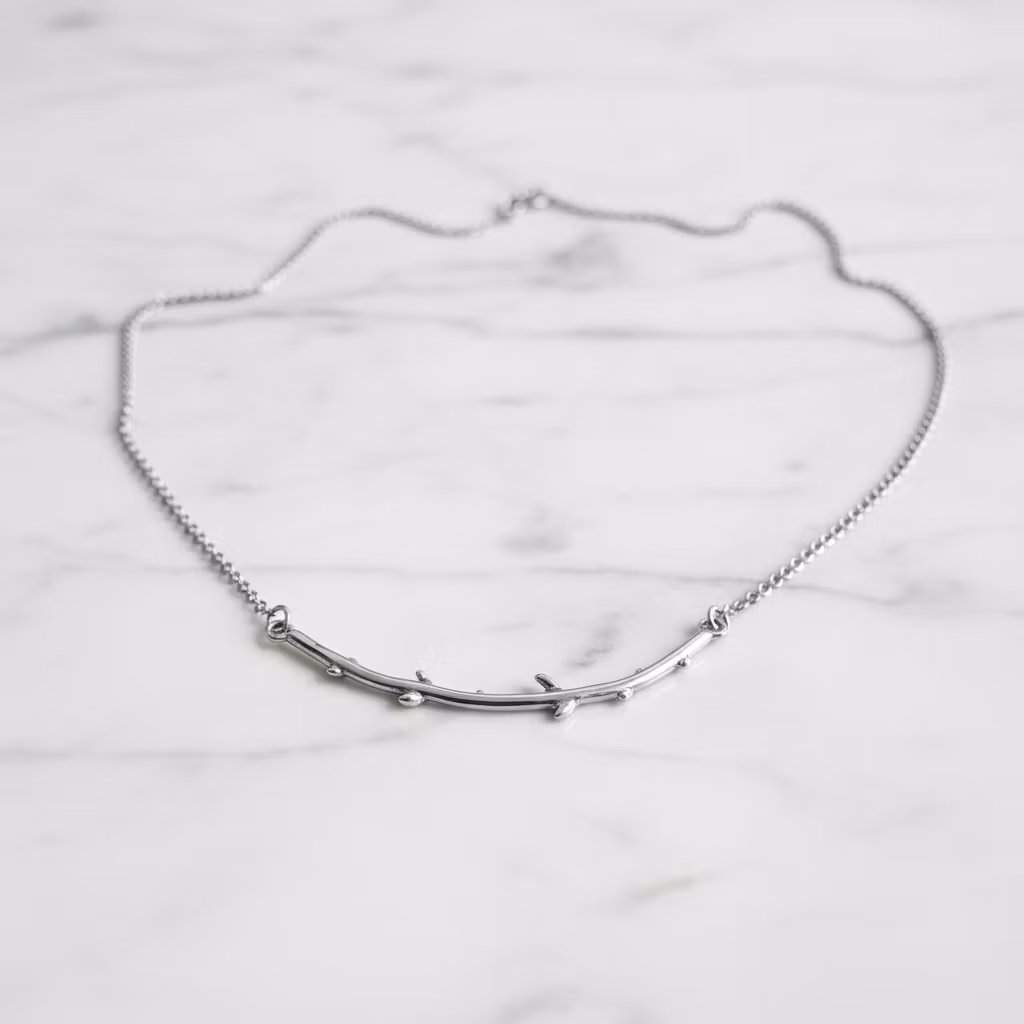 Silverhalsband med lång formad gren i äkta silver. Gren halsbandet är tillverkat i sterling silver med ca 5,5cm lång handgjord gren, kvist. Halskedjan är av ärtlänk och är 2mm bred. Naturinspirerat halsband i stilren design som är snyggt för alla tillfällen. Polerduk medföljer.