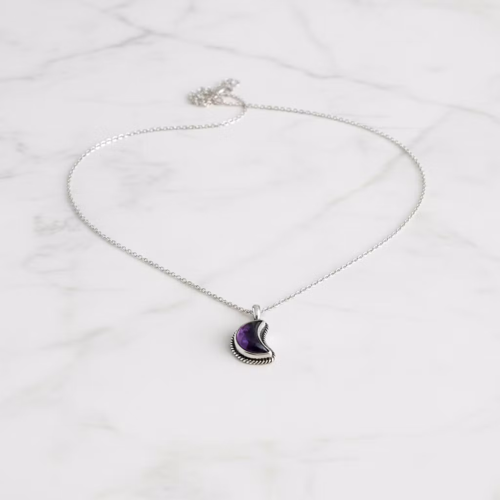 Äkta silverhalsband med smal ankarkedja och liten lila glänsande ametist halvmåne. Ametistmånen är 10mm och hänget totalt ca 18mm långt. Ädelstenshalsband med lila slät fin ametist ädelsten. Månadsstenshalsband februari. Fint silverhalsband med liten ametist måne. Polerduk medföljer.