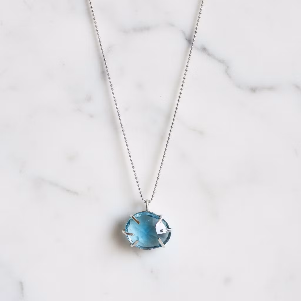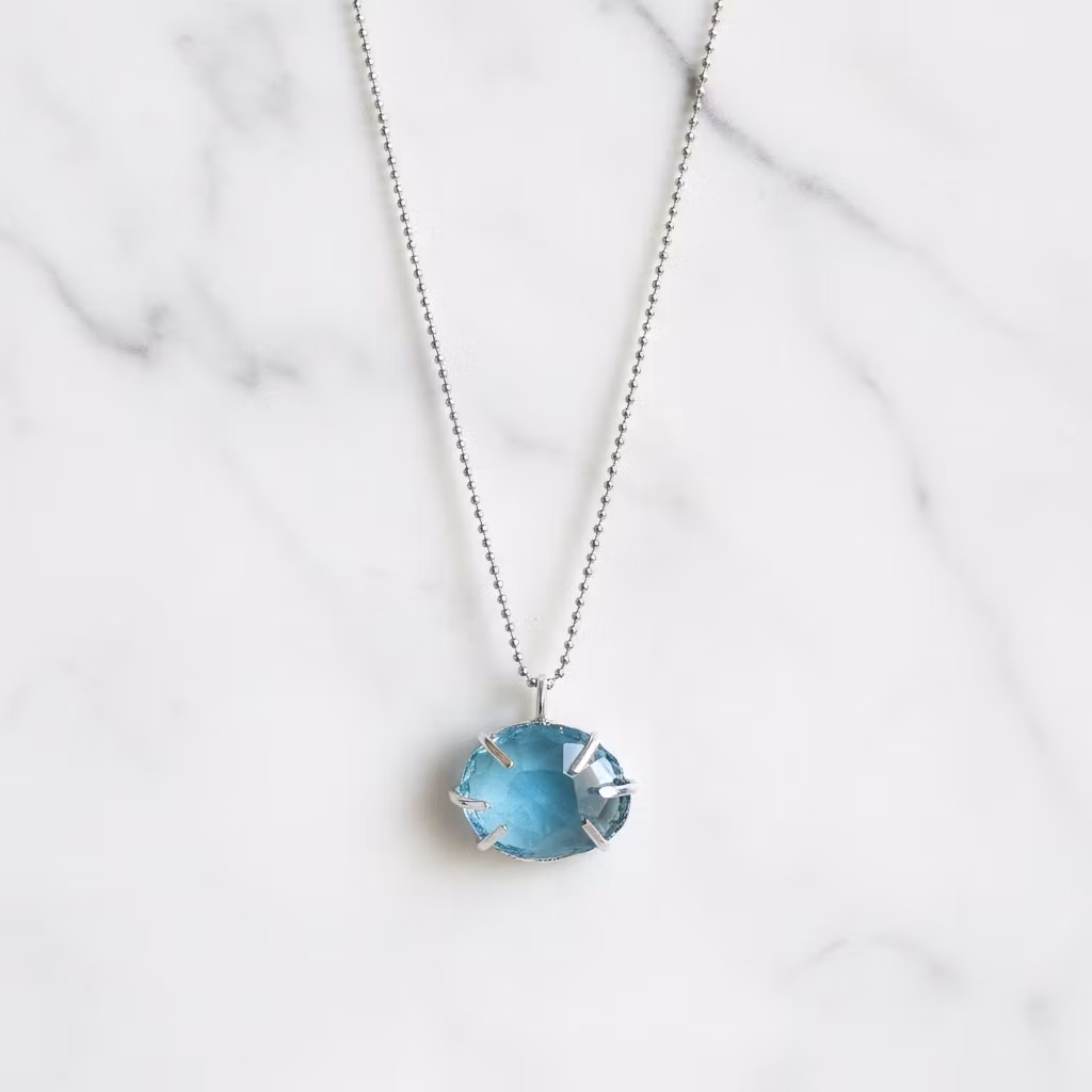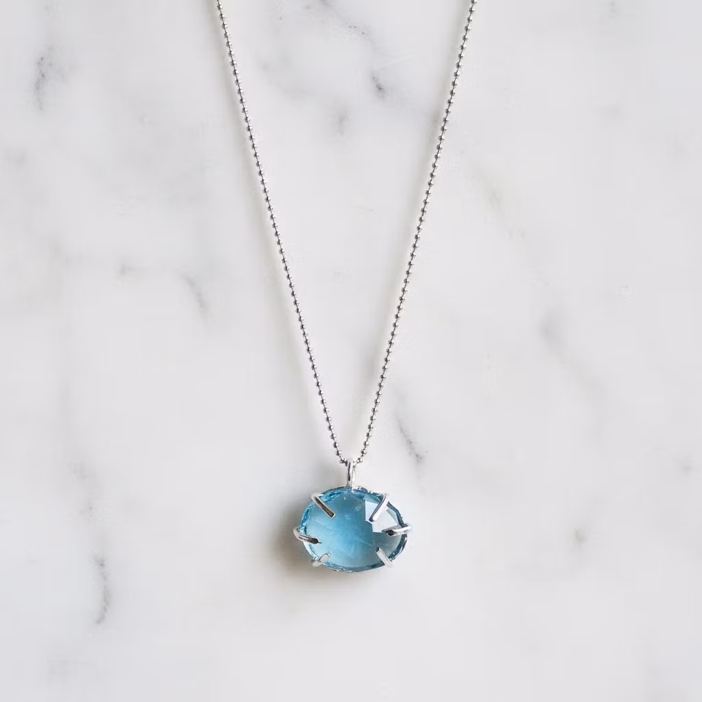 Silverhalsband med blå oval topas sten i klofattning. Äkta silverhalsband med smal fasettslipad kulkedja och slipad blå hydrokvarts topas. Stenen är ca 16mm. Vackert halsband med blå genomskinlig sten.