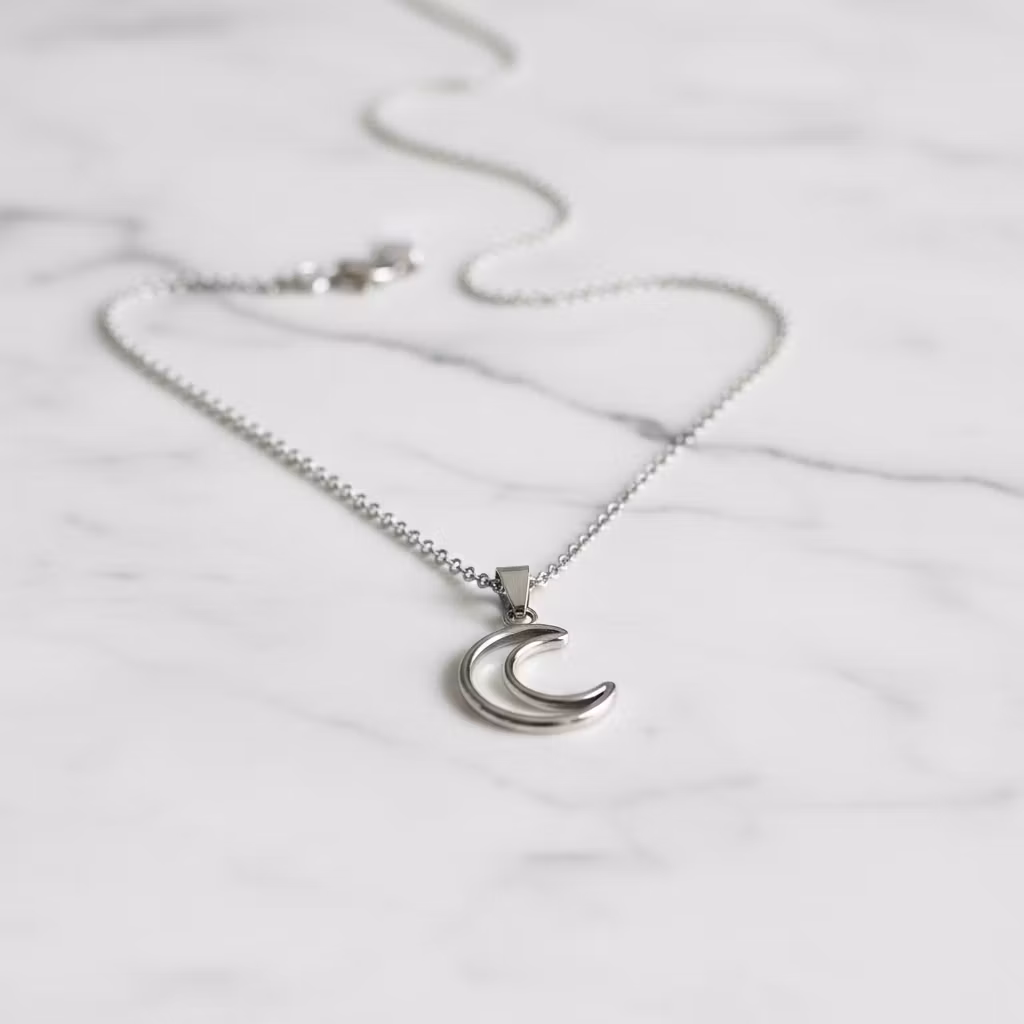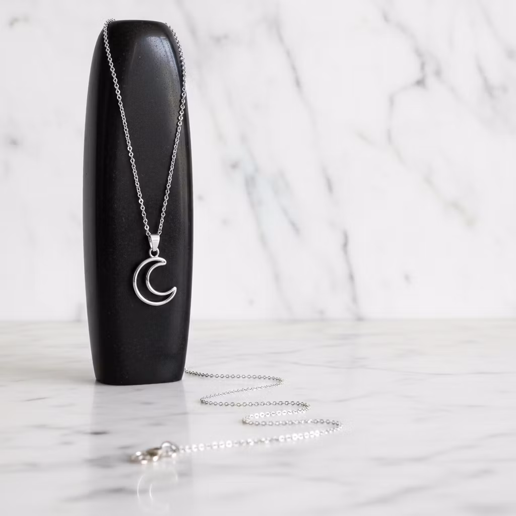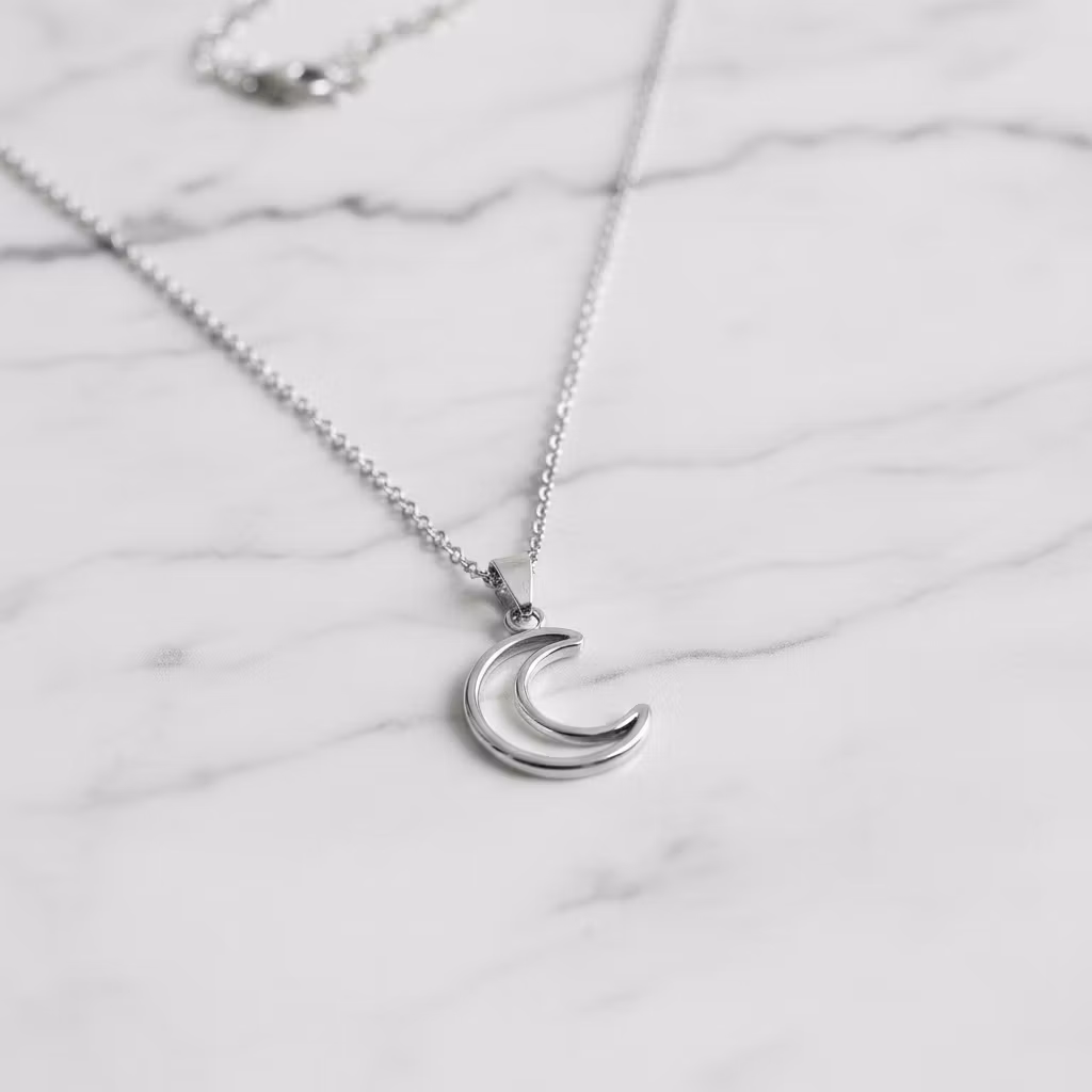 Silverhalsband med halvmåne hänge i skinande blankt silver. Halsbandet är tillverkat i äkta sterling silver med 2mm bred ärtlänkkedja och liten berlock vid låset. Halvmånen är ca 3cm lång. Halsband med måne silhuett, ytterkanten av en halvmåne. Stilrent silverhalsband med månskäran. Polerduk medföljer.