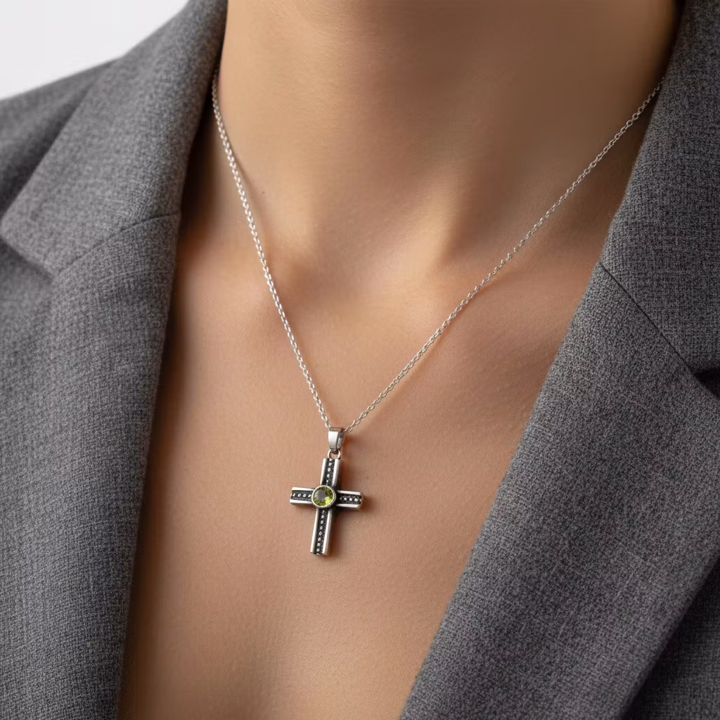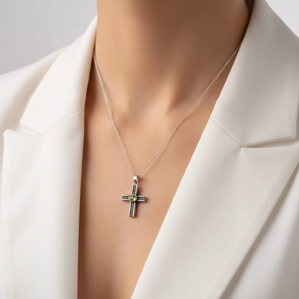 Äkta silverhalsband med kors och liten oval peridot sten. Handgjort unikt korshalsband i sterling silver med detaljrikt kors i antik silver finish och grön fasettslipad peridot. Halsbandet har en ärtlänkskedja i ljust silver med ett lätt oxiderat kors. Korset är ca 5,6mm brett och ca 35mm långt. Designat kors halsband med månadssten augusti. Polerduk medföljer.