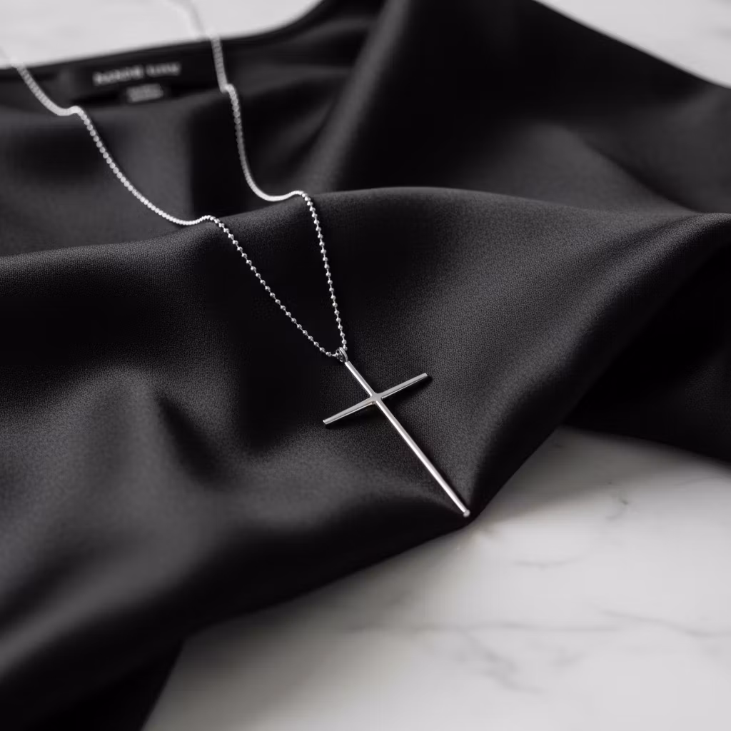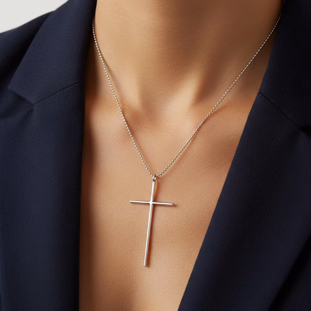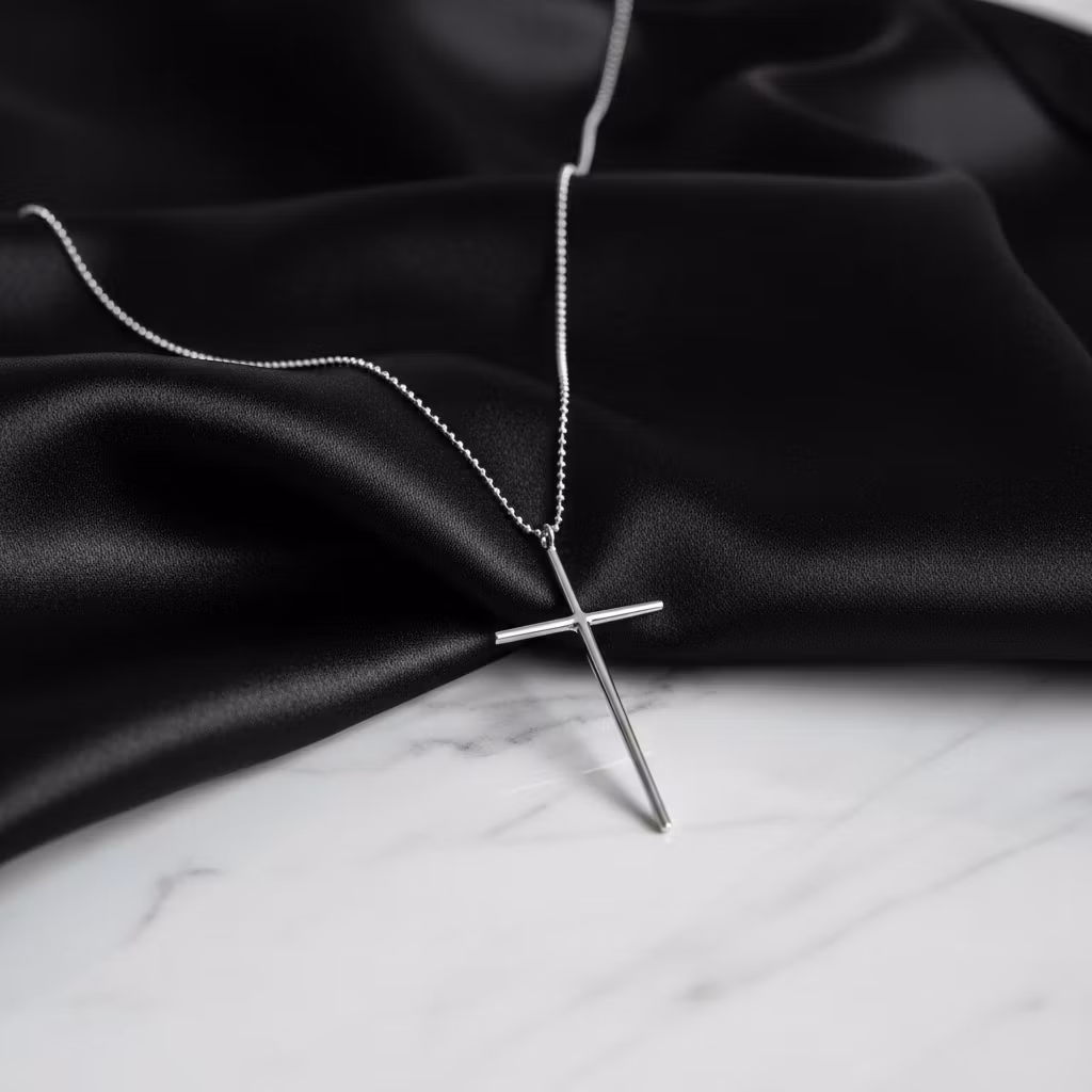 Äkta silverhalsband med långt smalt kors och fasettslipad kulkedja. Korset är ca 6,5cm långt med slät yta. Stilrent och elegant korshalsband i ljust skinande blankt silver. Symbolhalsband med långt kors. Polerduk medföljer.