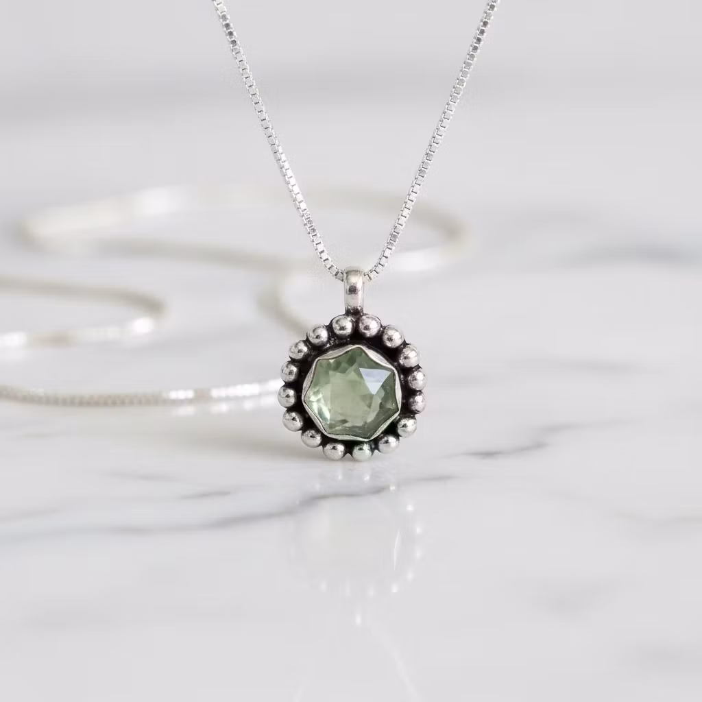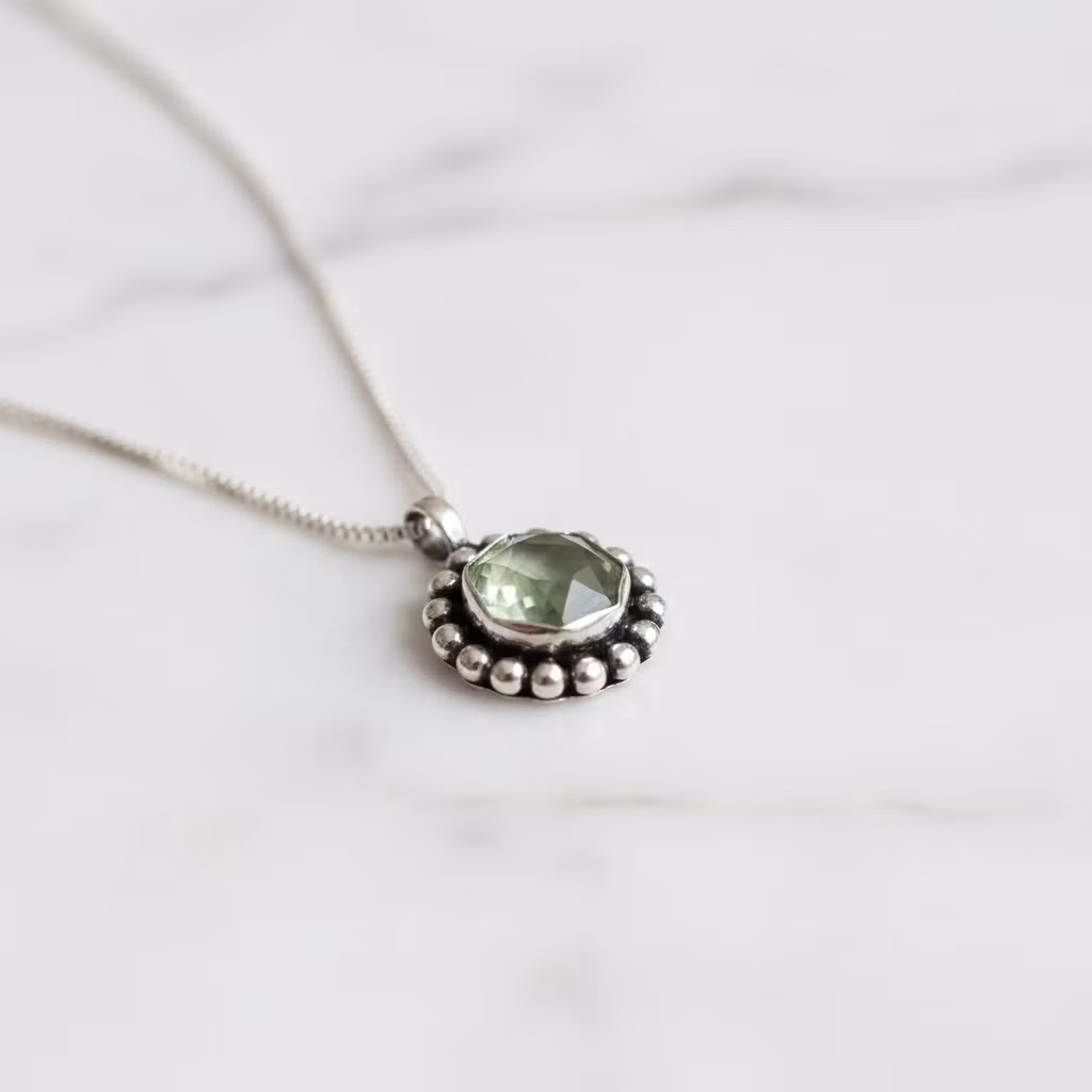 Silverhalsband med mintgrön rund fasettslipad kalcedon sten med små dekorativa silverkulor runt stenen. Stenen är 8mm och hängets totala längd är 15mm långt. Halsband i äkta silver med smal fin Venezia kedja och kalcedonsten. Polerduk medföljer.