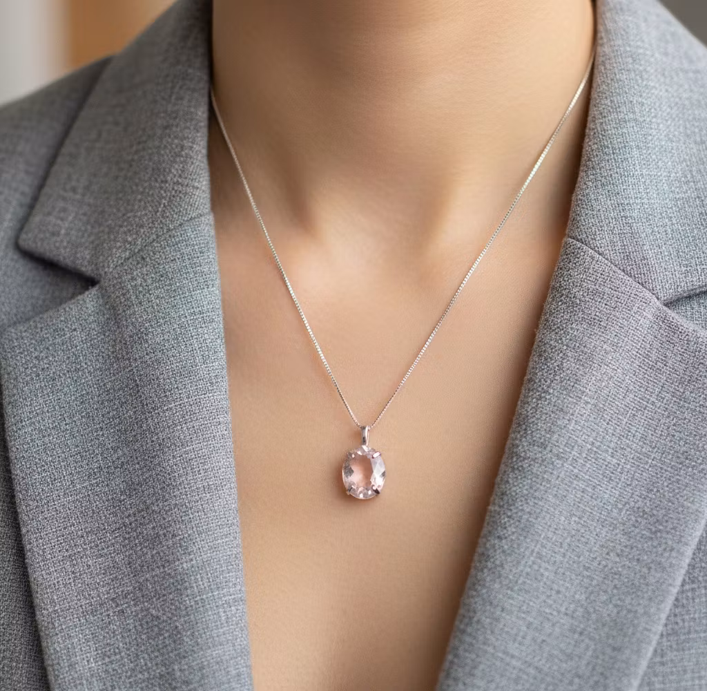 Silverhalsband med oval fasettslipad rosenkvarts sten i klofattning. Halsbandet är tillverkat i äkta silver med äkta naturlig rosenkvartskristall. Rosenkvartsen har en fasettslipad yta och är lite opak i färgen. Hänget är ca 19mm långt. Månadsstenshalsband oktober. Det fina rosenkvarts halsbandet är en perfekt gåva åt den du håller kär. Rosenkvarts symboliserar kärlek, medkänsla och kvinnlighet.