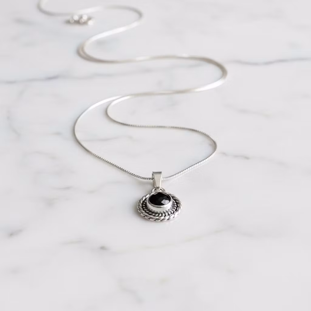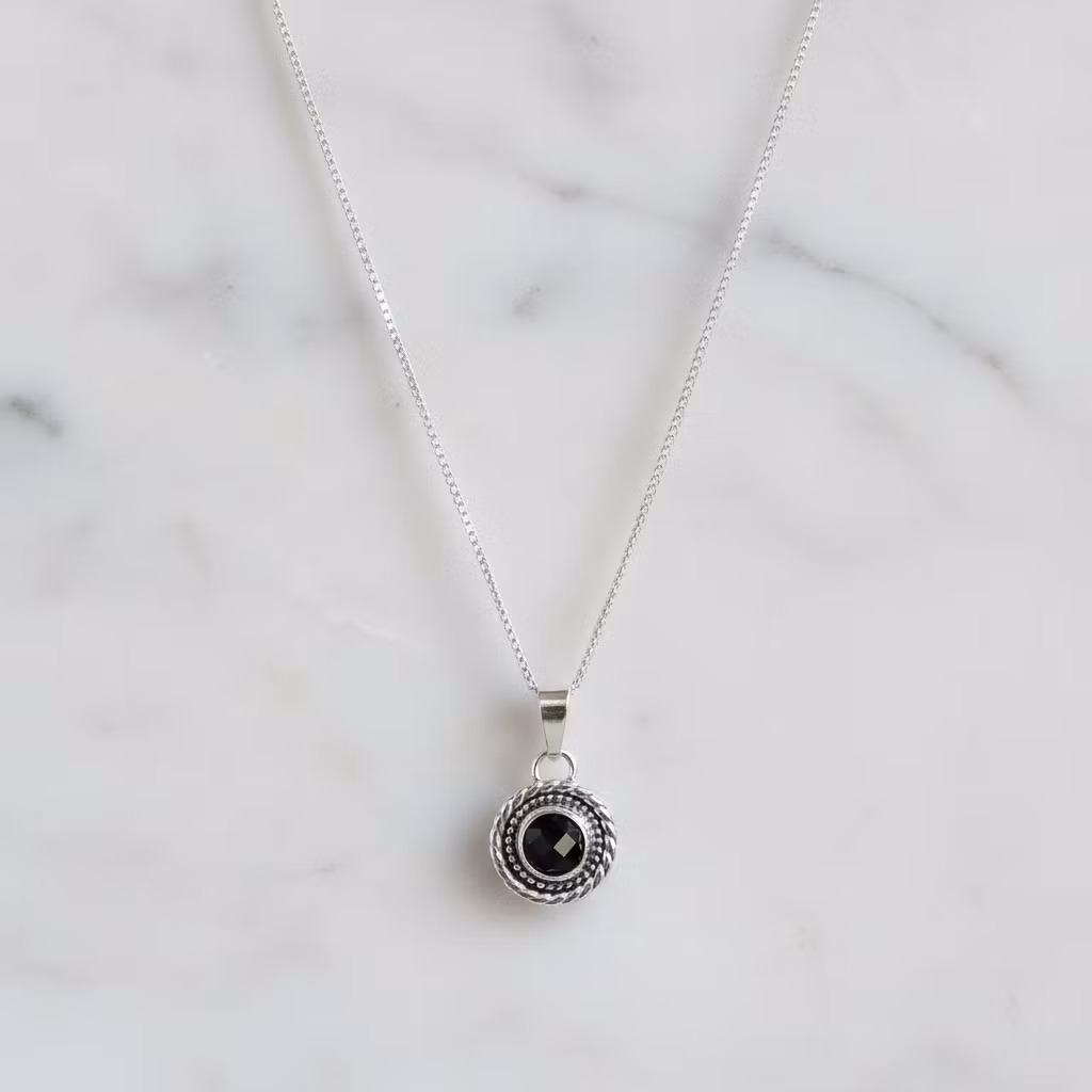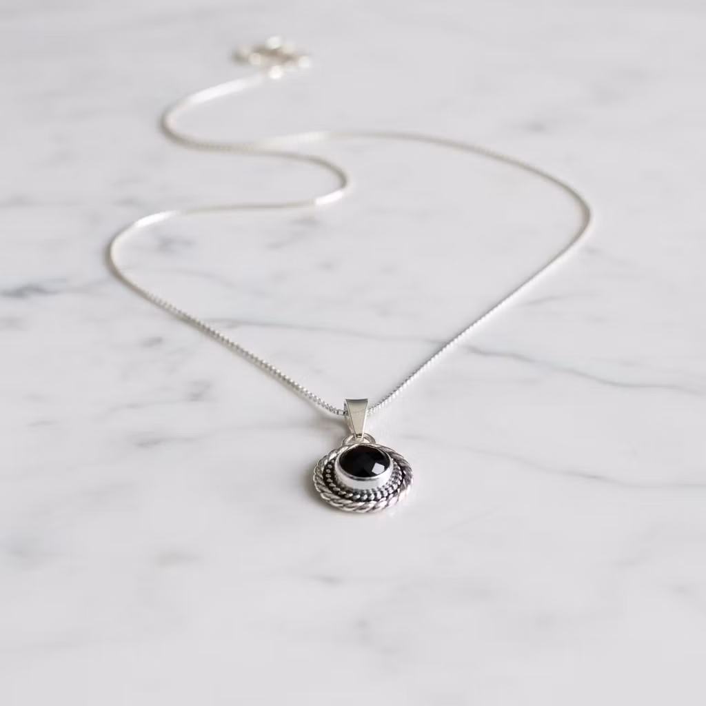 Elegant silverhalsband med svart slipad onyx sten med stilrena fina detaljer runt stenen. Den runda stenen är 8mm och hänget är totalt 23mm långt. Halsbandet finns i ett exklusivt exemplar. Sterling silver halsband med svart glänsande fin ädelsten. Polerduk medföljer.