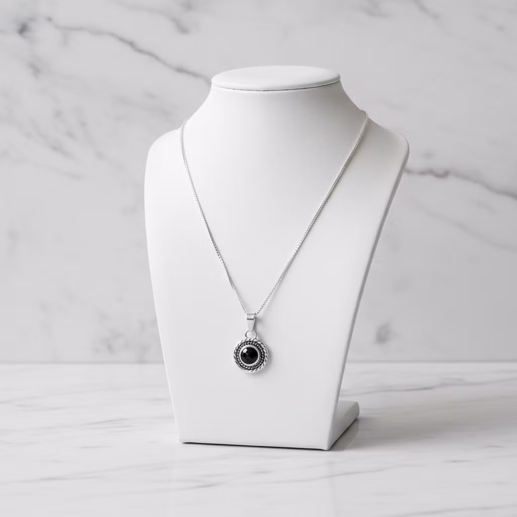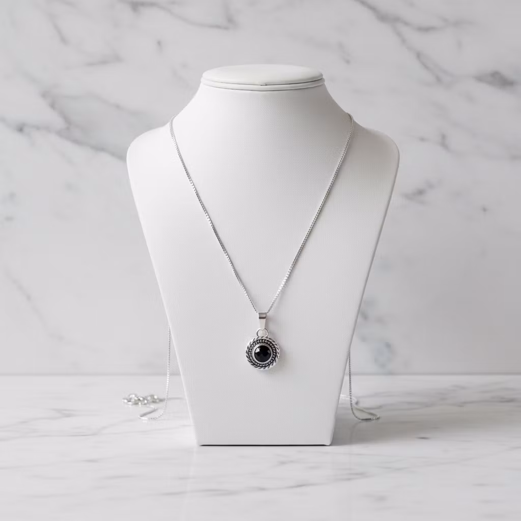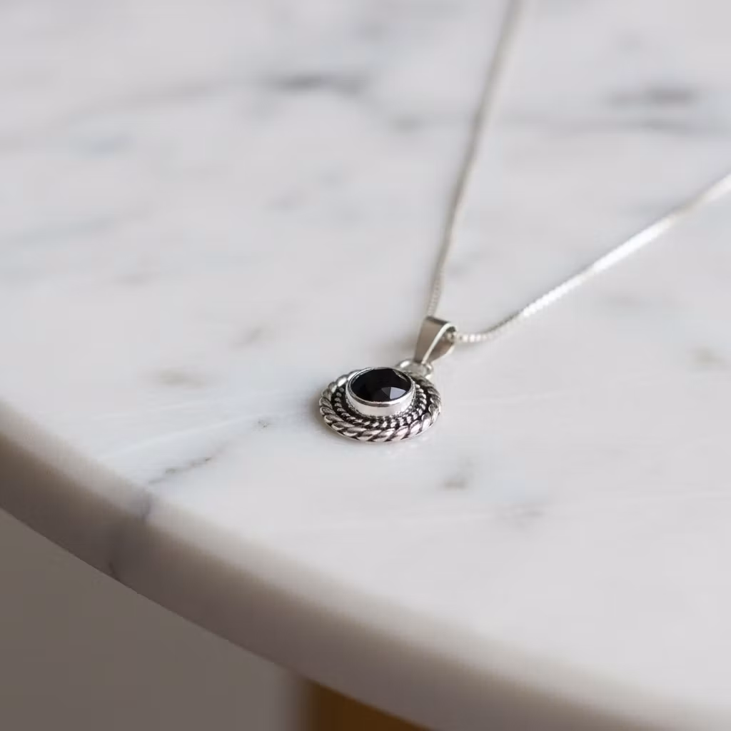 Elegant silverhalsband med svart slipad onyx sten med stilrena fina detaljer runt stenen. Den runda stenen är 8mm och hänget är totalt 23mm långt. Halsbandet finns i ett exklusivt exemplar. Sterling silver halsband med svart glänsande fin ädelsten. Polerduk medföljer.