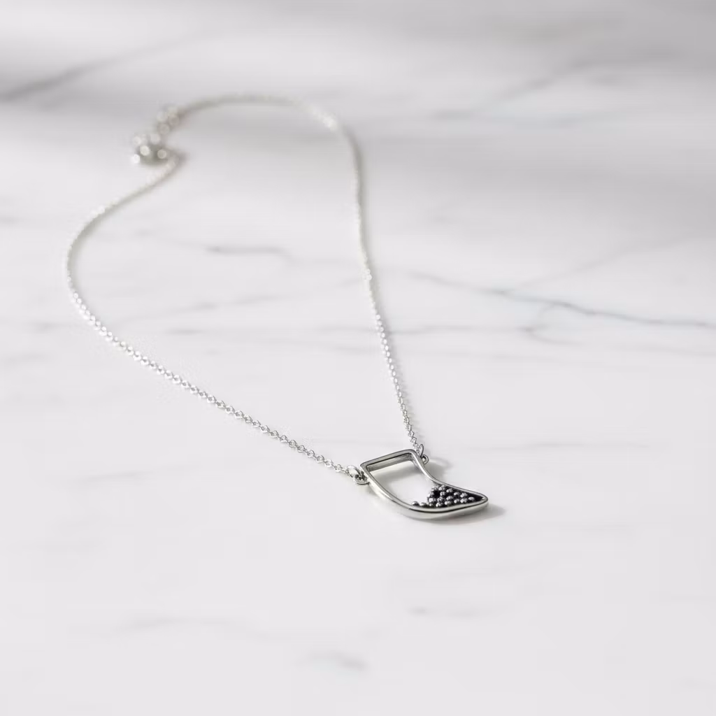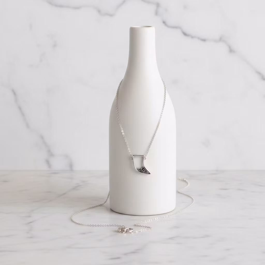 Äkta silverhalsband med kedja och tand hänge. Halsbandet är tillverkat i sterling silver med ca 25mm lång tand utsmyckat med små silverkulor. Unikt och modernt silhuett halsband med dekorativt hänge. Polerduk medföljer.