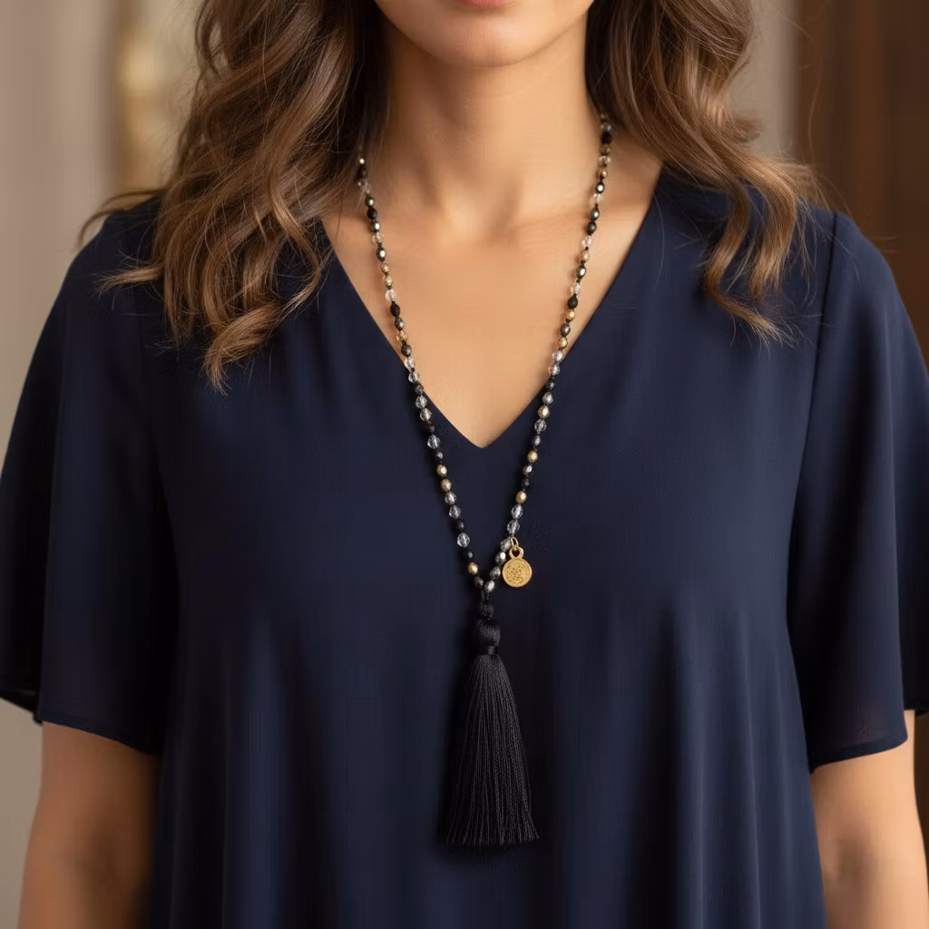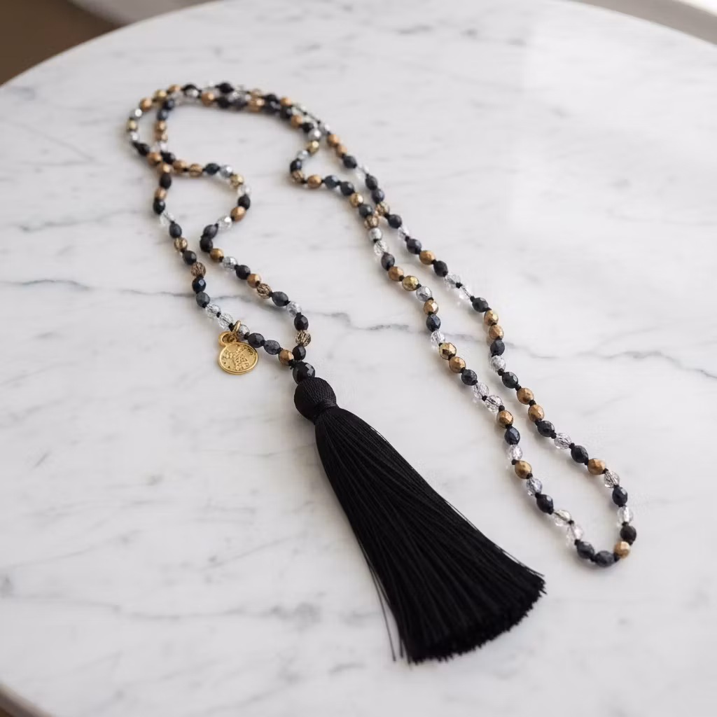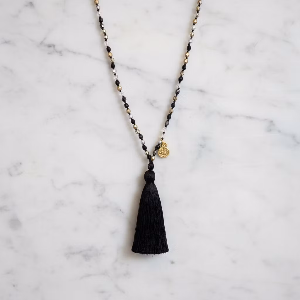 Långt handknutet pärlhalsband med 4mm fasettslipade Tjeckiska glaspärlor i en mix av färgerna svart, guld, transparent och silver, med lång svart silkes tofs och berlock. Smalt pärlhalsband med fina slipade pärlor och guldförgylld berlock. Halsbandet passar fint för alla tillfällen.