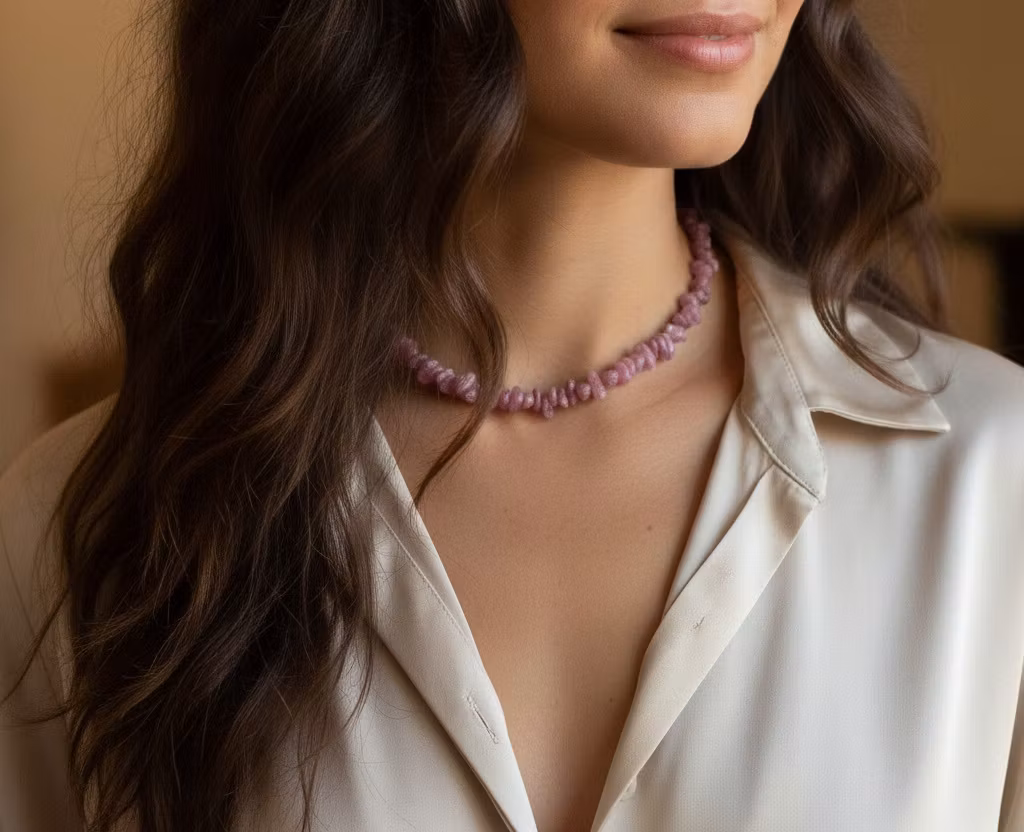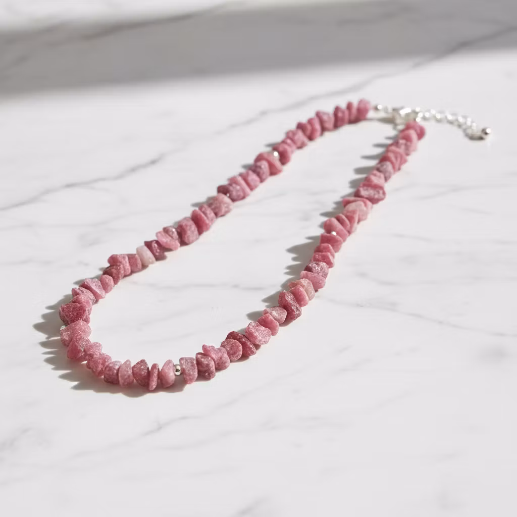 Kort rå turmalin halsband i äkta silver med rosa råa ädelstenar. Halsband med naturliga turmalinstenar i olika rosa nyanser med två små fasettslipade silverkulor på sidorna av halsbandet. Halsbandet har en förlängningskedja med liten berlock. Månadsstenshalsband oktober. Det rosa turmalin halsbandet är perfekt för dig som älskar råa och grova ädelstenar i djärv stil. Med dom råa ädelstenarna bär du med dig av turmalinens kristallenergi.