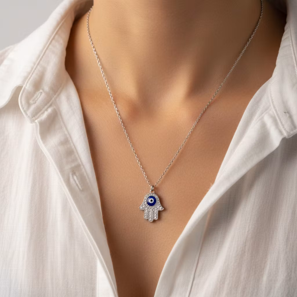 Silverpläterat halsband med Fatimas hand hänge av strass med blå pärla i form av ett öga. Handsymbolen anses vara beskyddande för bäraren. Hänget är 3cm långt. Fatimas hand kallas även för hamsa hand. Fint halsband med hängsmycke som står för skydd, lycka och tur.