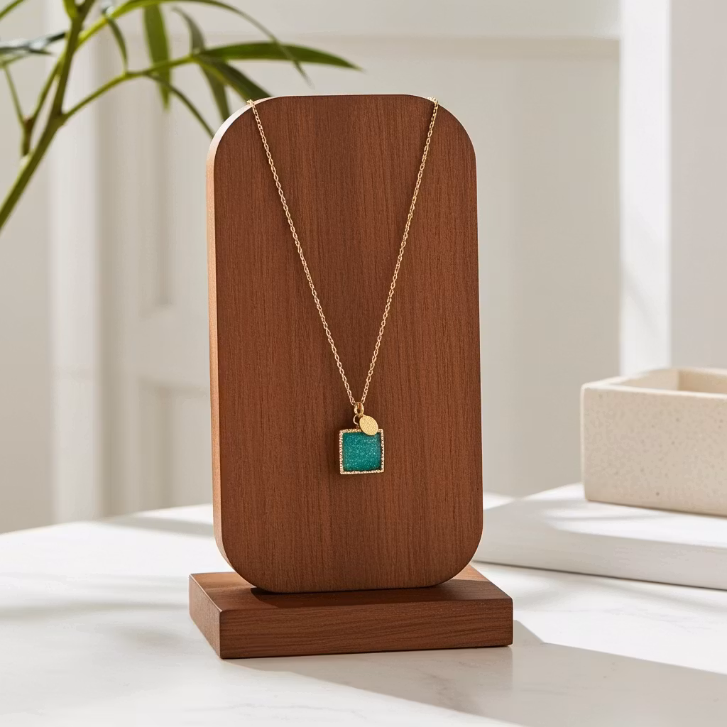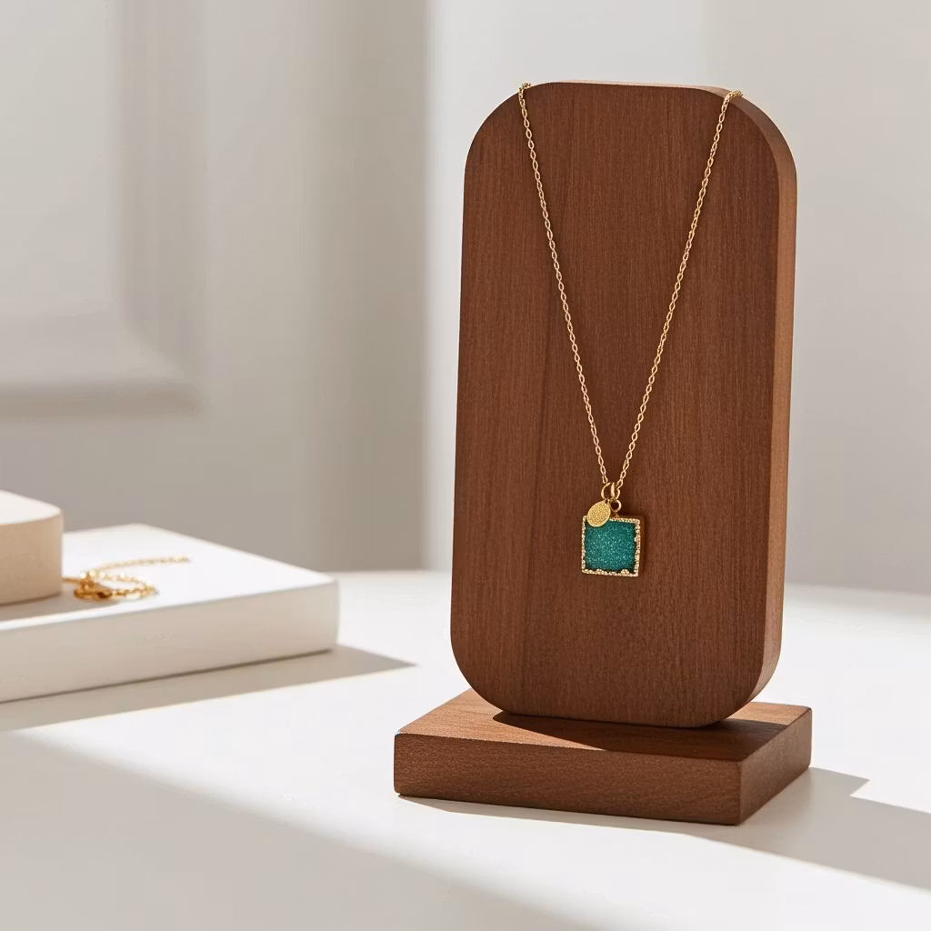 Guldförgyllt halsband med ärtlänkskedja i matt guldförgyllning och grön fyrkantig druzy agat sten med liten rund berlock. Stenen är 20mm i diameter. Agatstenen har en elektroplätering runt kanten. Kedjan och berlocken är i matt guld. Fint halsband med fyrkantig grön ädelsten.
