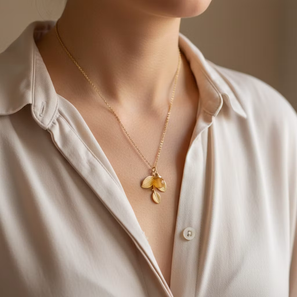 Guldförgyllt halsband med ärtlänkskedja och gul fasettslipad Kalcedon droppe lindad i guldtråd. Halsbandet är förgyllt i matt guld. Vackert halsband med olika hängsmycken. Gult kalcedon halsband, perfekt för en vacker och glamourös stil.