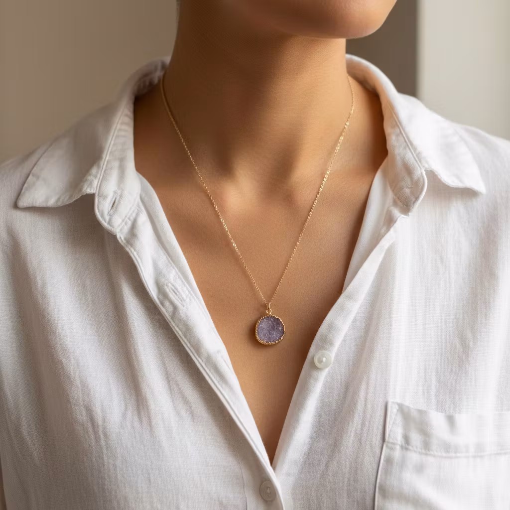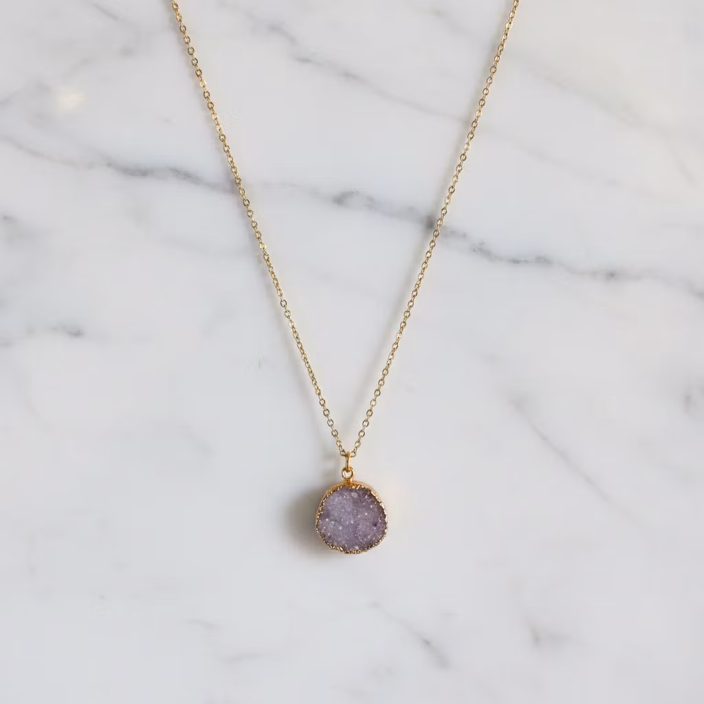 Guldpläterat halsband med fin ankarkedja och grå rund Druzy agat sten. Stenen har en elektroplätering av guldplätering runt kanten. Stenen är 20mm i diameter och har en glittrande kristalleffekt.